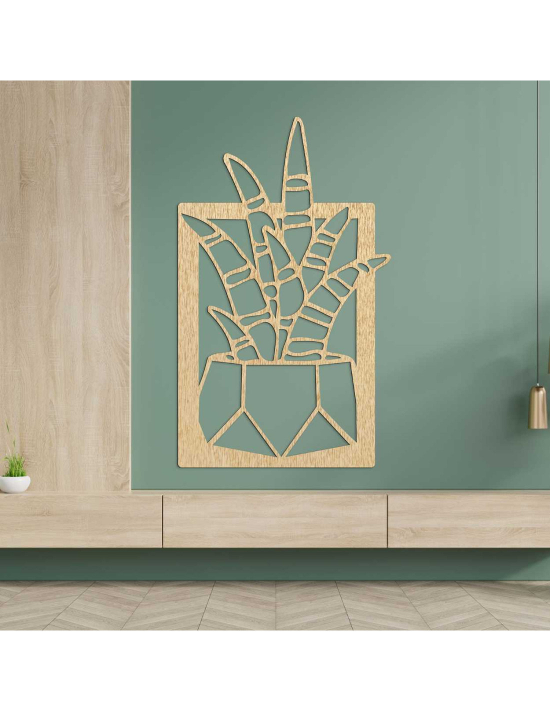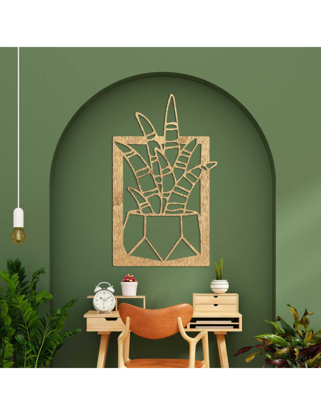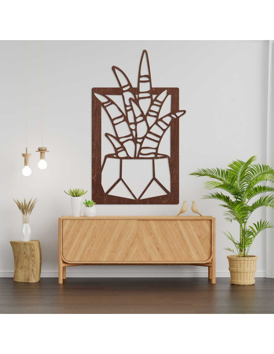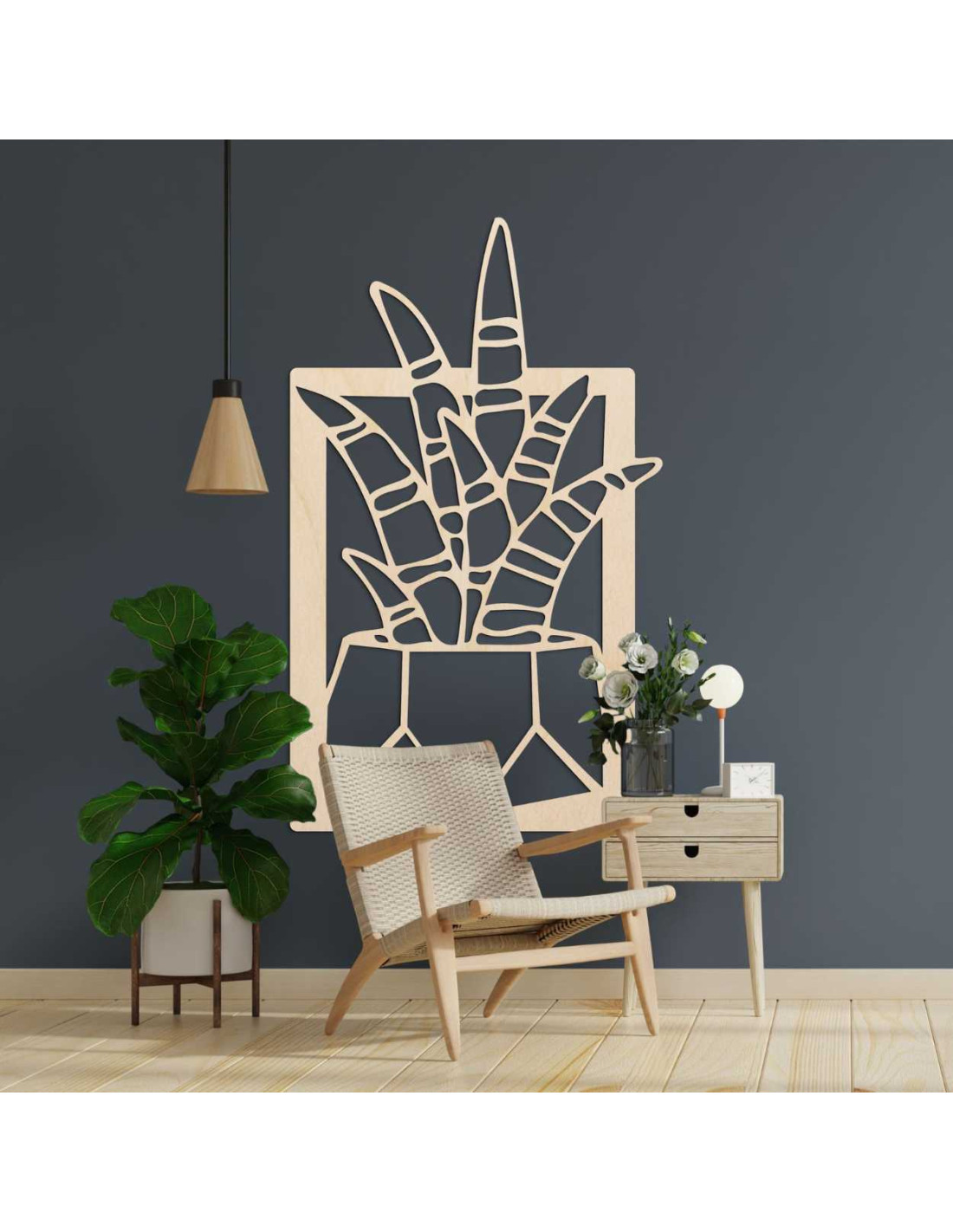 Precízne vyrezávané línie zachytávajú dynamiku rastlinného motívu, pričom drevo dodáva teplo a autenticitu.