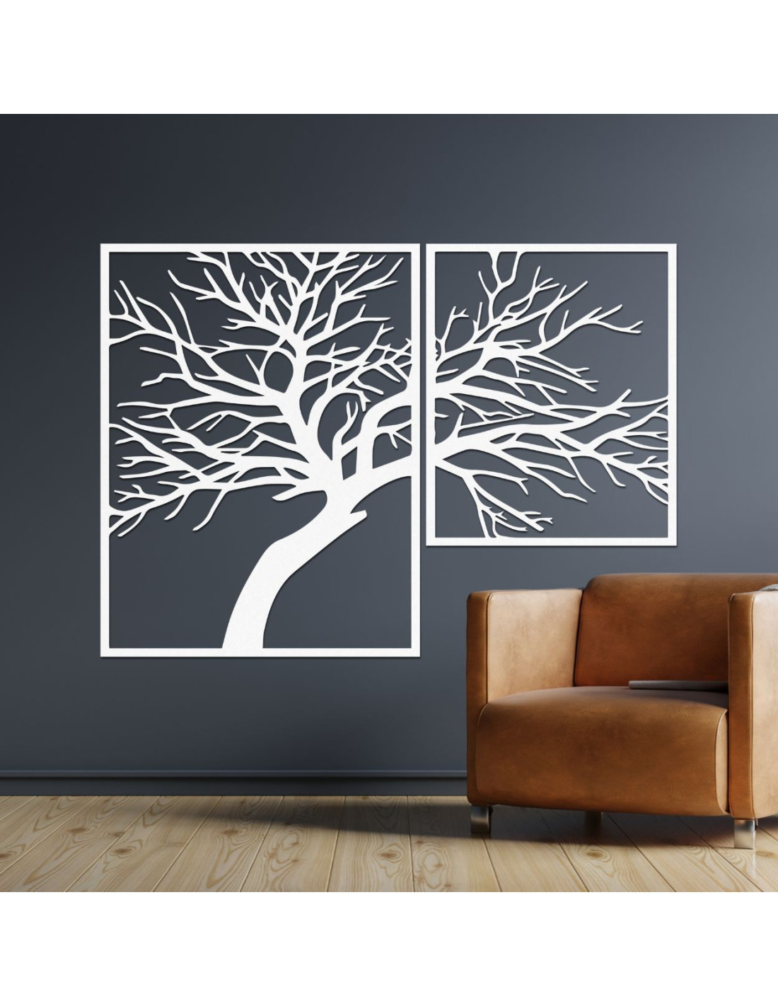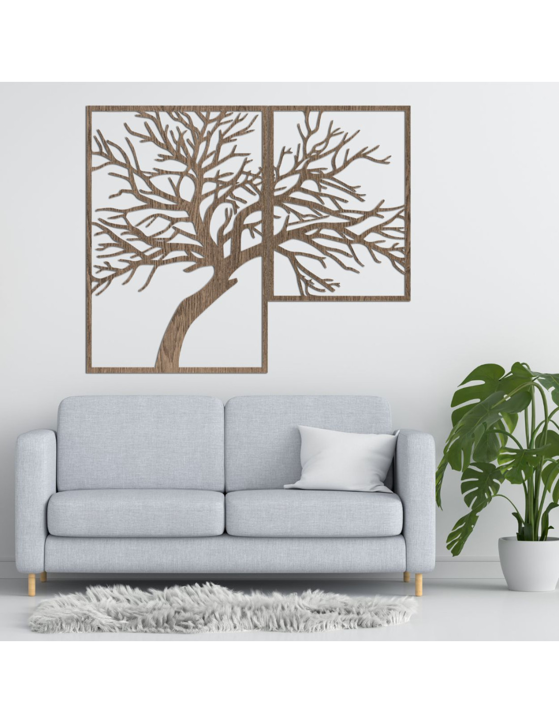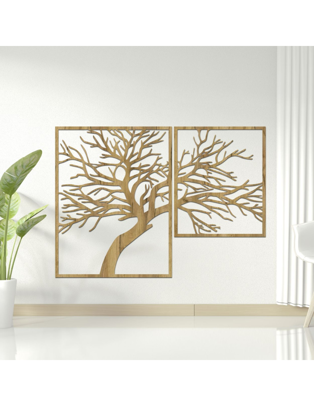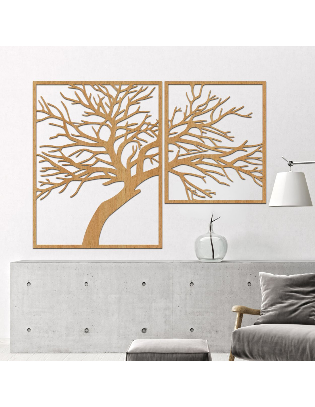 Dvojdielny obraz zobrazuje elegantný strom s detailne vyrezávanými vetvami, vytvorený v teplých drevených tónoch.