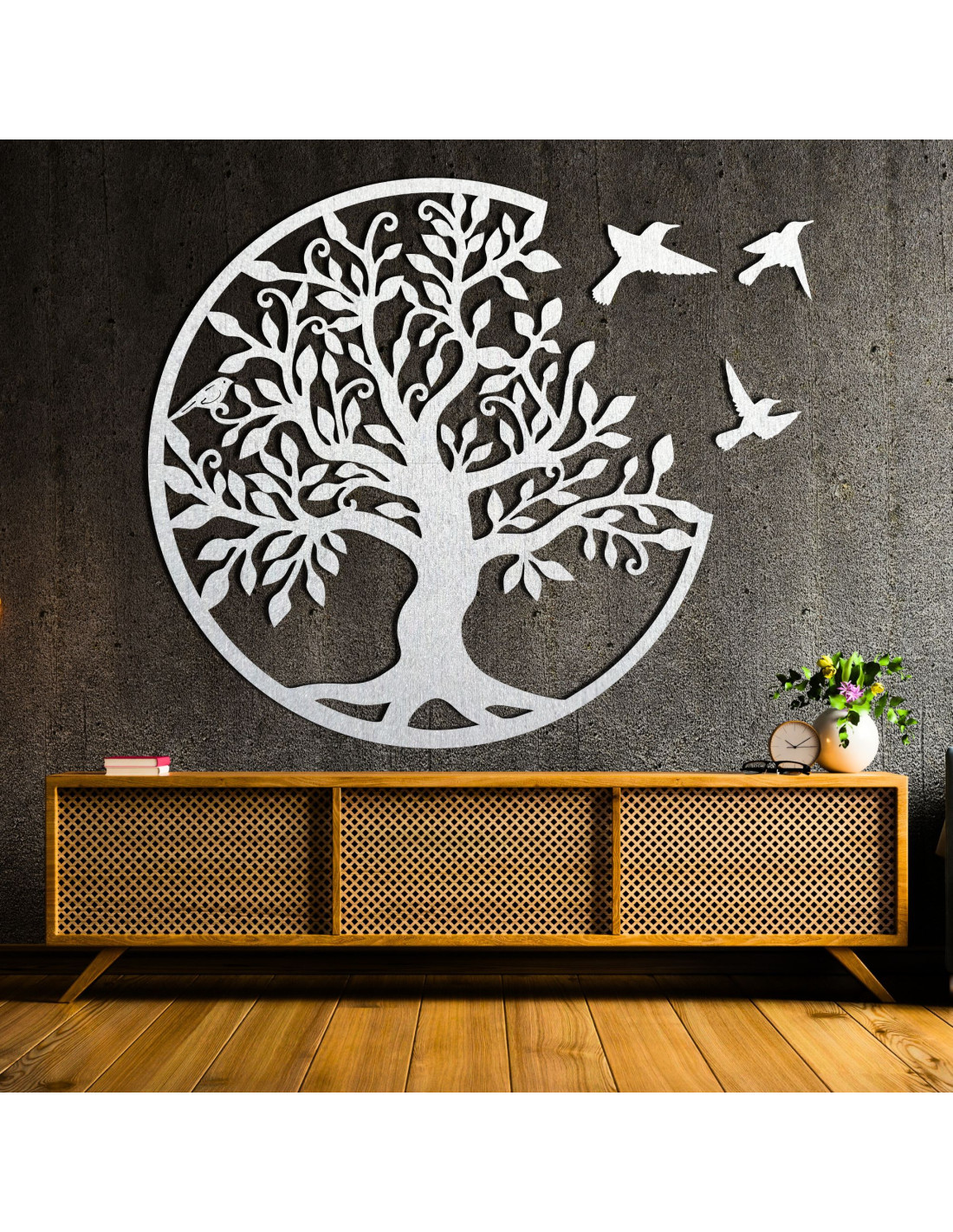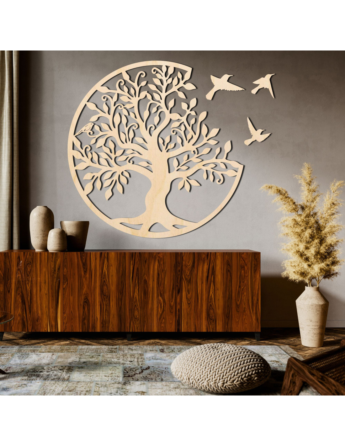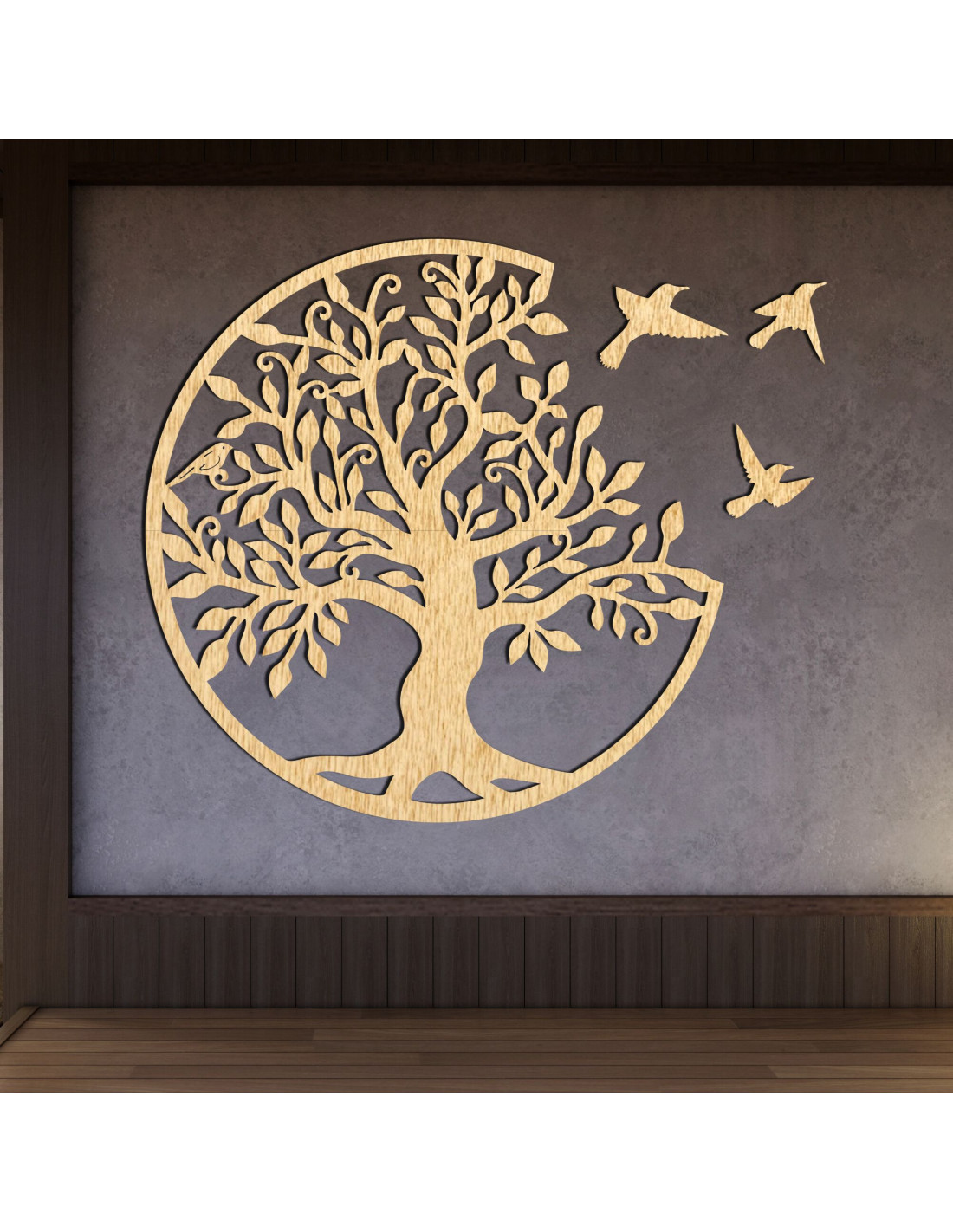 Drevený strom života s tromi vtákmi letiacimi doprava je elegantnou dekoráciou na stenu, ktorá prinesie vášmu interiéru štýl a harmóniu. Táto jedinečná dekorácia je precízne vyrezávaná laserom, aby vynikli jemné detaily, a následne ručne upravená pre dokonalý vzhľad a autenticitu.