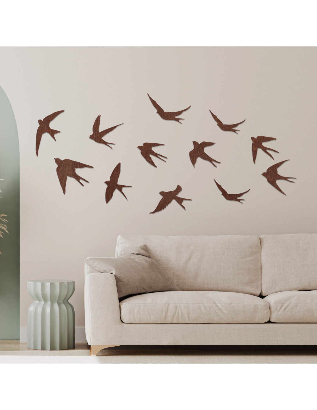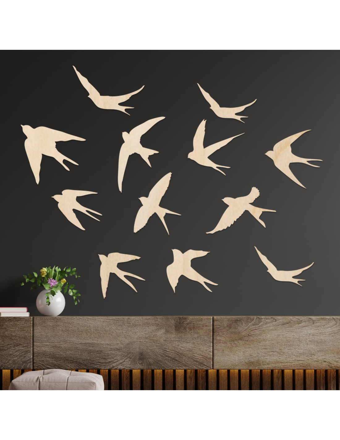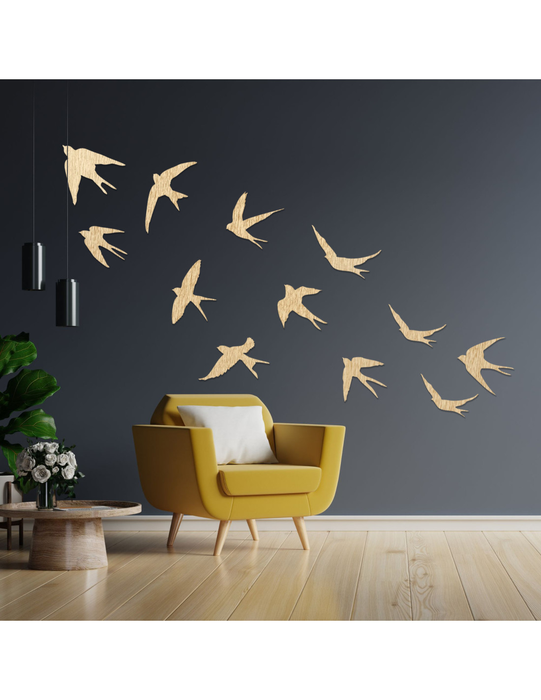 Tento dizajn predstavuje minimalistické drevené dekorácie v tvare lastovičiek v lete. Svetlé drevené siluety kontrastujú s tmavým pozadím, čím vytvárajú elegantný efekt. Pôsobí dynamicky a dodáva priestoru vzdušnosť.
