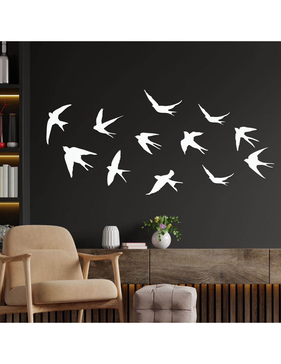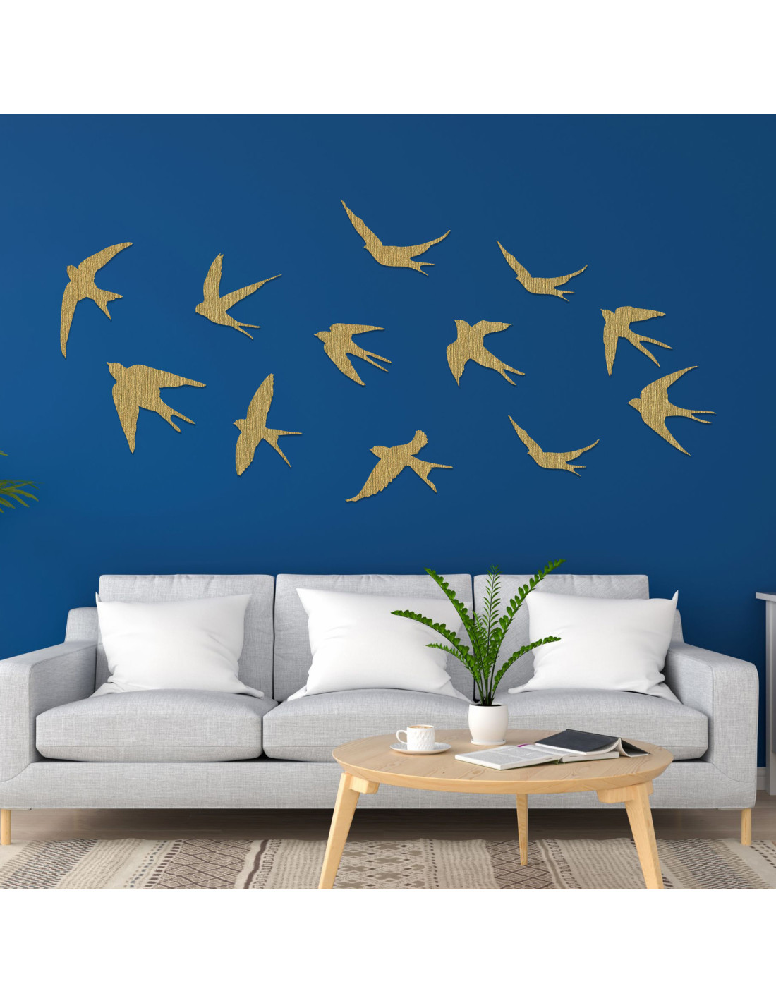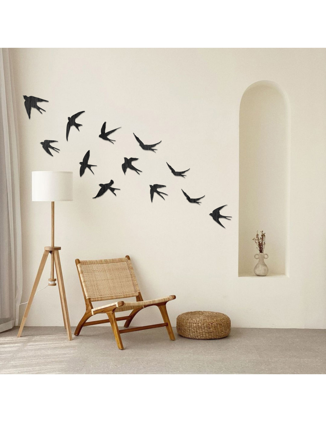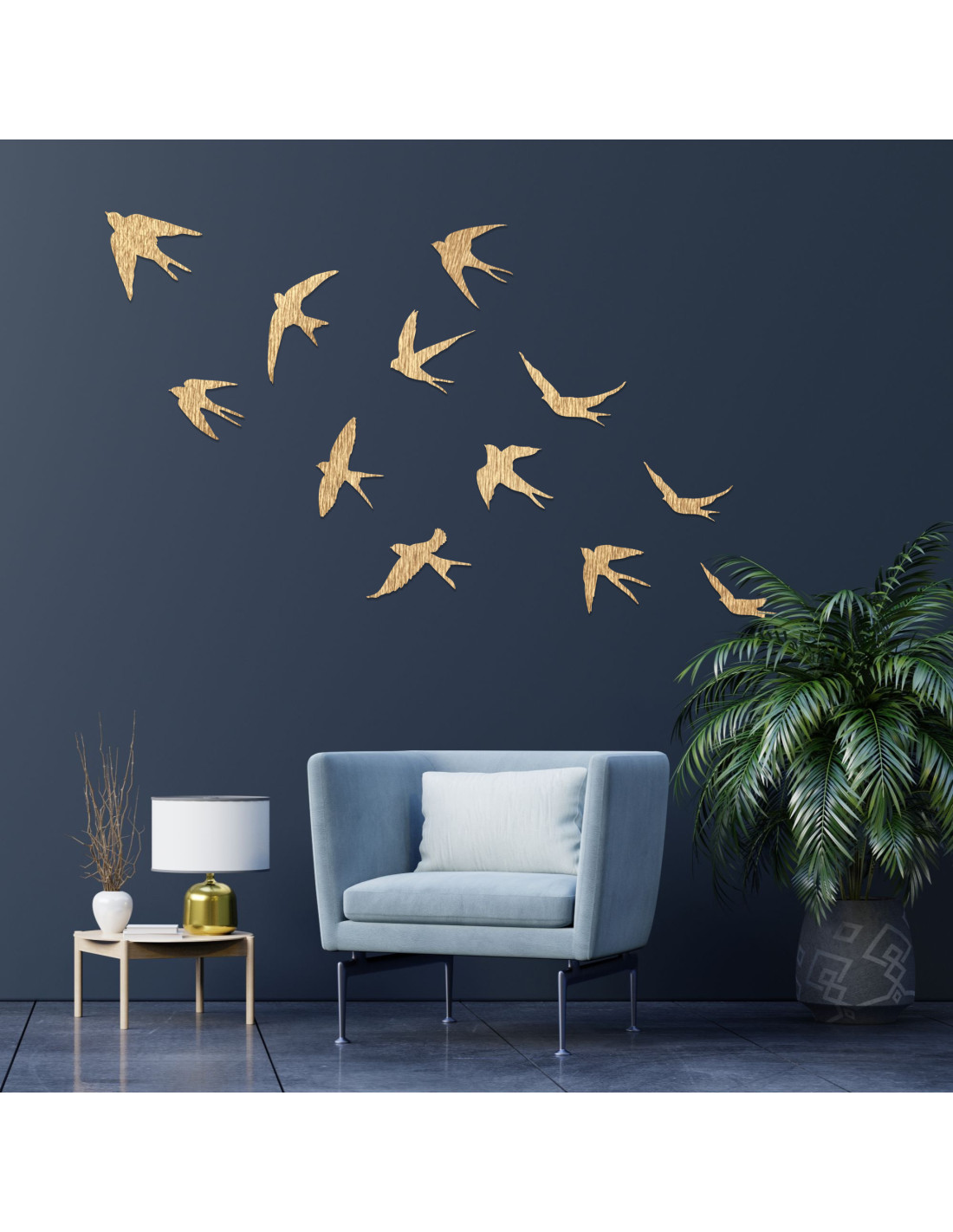Tento dizajn predstavuje minimalistické drevené dekorácie v tvare lastovičiek v lete. Svetlé drevené siluety kontrastujú s tmavým pozadím, čím vytvárajú elegantný efekt. Pôsobí dynamicky a dodáva priestoru vzdušnosť.