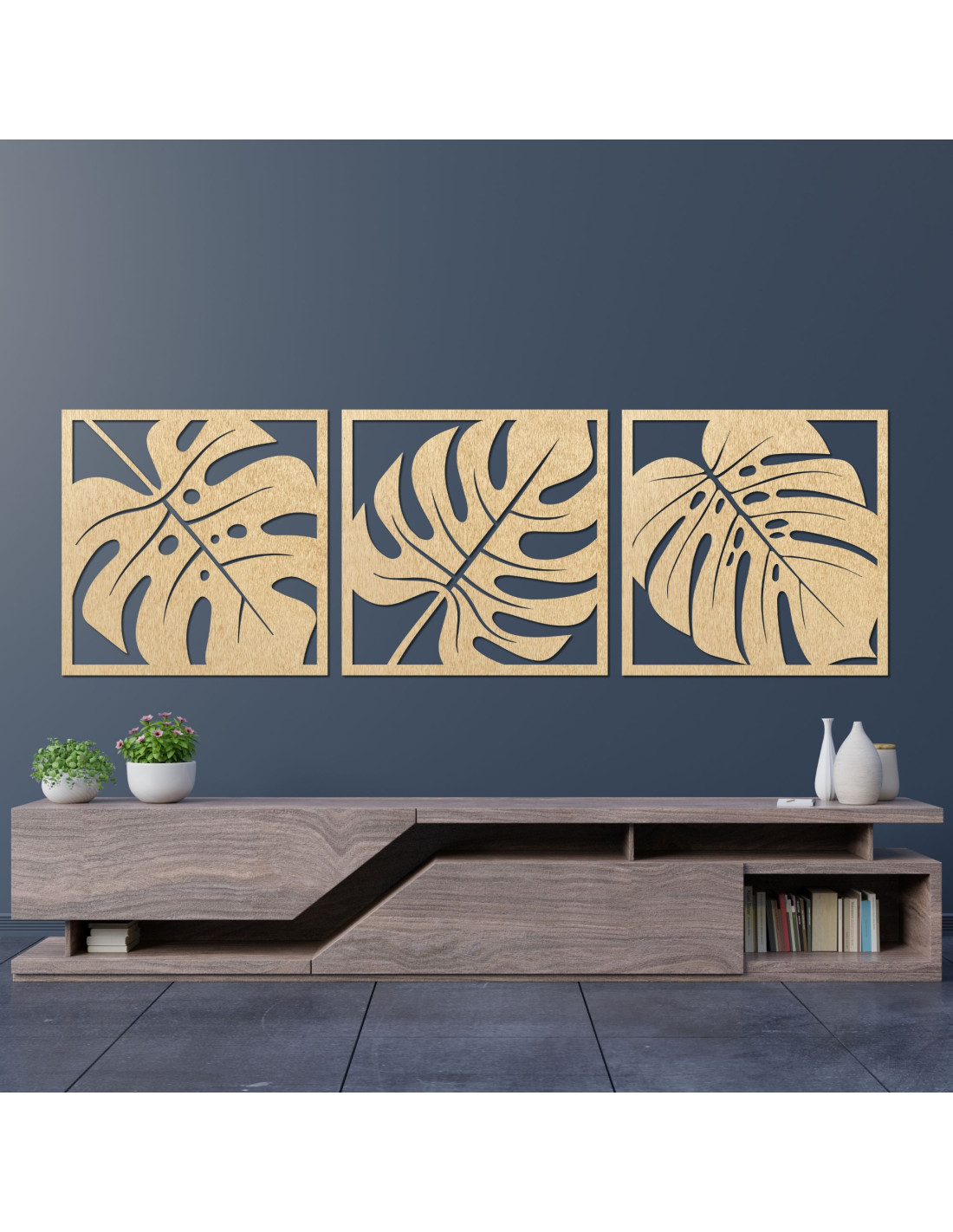 Drevený obraz Monstera – 3-dielna dekorácia na stenu
