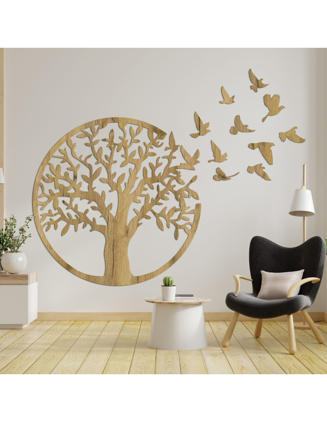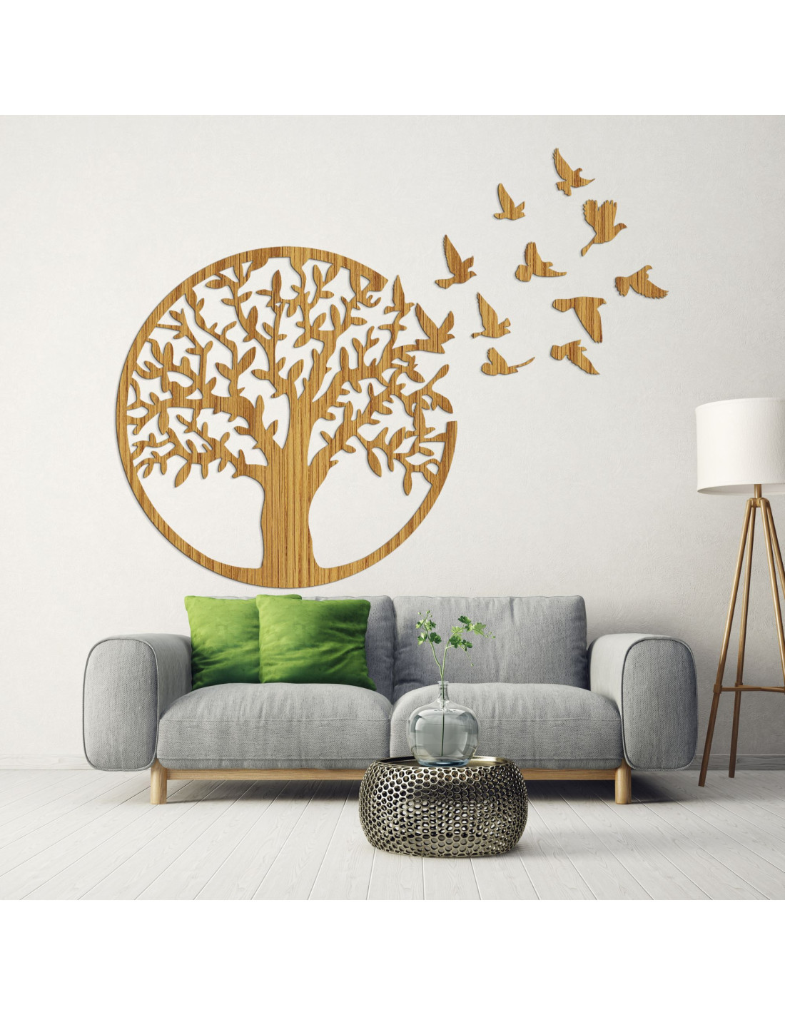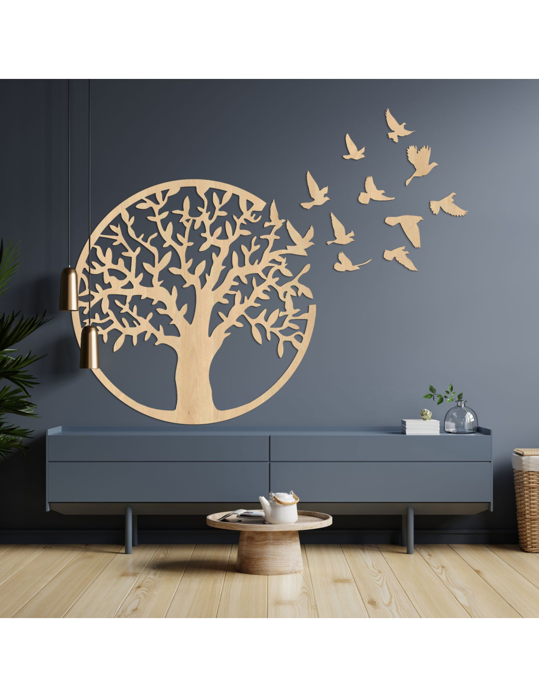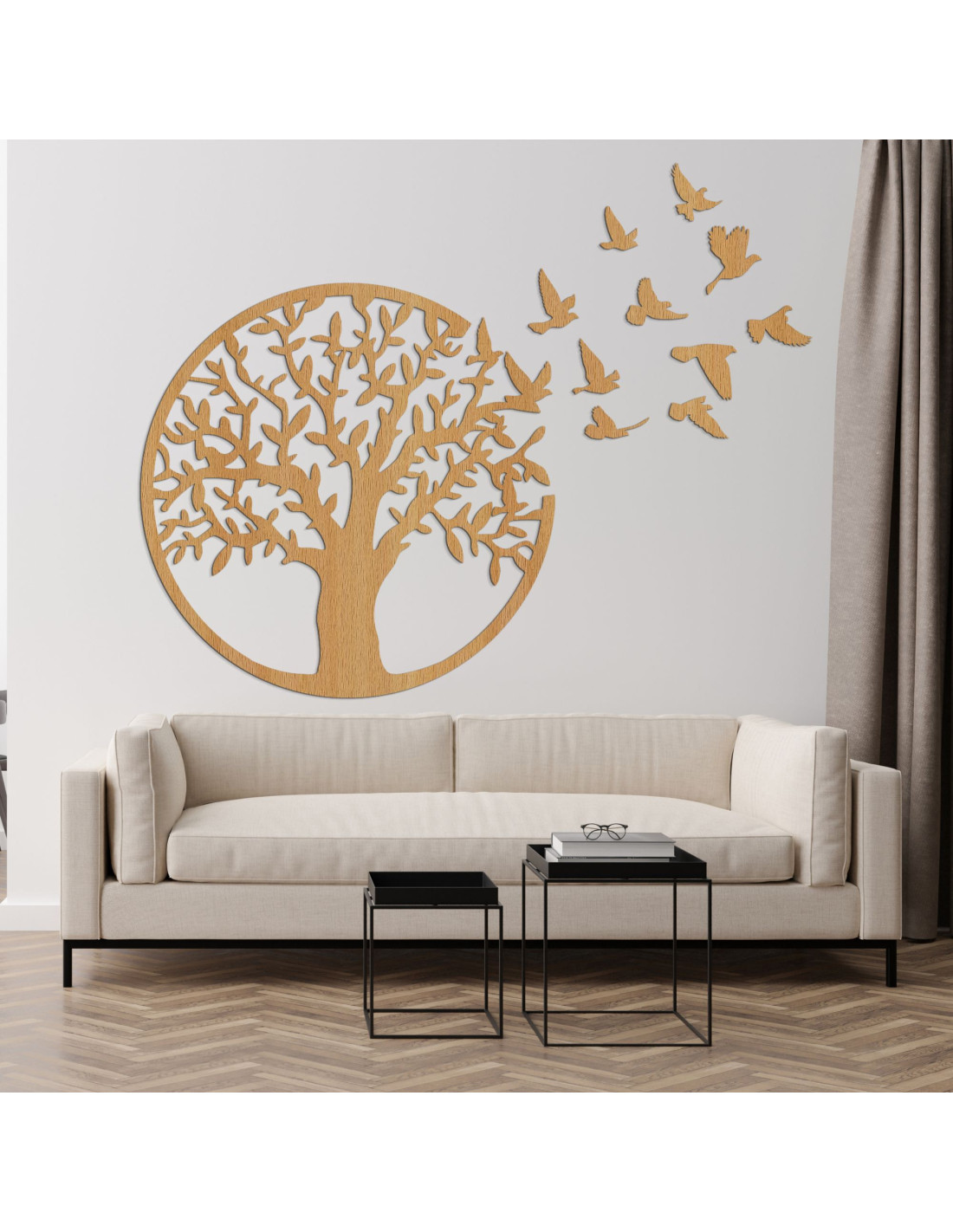 Oživte svoj interiér elegantným dreveným nástenným dekorom, ktorý zachytáva krásu stromu s vznášajúcimi sa vtákmi. Tento jedinečný kus umenia je ideálny pre tých, ktorí hľadajú moderné a prírodné akcenty vo svojich priestoroch.