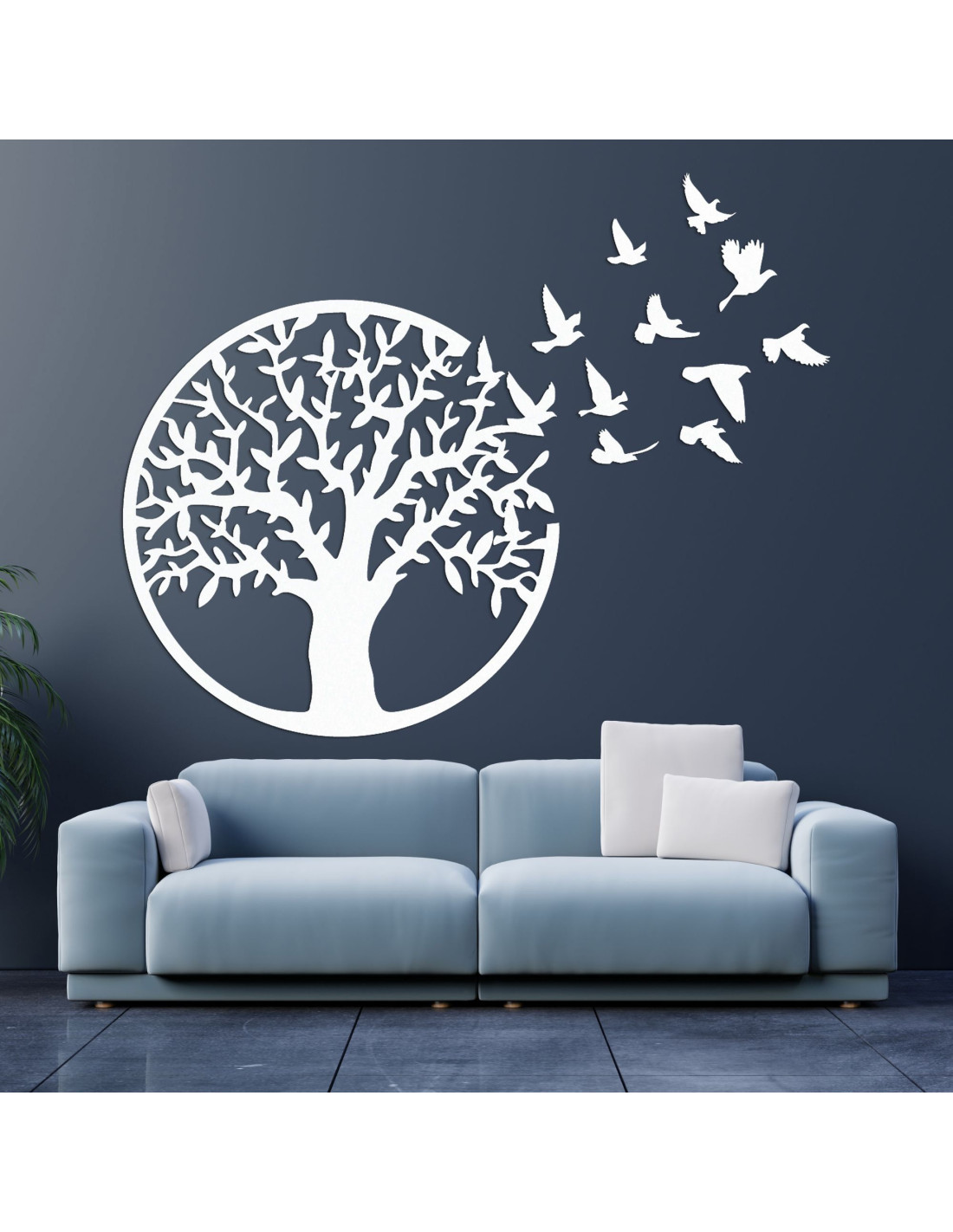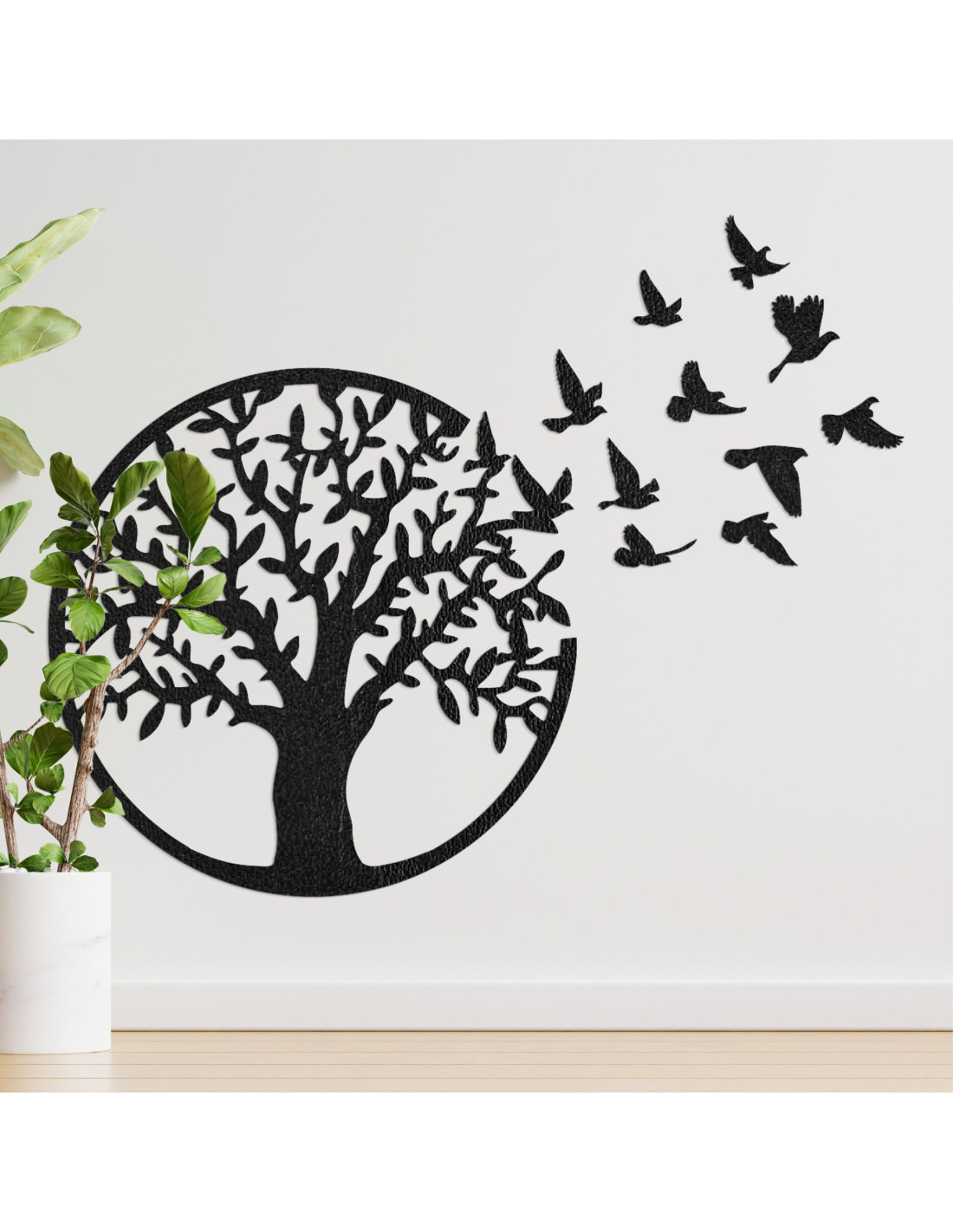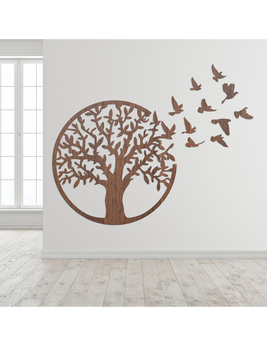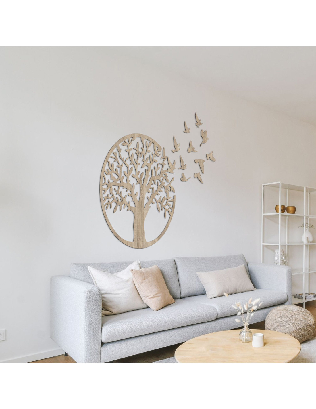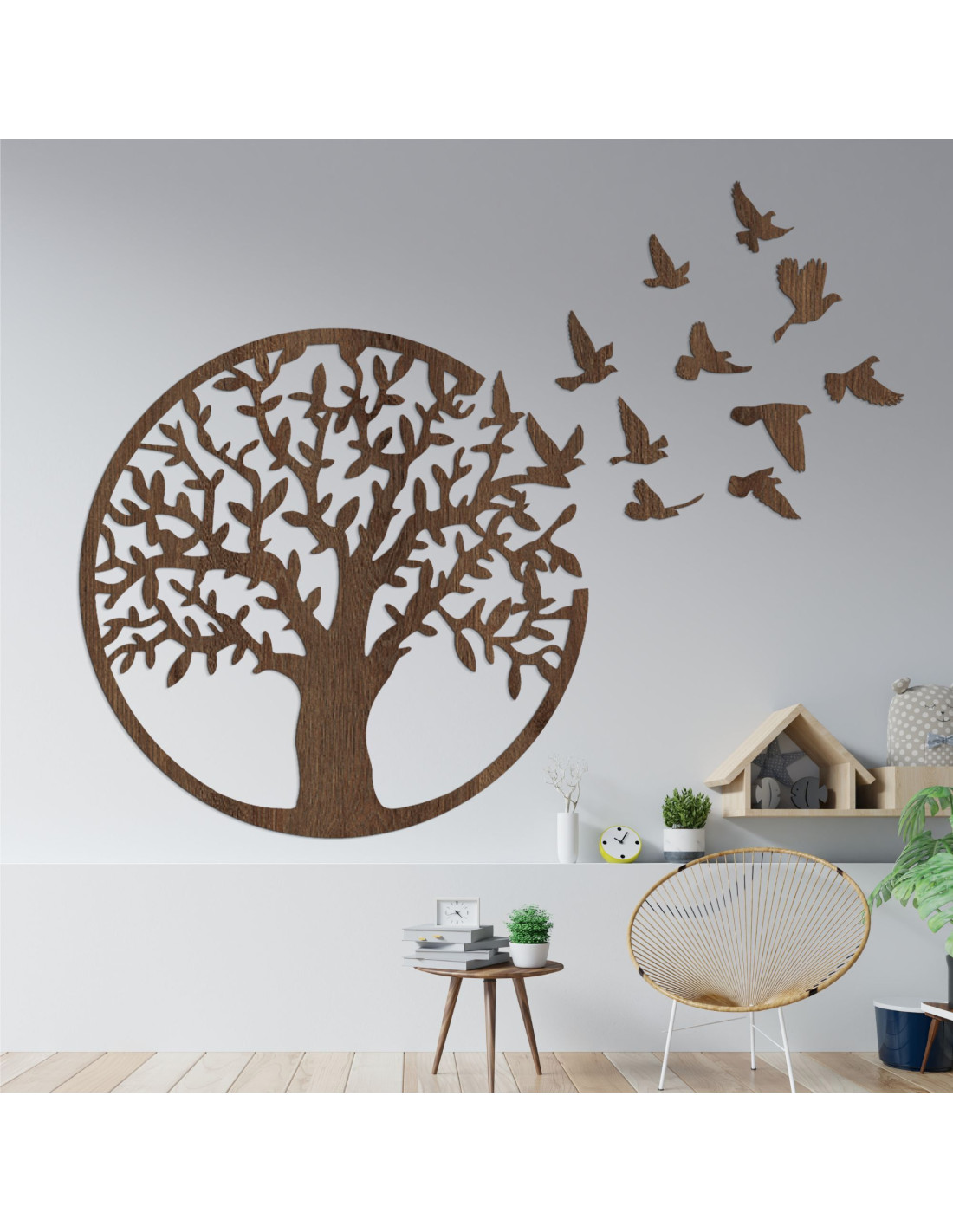Oživte svoj interiér elegantným dreveným nástenným dekorom, ktorý zachytáva krásu stromu s vznášajúcimi sa vtákmi. Tento jedinečný kus umenia je ideálny pre tých, ktorí hľadajú moderné a prírodné akcenty vo svojich priestoroch.