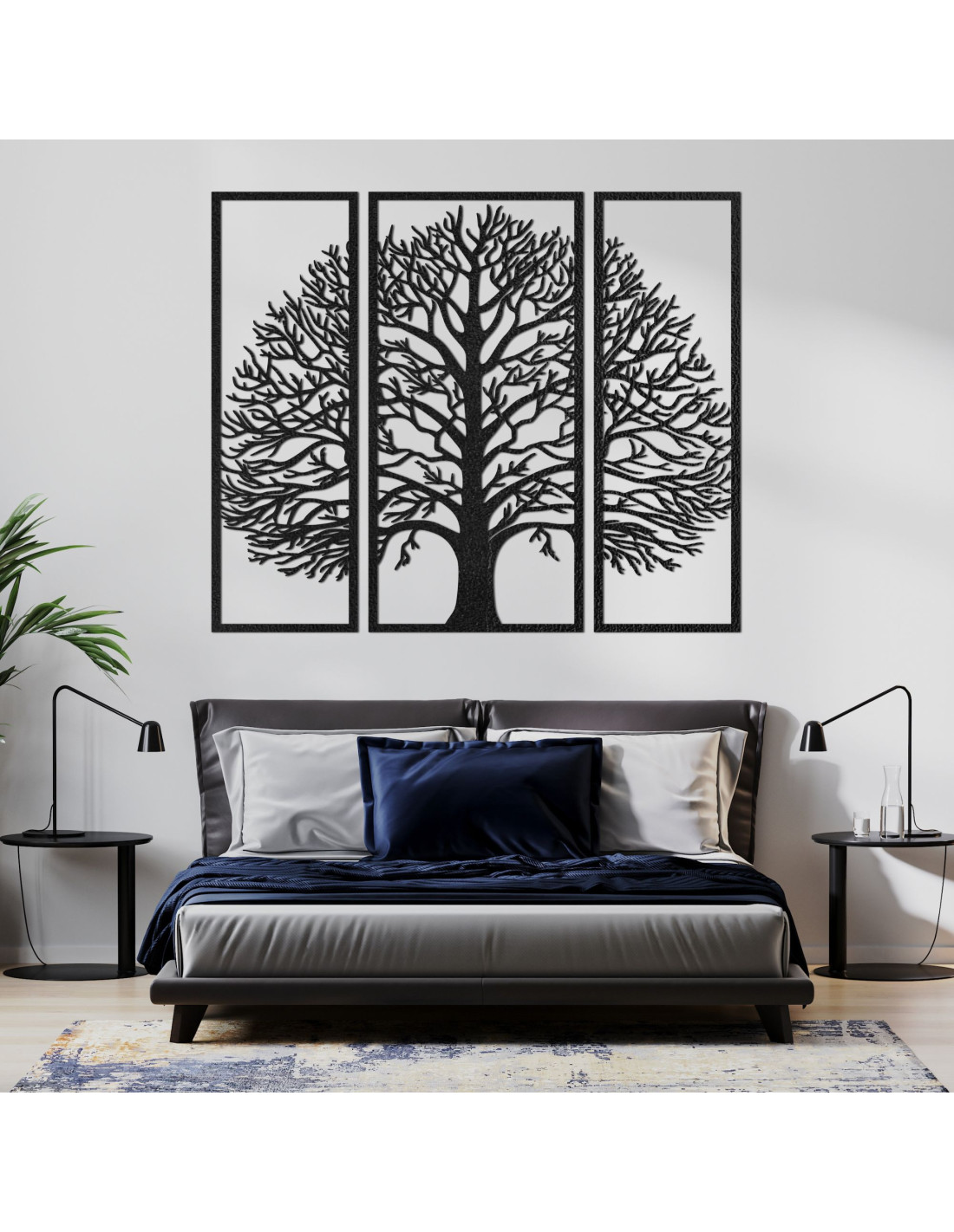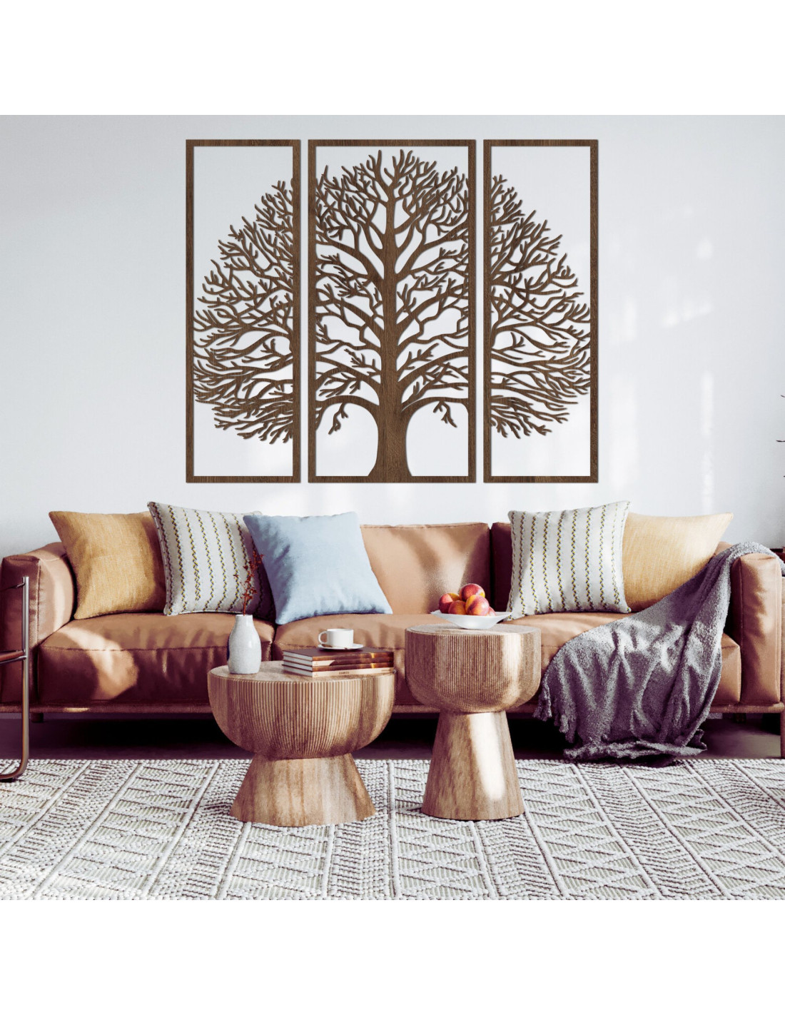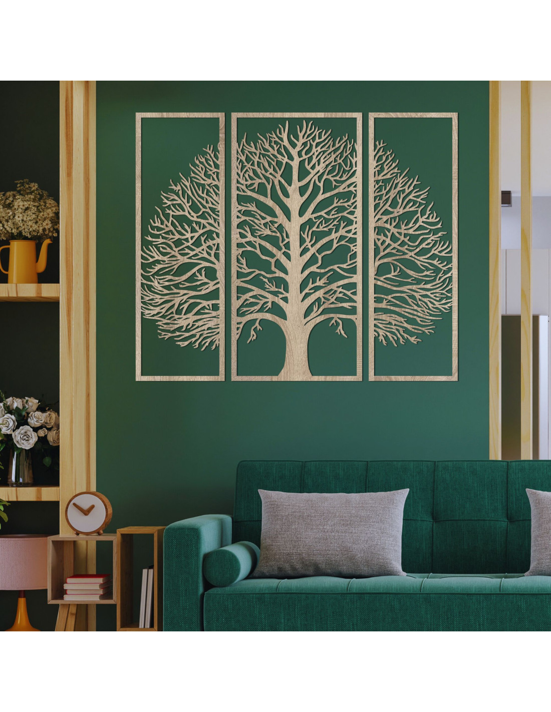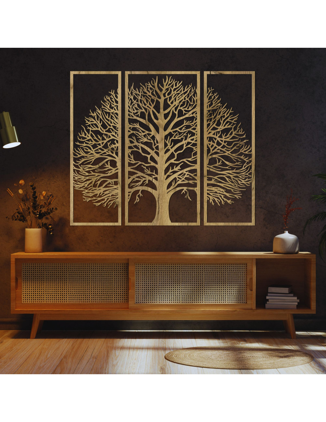 Trojdielna drevená dekorácia stromu života je elegantným a nadčasovým doplnkom, ktorý prinesie do vášho interiéru harmóniu a štýl. Jej jedinečný dizajn spája prírodnú krásu s moderným spracovaním, čím vytvára pôsobivý vizuálny efekt.