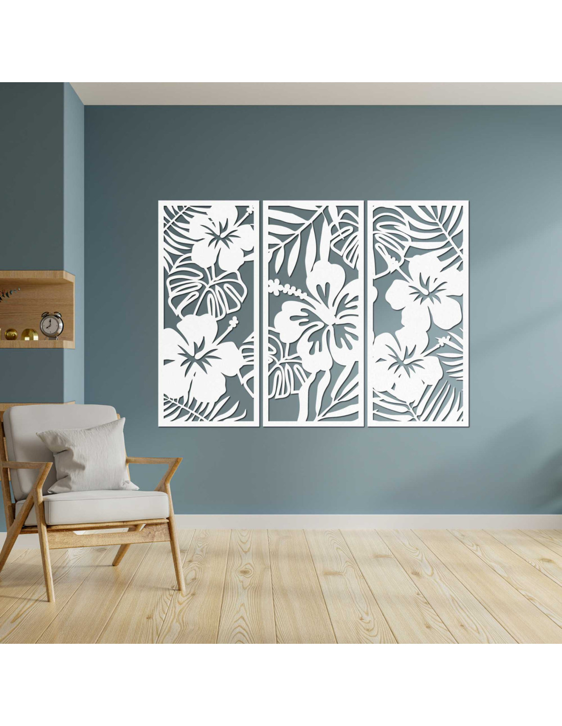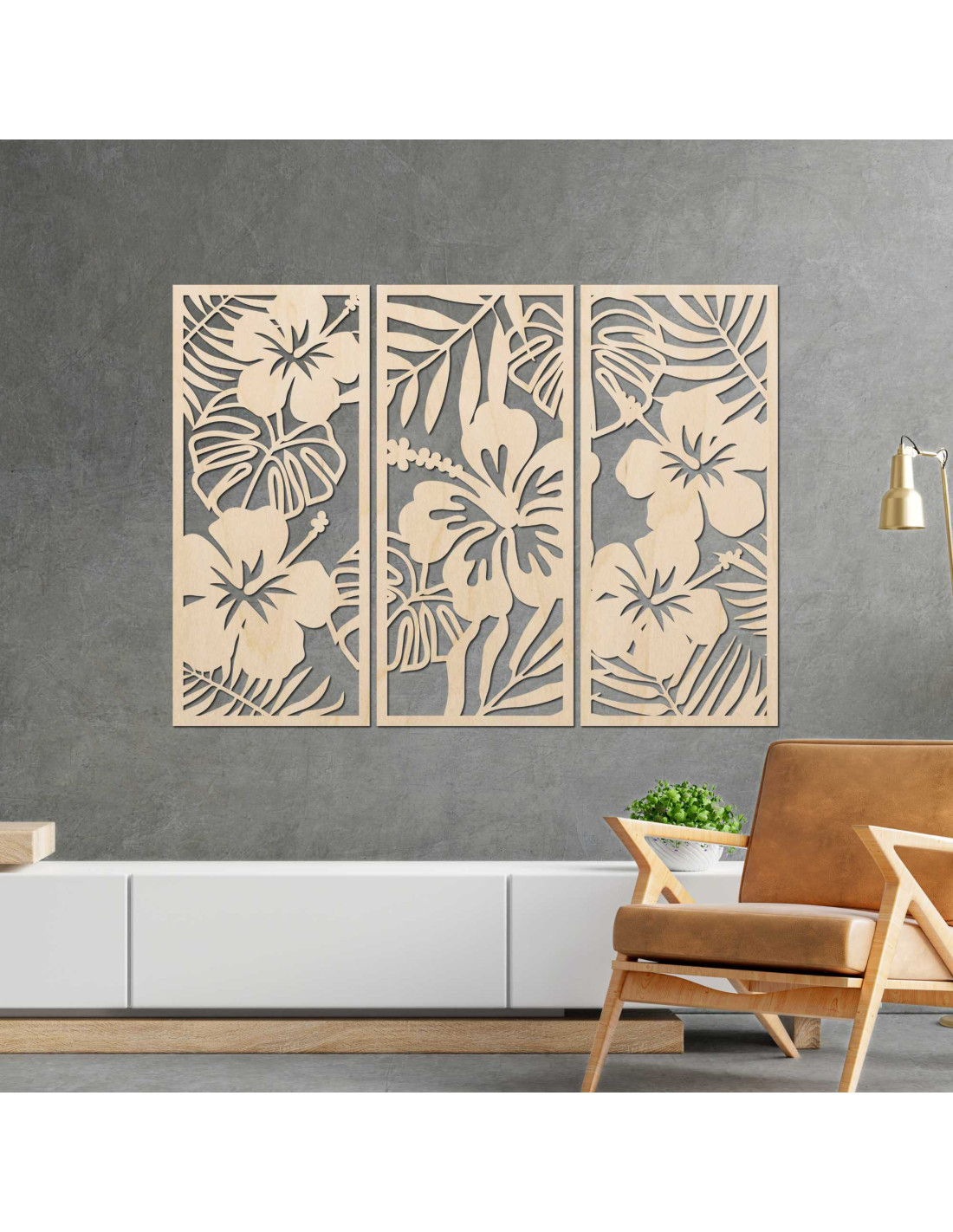 Kvetinové siluety, ktoré dominujú každej časti, sú inšpirované tropickou estetikou a pôsobia ľahko a vzdušne. Precízne vyrezávané línie vytvárajú dojem pohybu, akoby sa rastliny mierne vlnili v teplom vánku. Kompozícia v sebe spája remeselný štýl s moderným dizajnom, čím osloví každého milovníka vizuálneho umenia. Hravé tvary listov a kvetov sú stvárnené s dôrazom na prirodzenosť a súlad.
