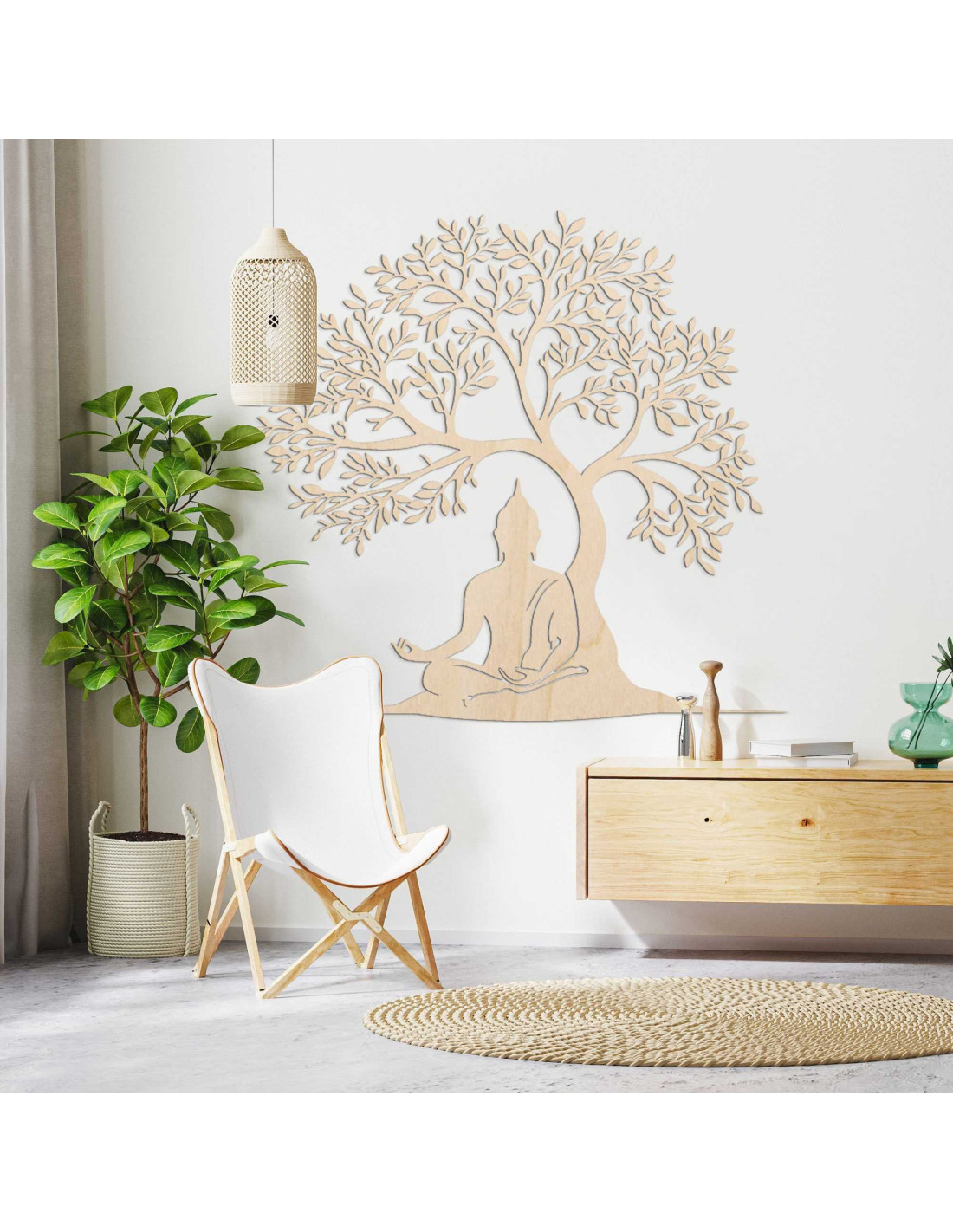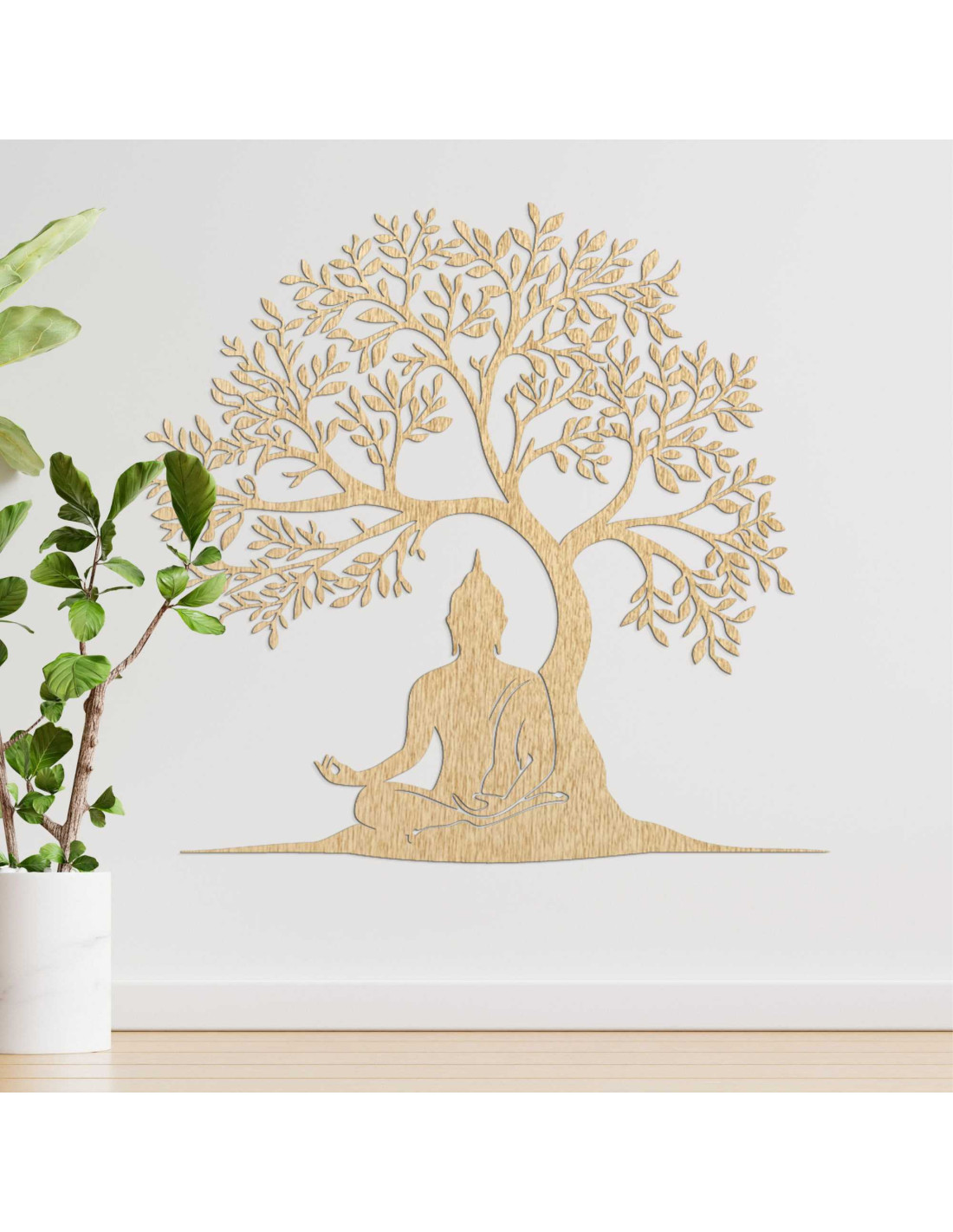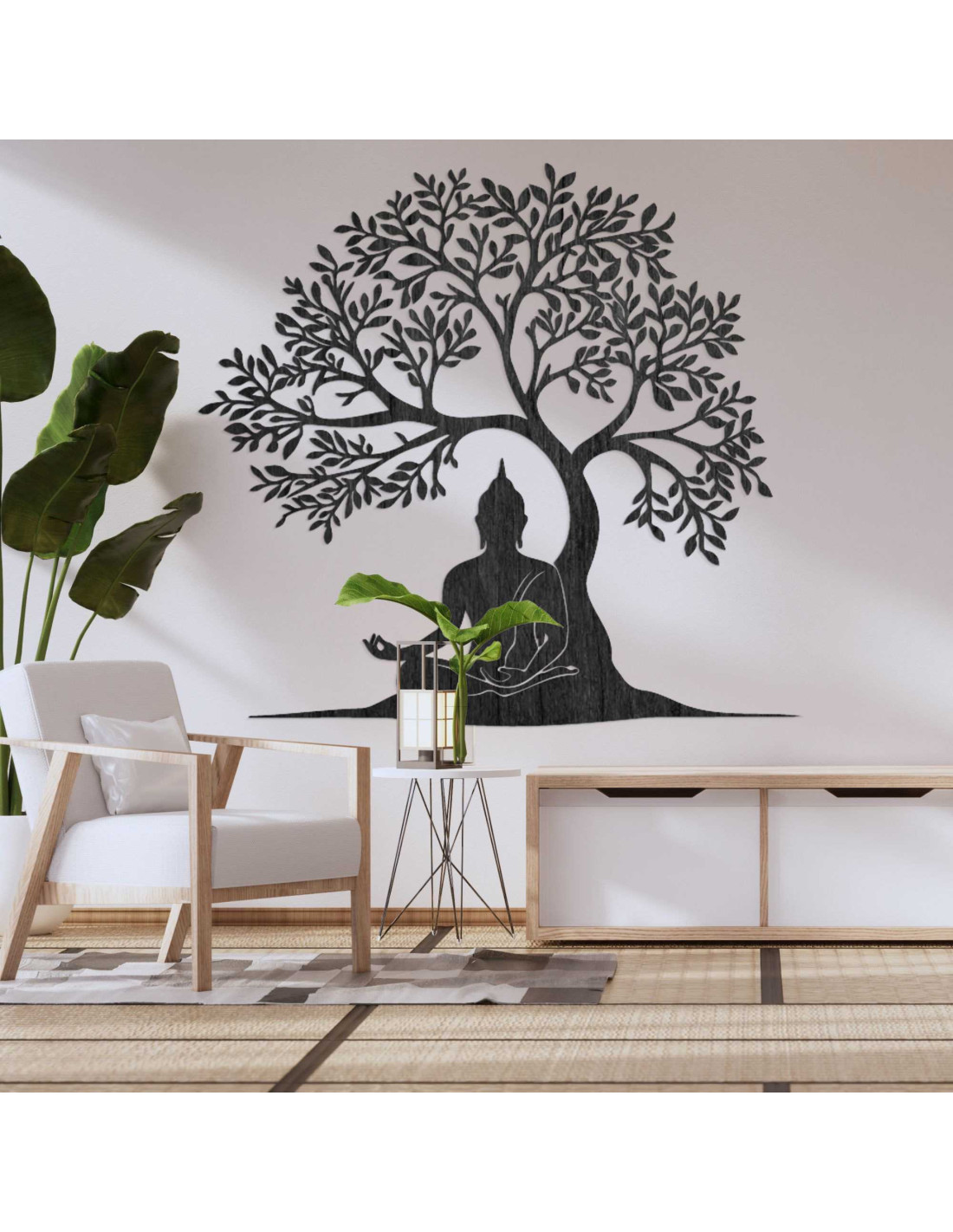 Drevená dekorácia znázorňuje spirituálnu scénu, kde Buddha sedí v meditatívnej polohe pod stromom poznania. Každý detail je výsledkom precíznej remeselnej práce, ktorá vzdáva hold filozofii východu. Silueta stromu zároveň symbolizuje rast, stabilitu a ochranu. Celok pôsobí ako umelecké dielo s hlbokým významom, ktoré sa prihovára duši.