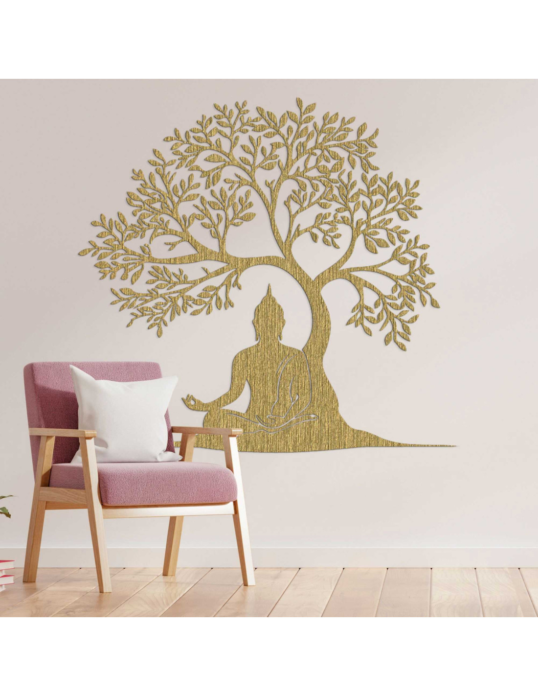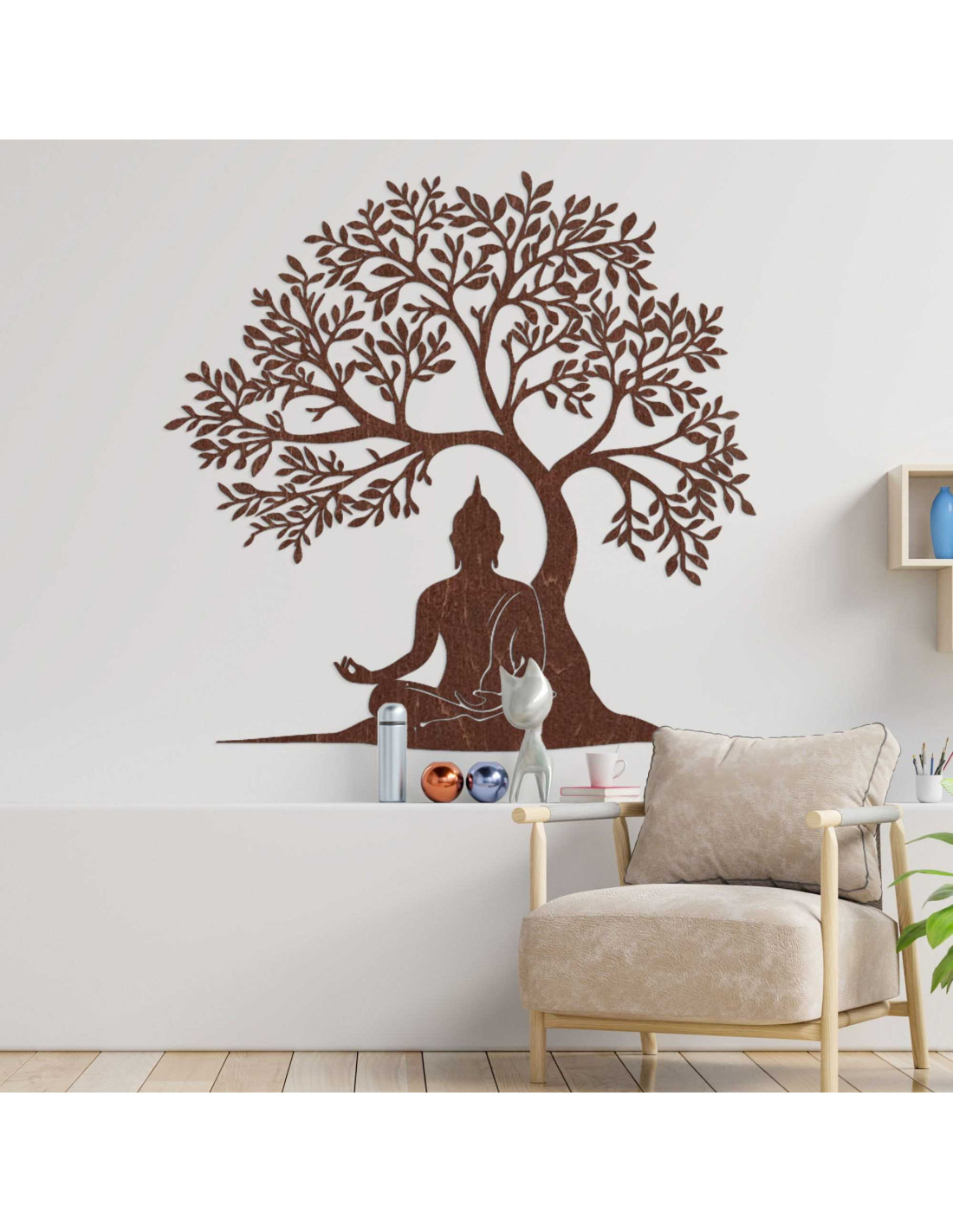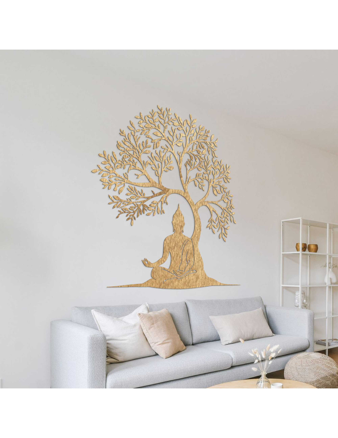 Drevená dekorácia znázorňuje spirituálnu scénu, kde Buddha sedí v meditatívnej polohe pod stromom poznania. Každý detail je výsledkom precíznej remeselnej práce, ktorá vzdáva hold filozofii východu. Silueta stromu zároveň symbolizuje rast, stabilitu a ochranu. Celok pôsobí ako umelecké dielo s hlbokým významom, ktoré sa prihovára duši.