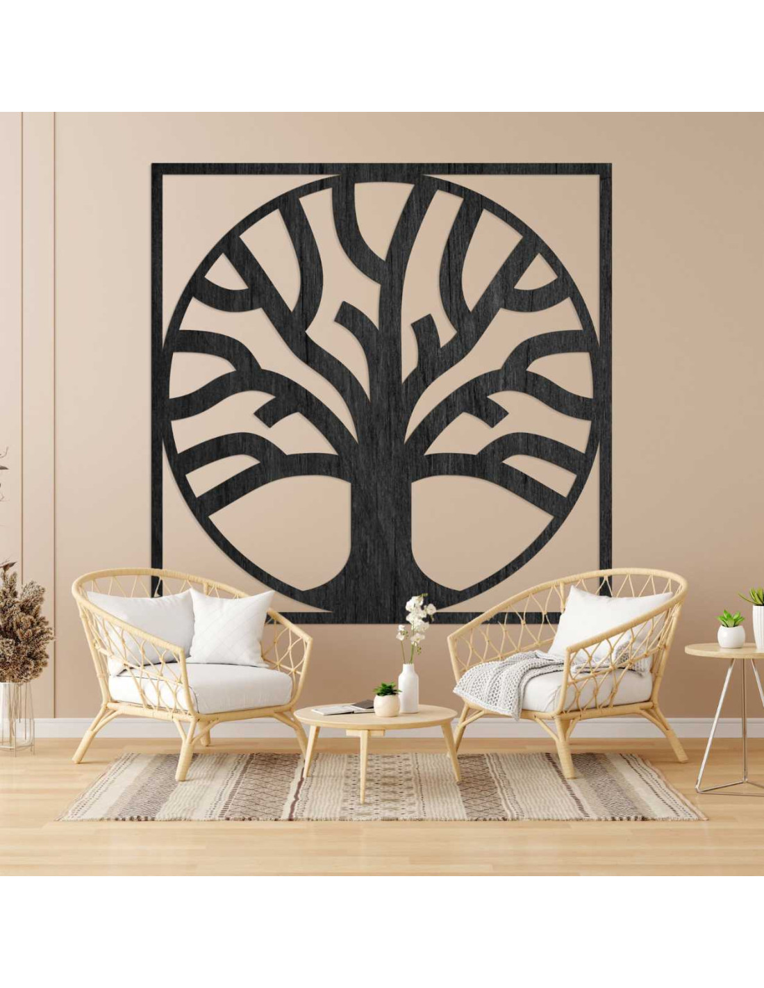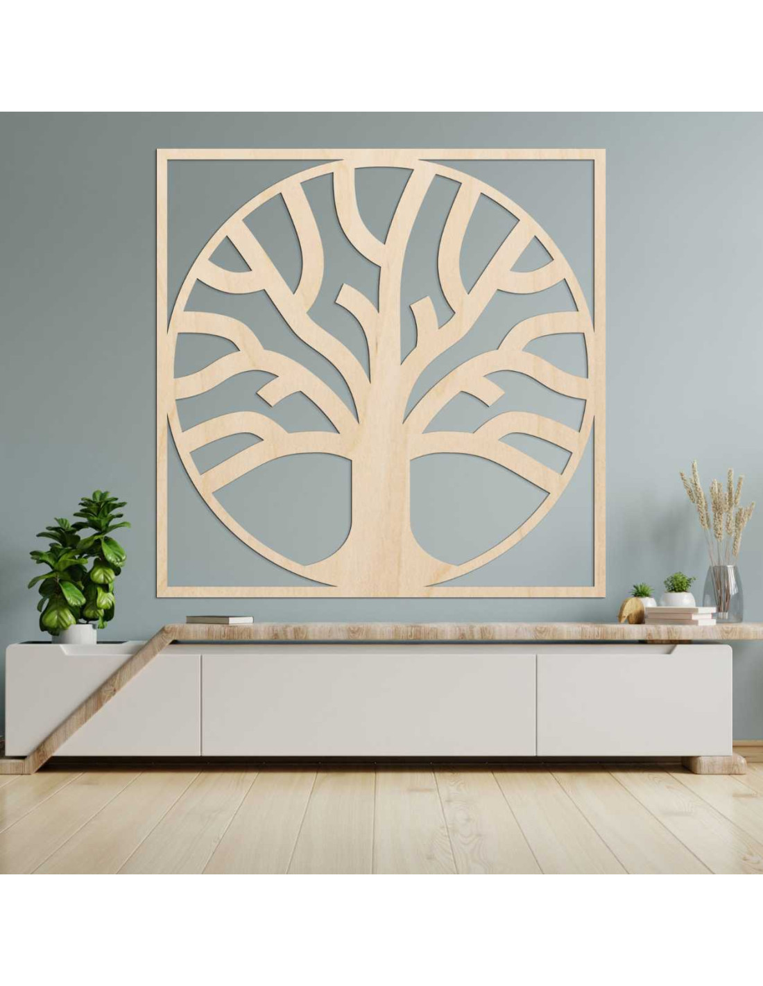 Drevený obraz so stromom života v štvorcovom ráme predstavuje spojenie prírodného materiálu s minimalistickou estetikou.