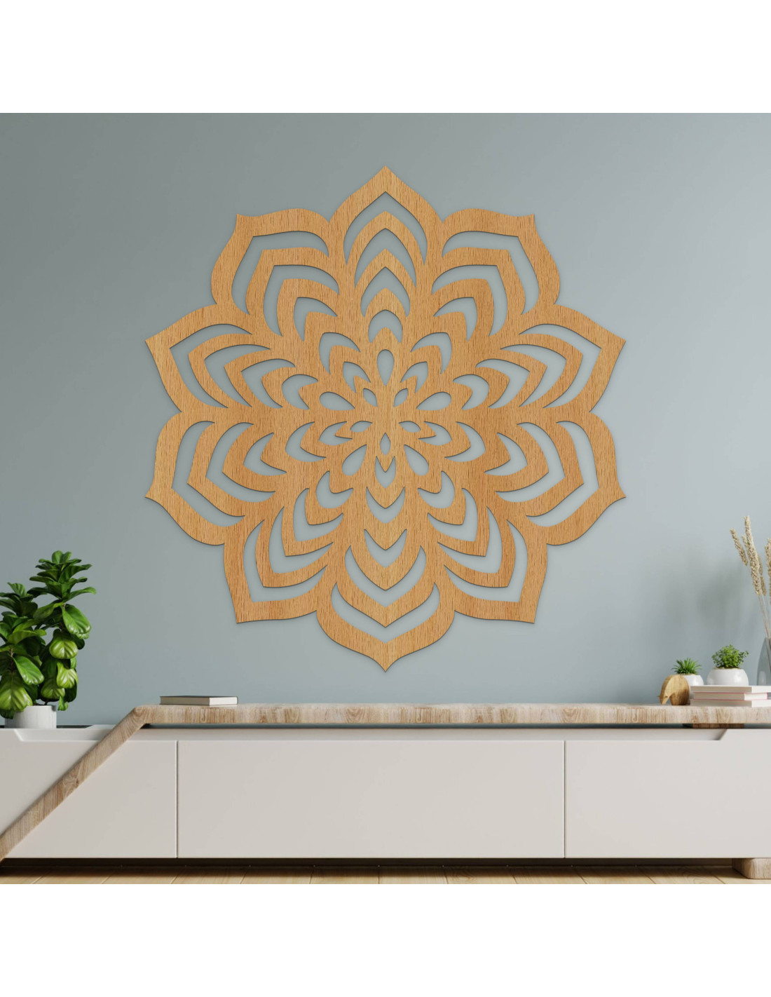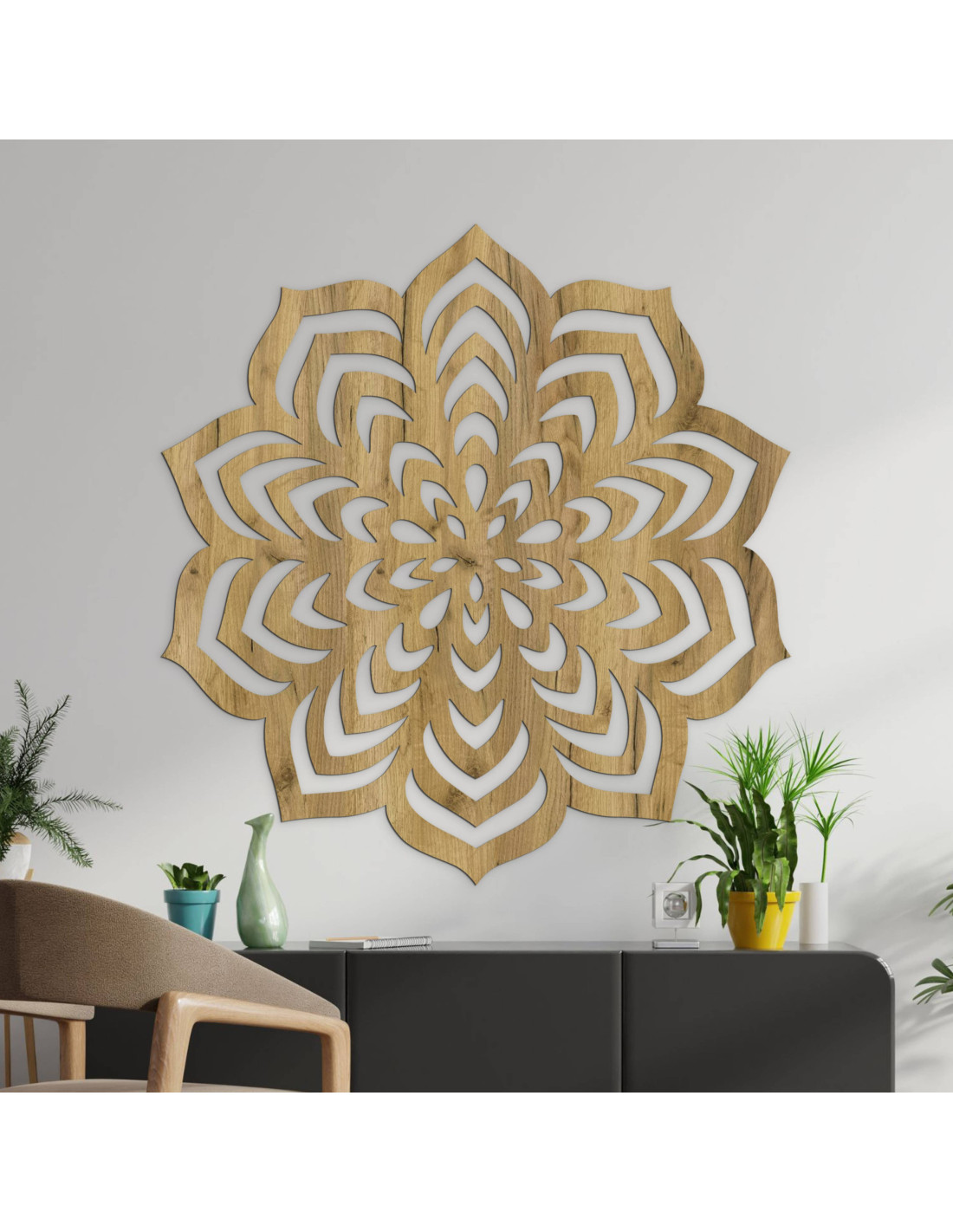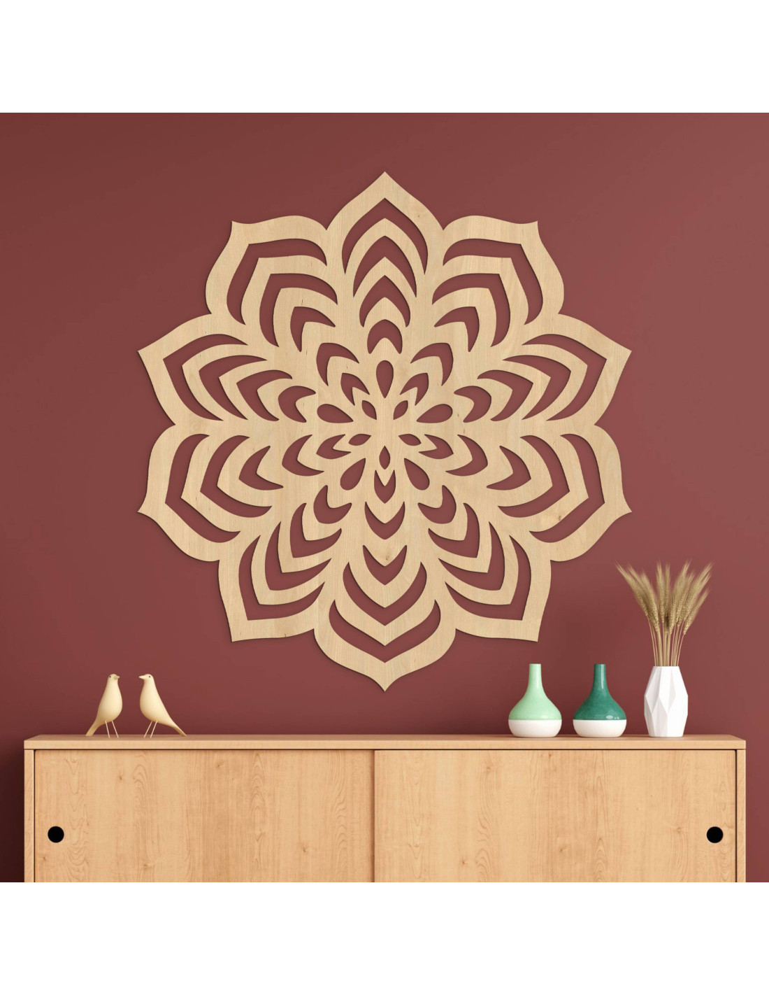 Drevená dekorácia s vyrezávaným mandalovým motívom.