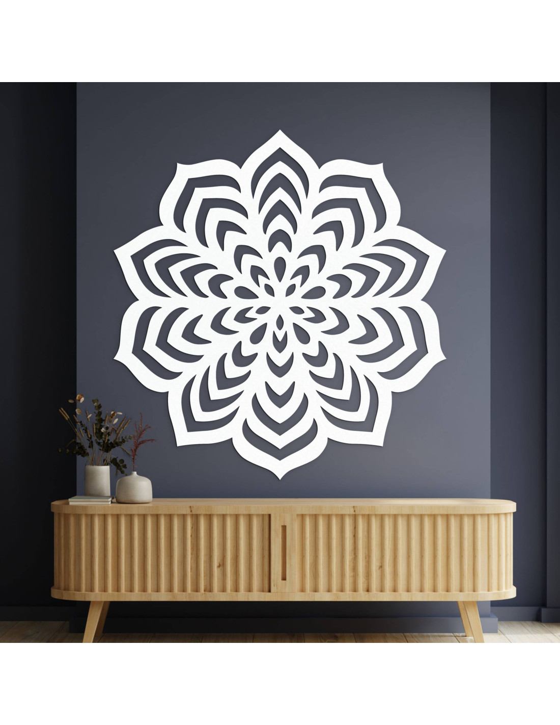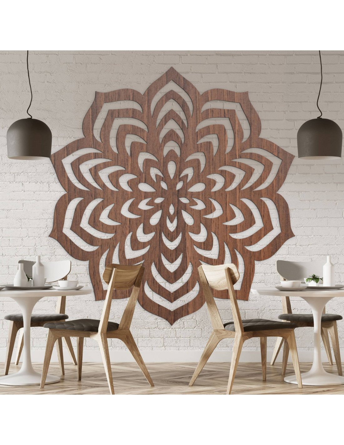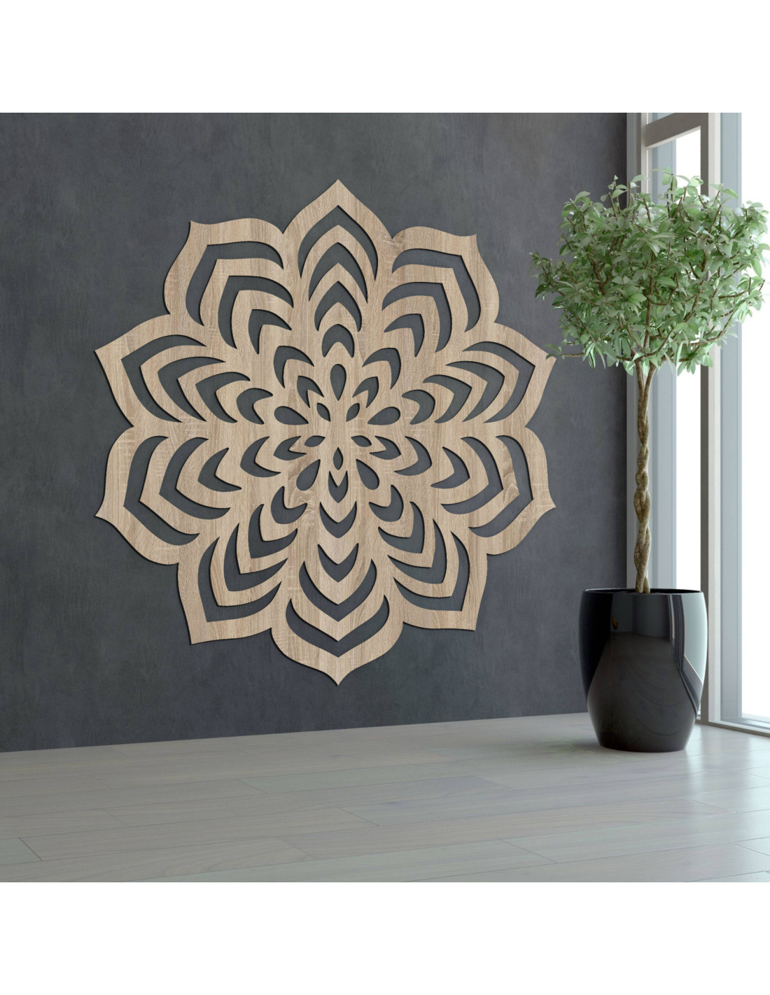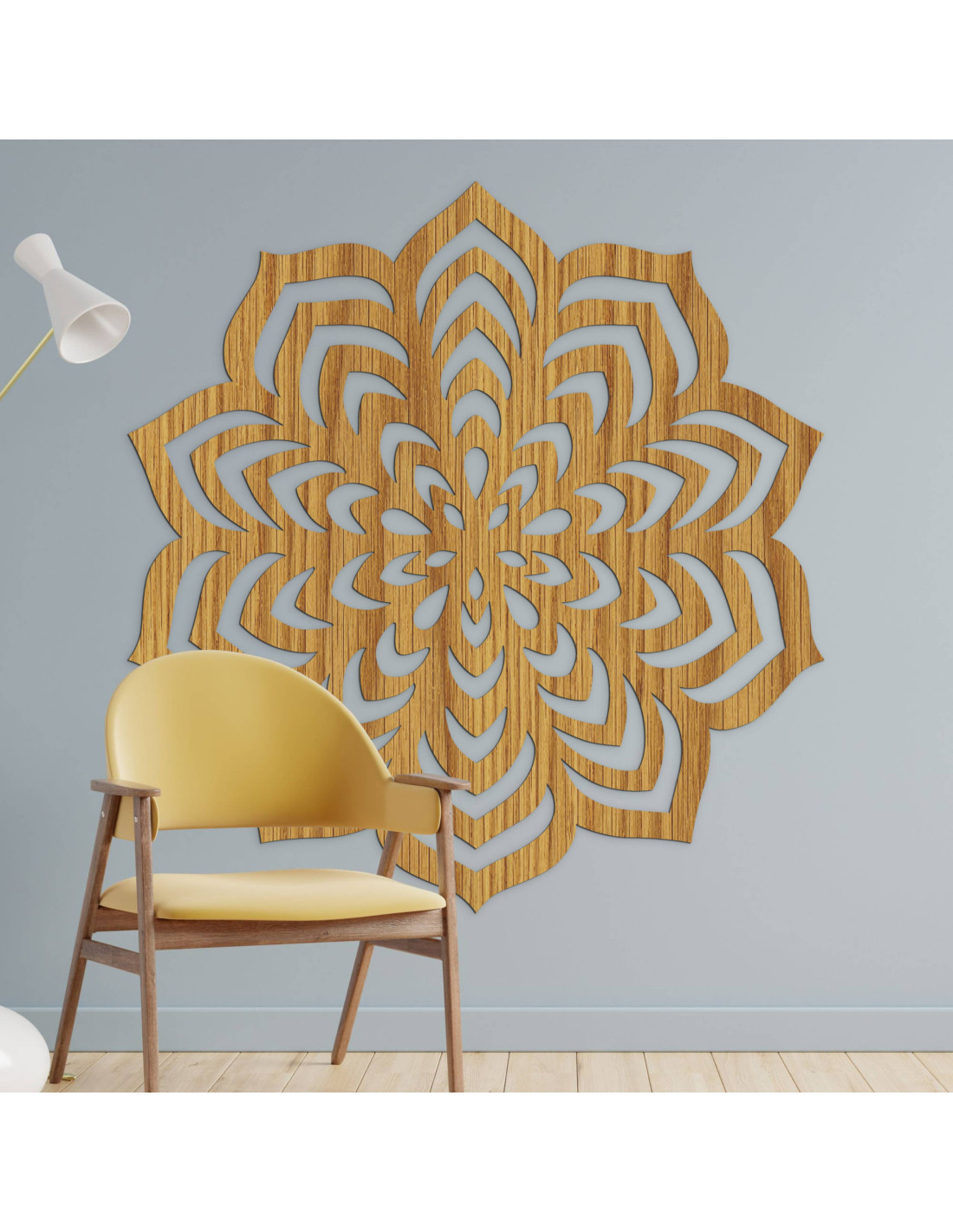 Drevená dekorácia s vyrezávaným mandalovým motívom.