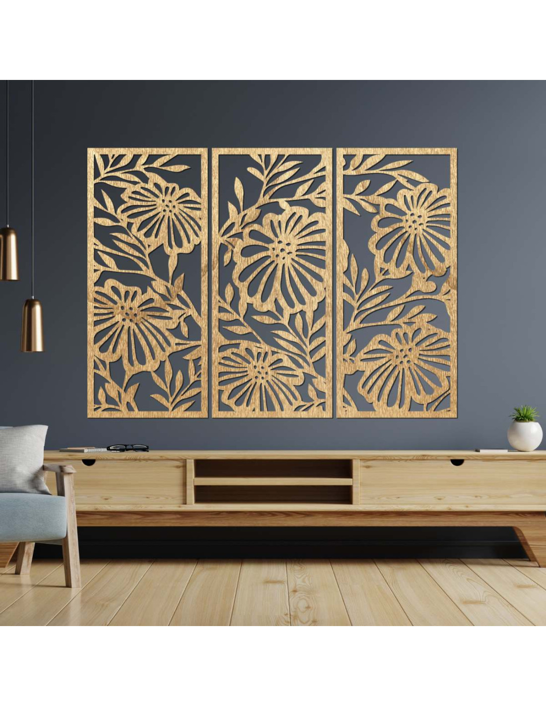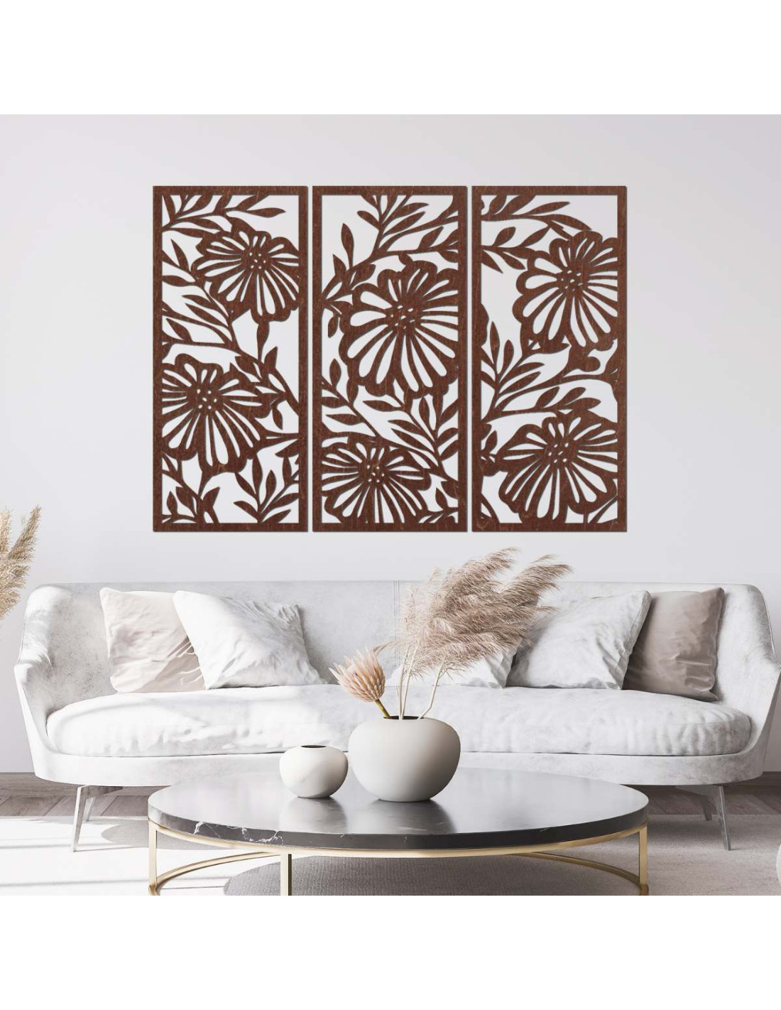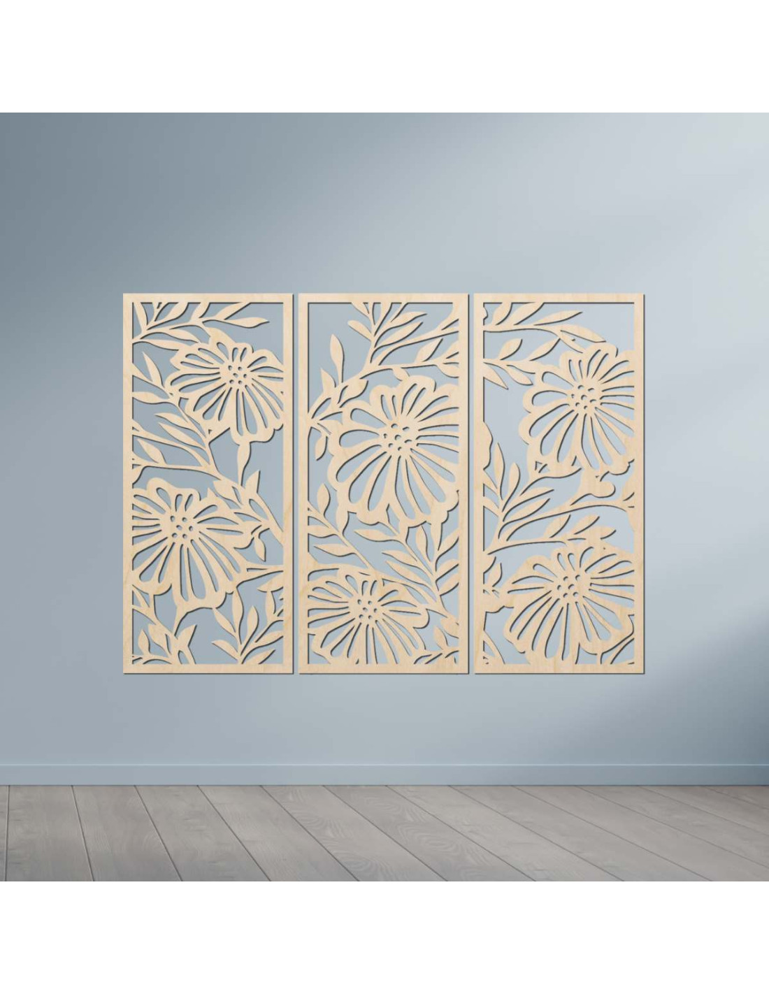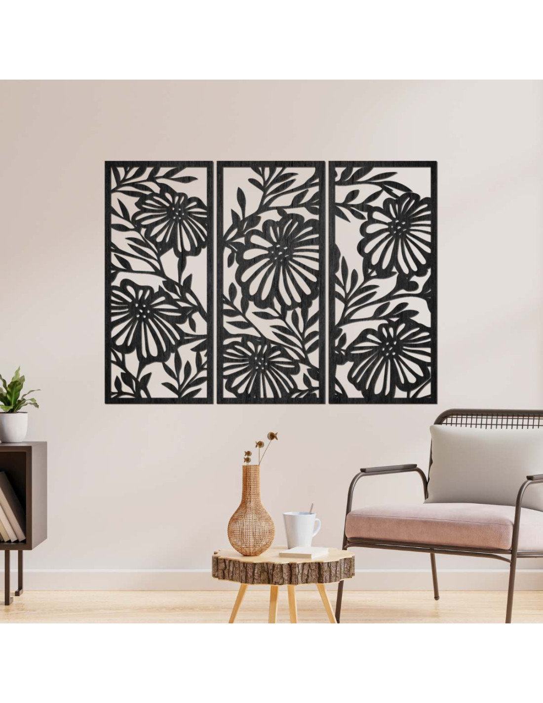 Trojdielny drevený obraz s kvetinovým motívom je štýlová a prírodná dekorácia, ktorá oživí každý interiér.