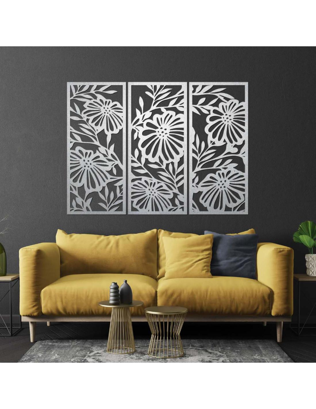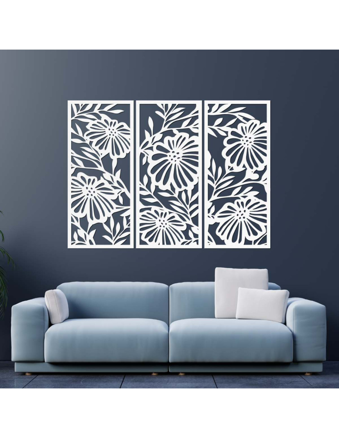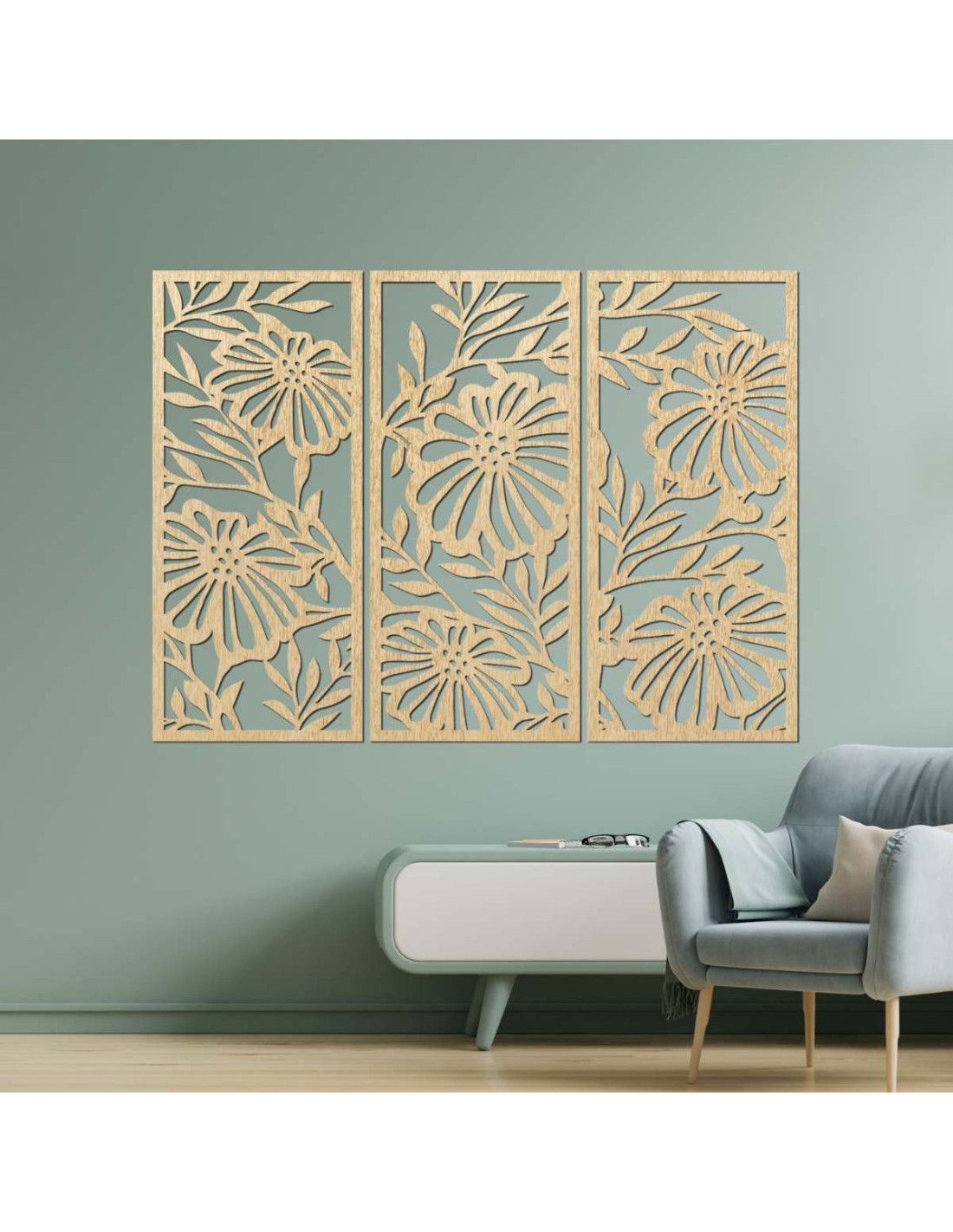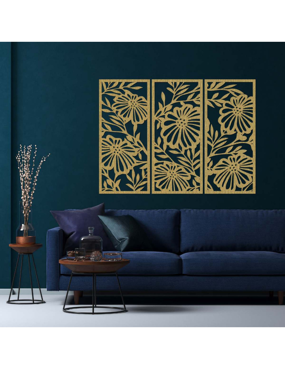 Trojdielny drevený obraz s kvetinovým motívom je štýlová a prírodná dekorácia, ktorá oživí každý interiér.