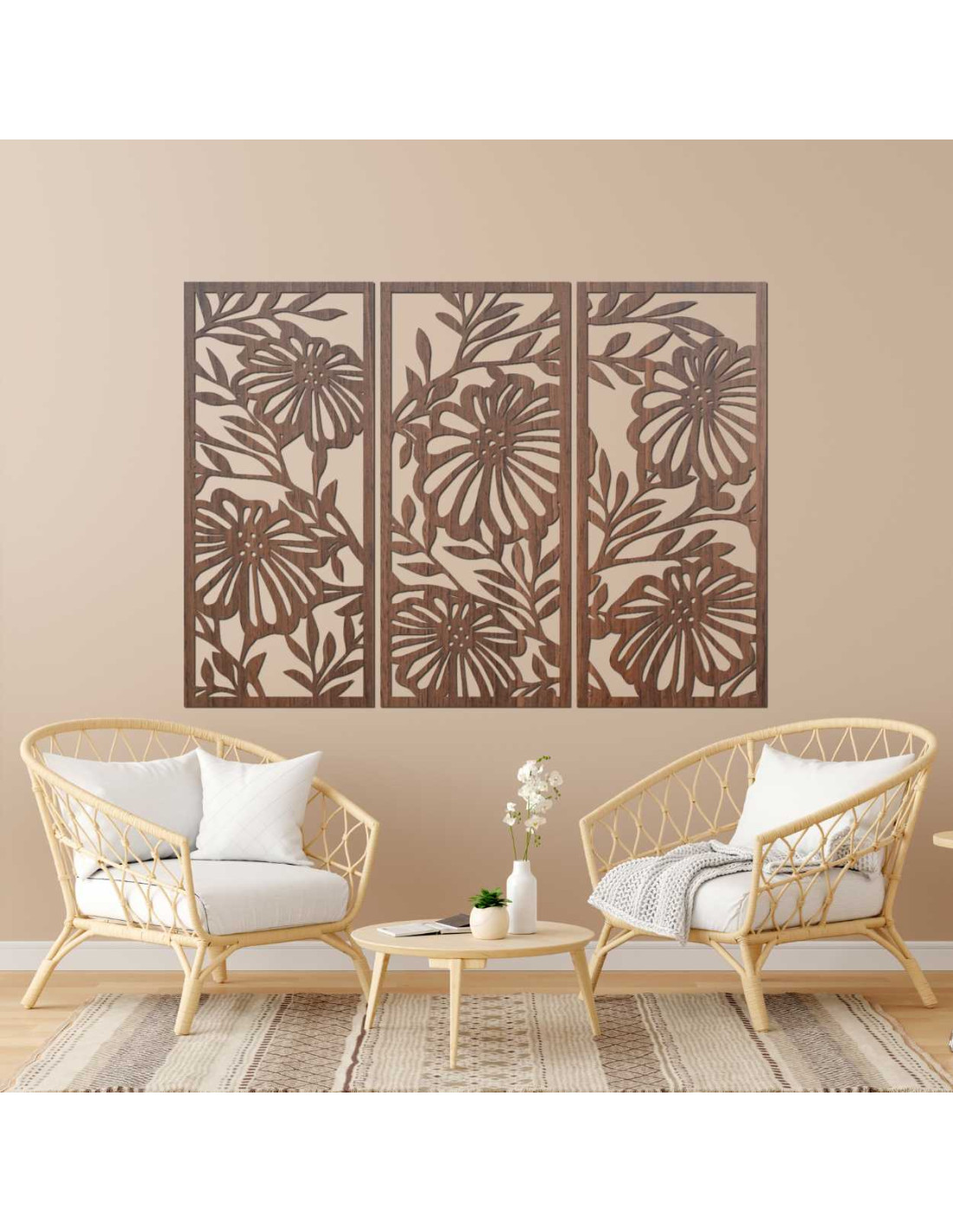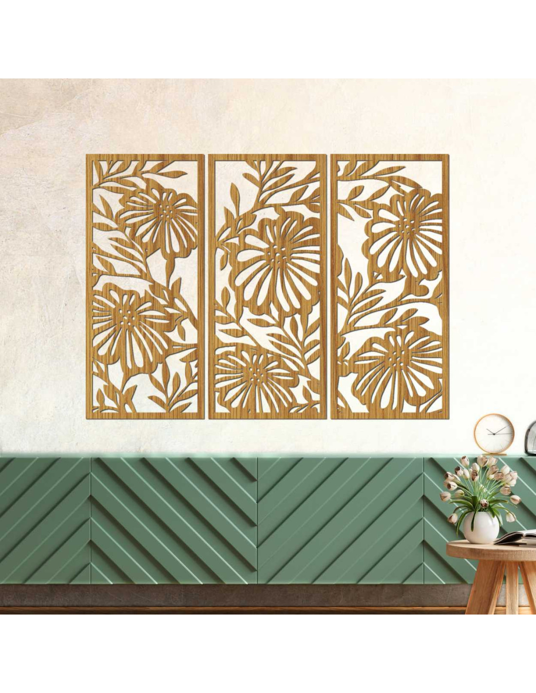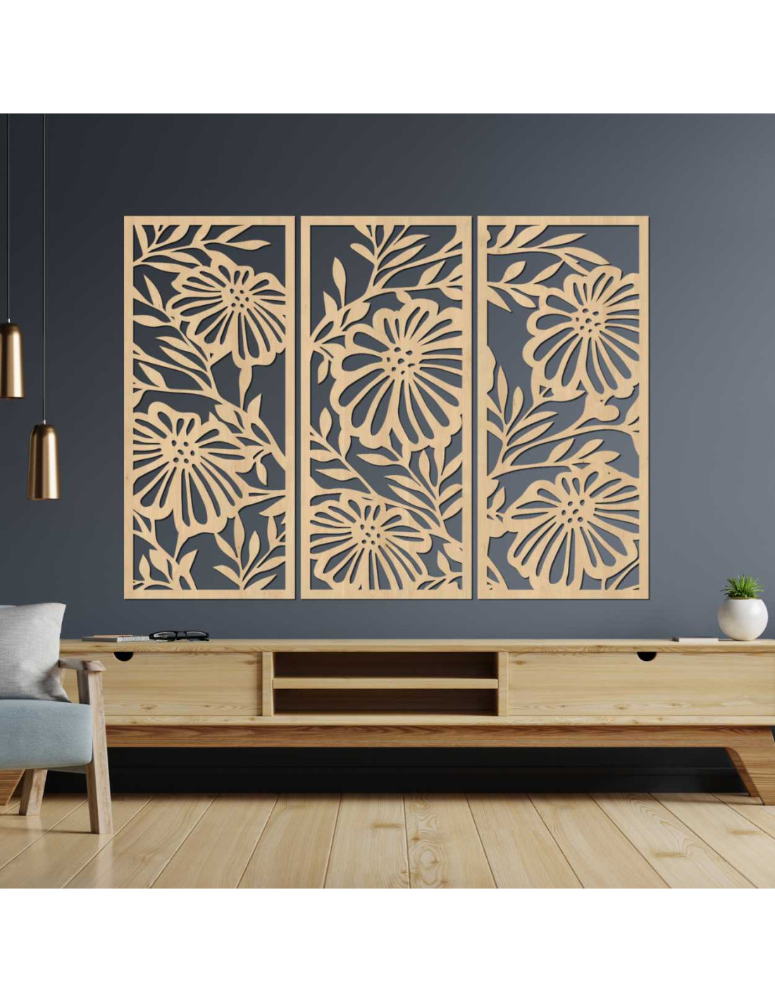 Drevený nástenný obraz s kvetinovým vzorom vyniká detailným spracovaním a moderným trojdielnym dizajnom.