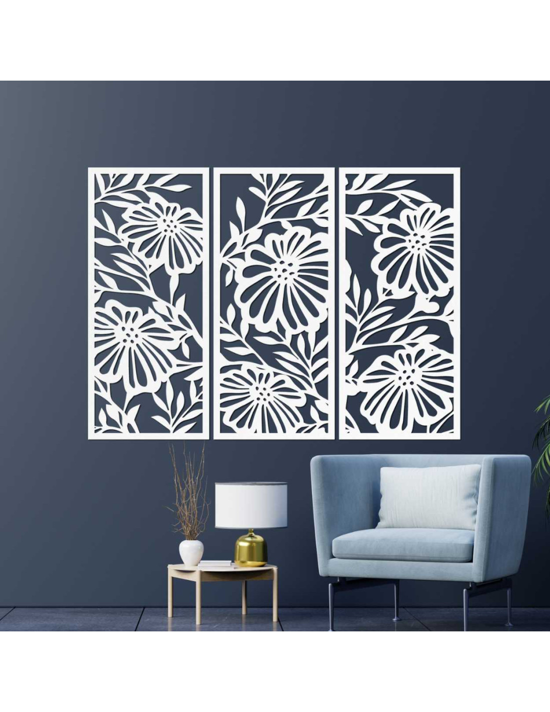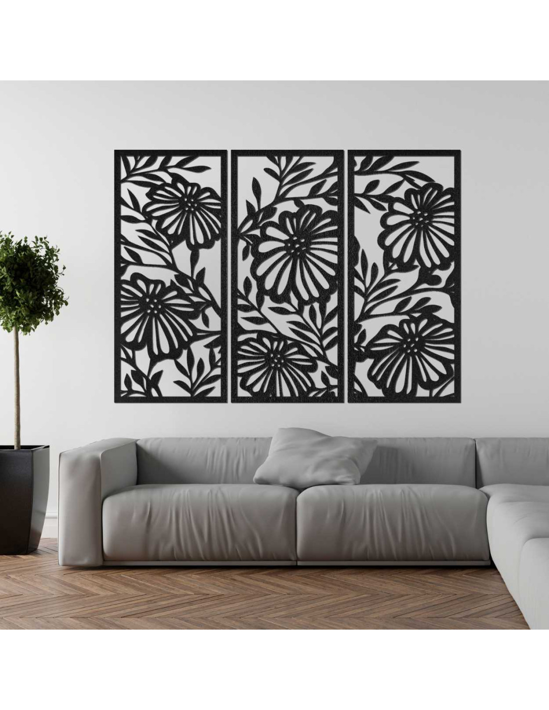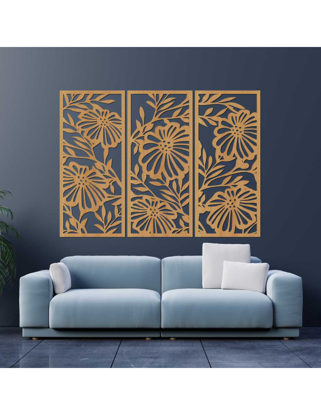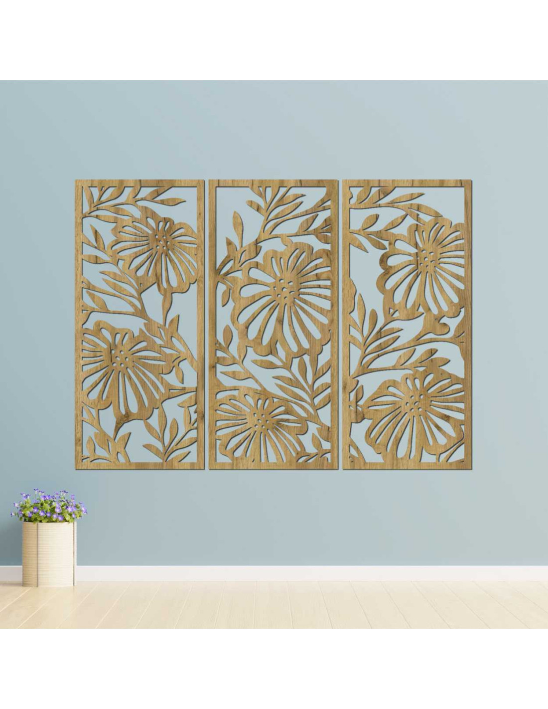 Drevený nástenný obraz s kvetinovým vzorom vyniká detailným spracovaním a moderným trojdielnym dizajnom.
