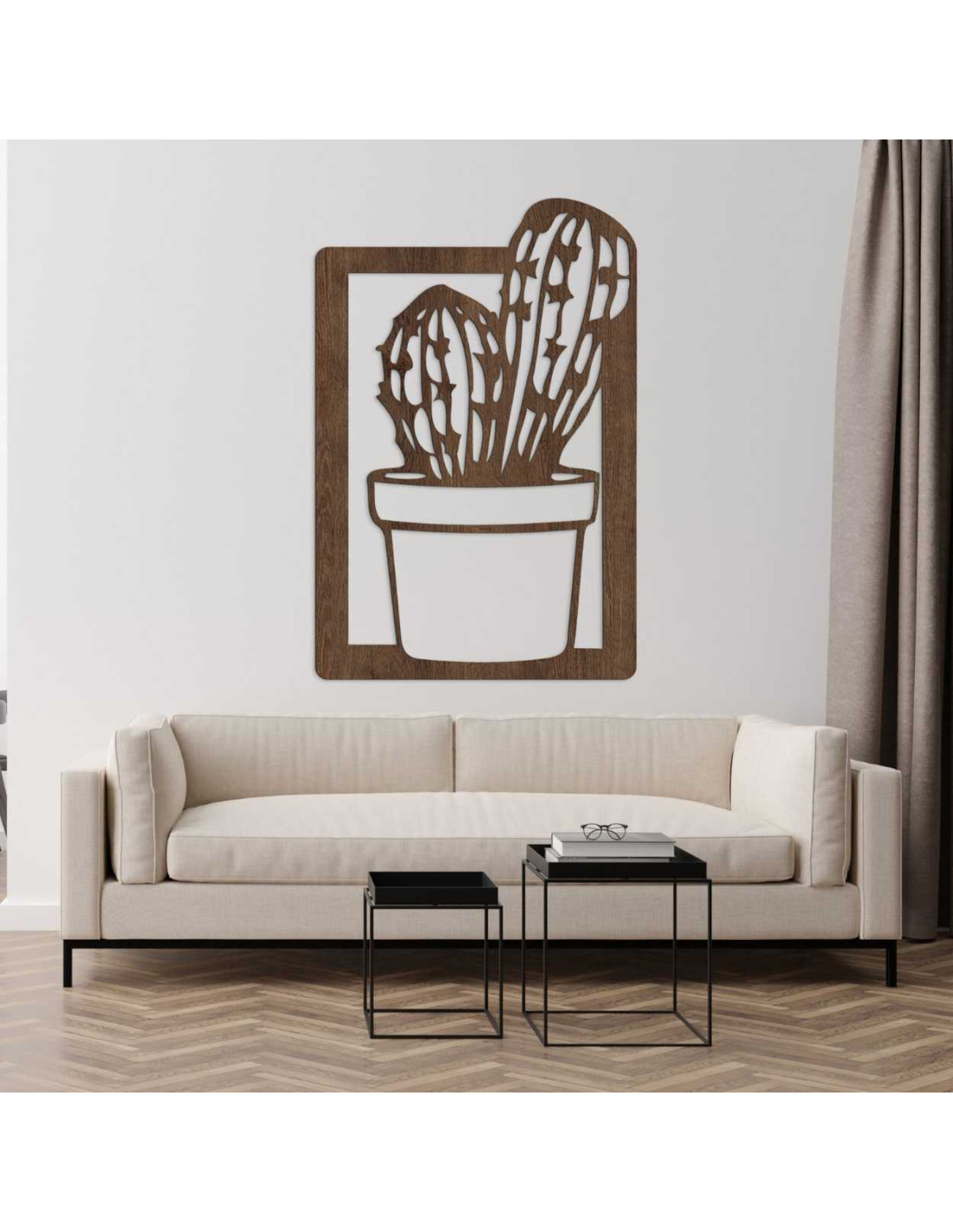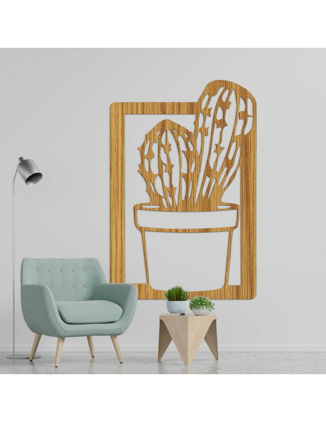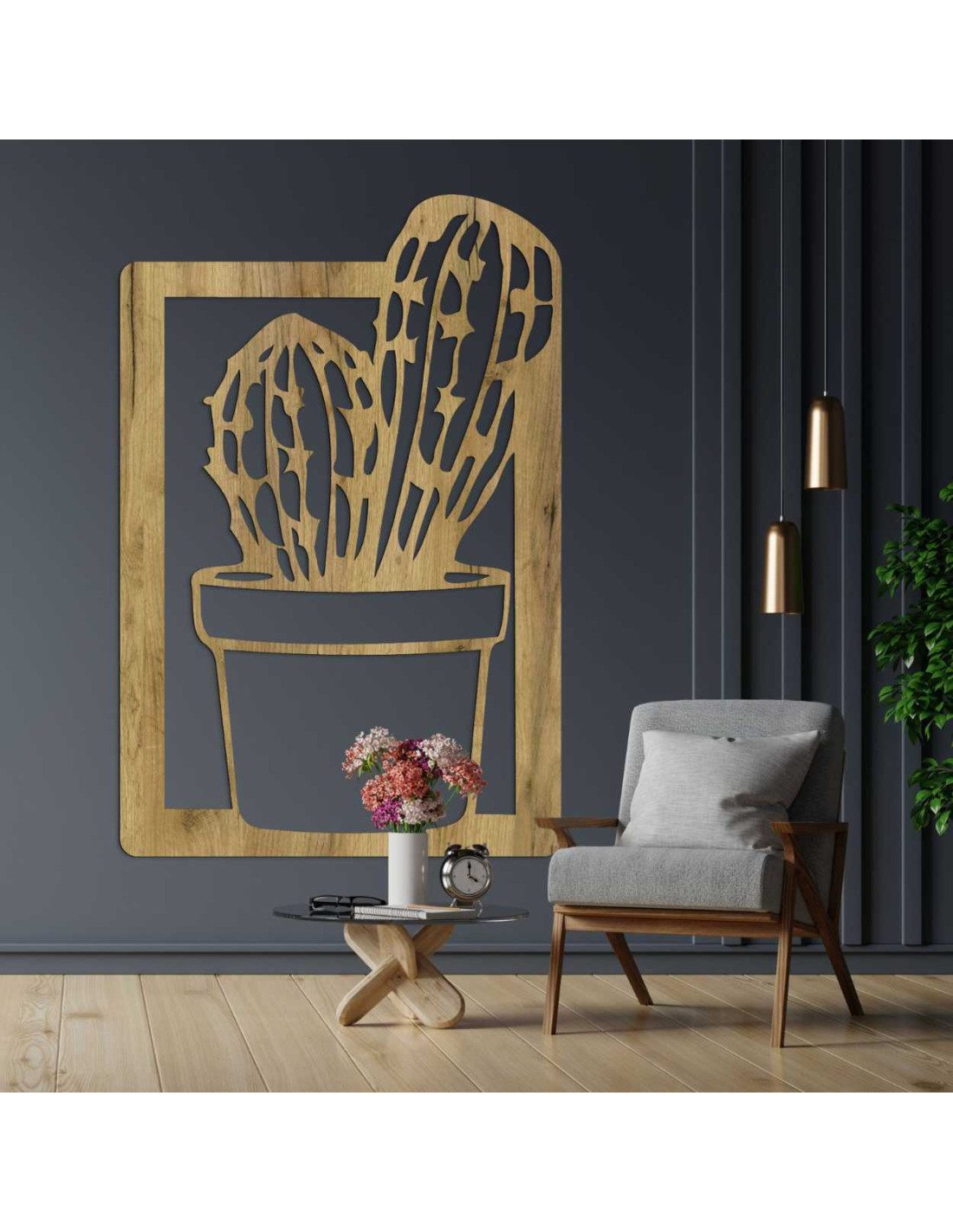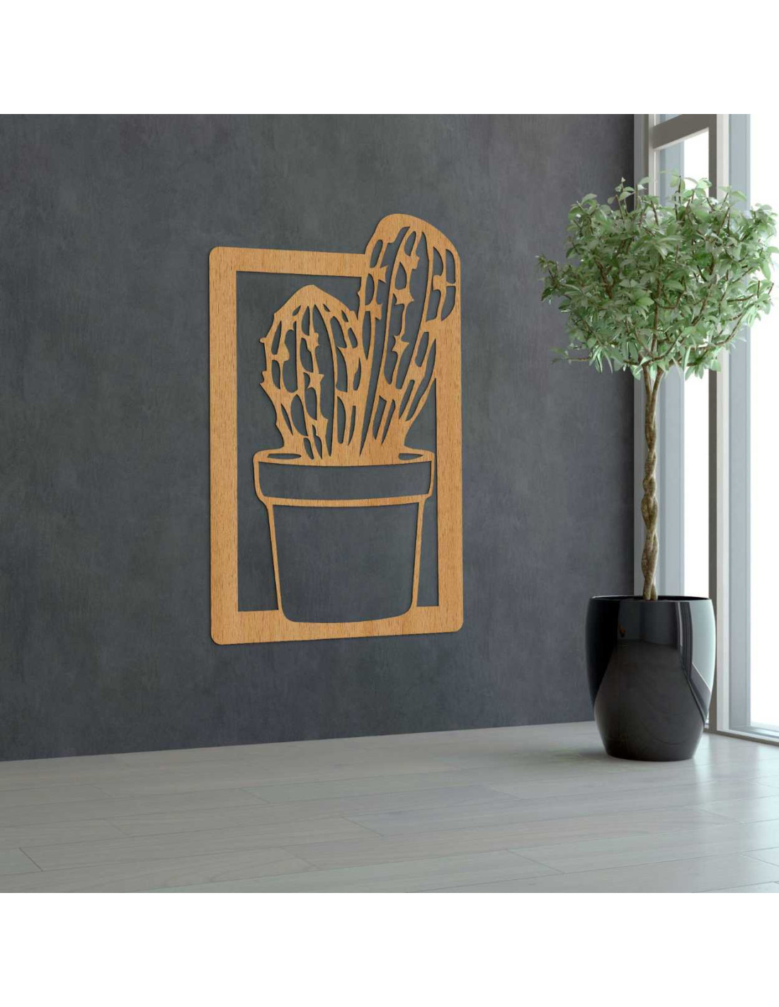 Luxusný drevený panel na stenu s minimalistickým vzorom kaktusu.
