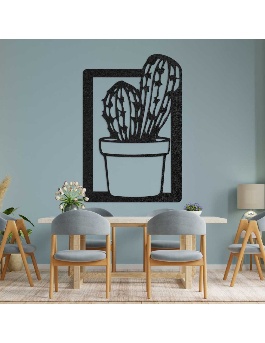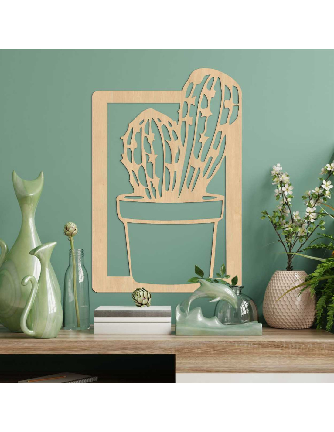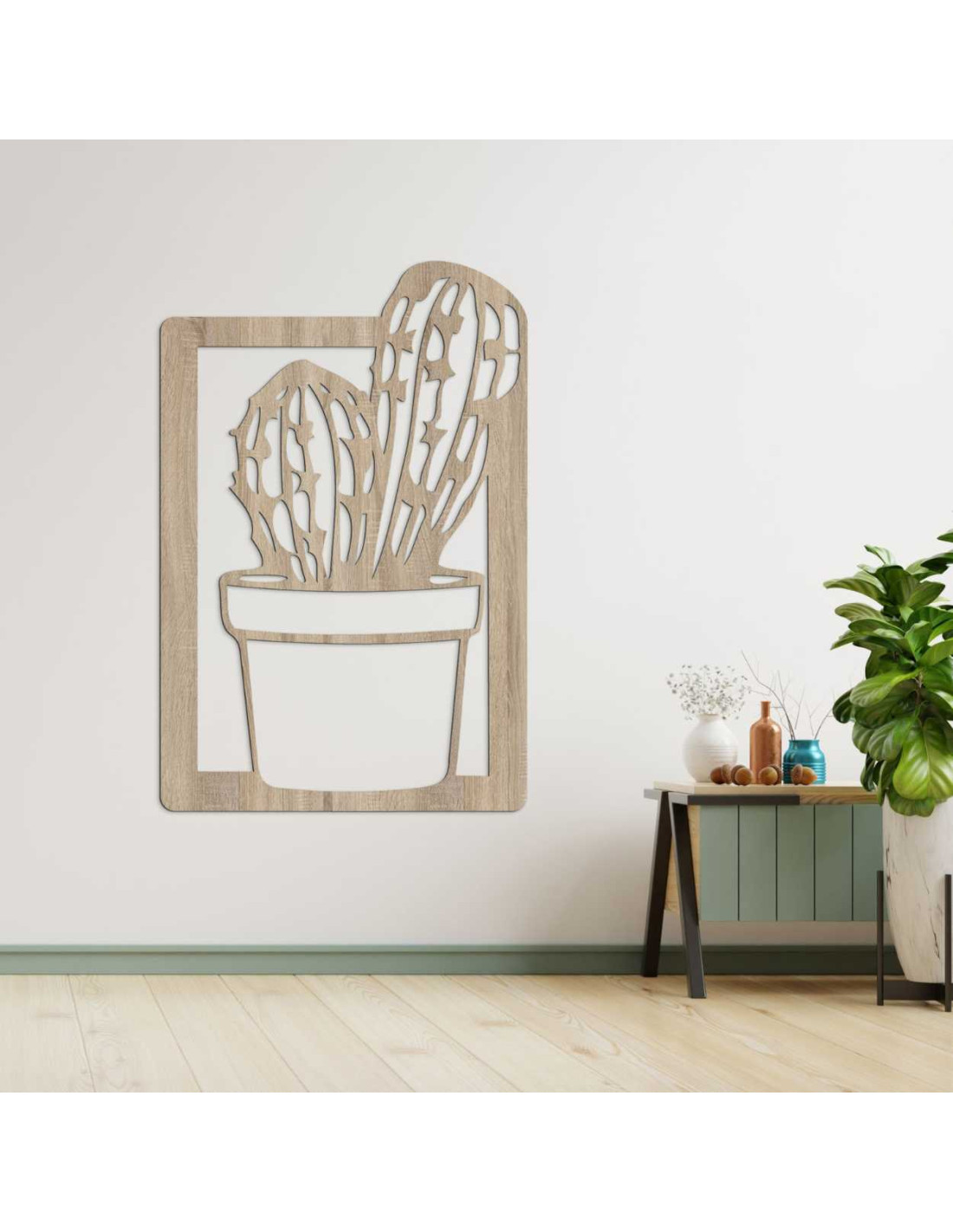 Vyrezávaný drevený obraz s motívom kaktusu, vhodný do obývačky alebo kuchyne.