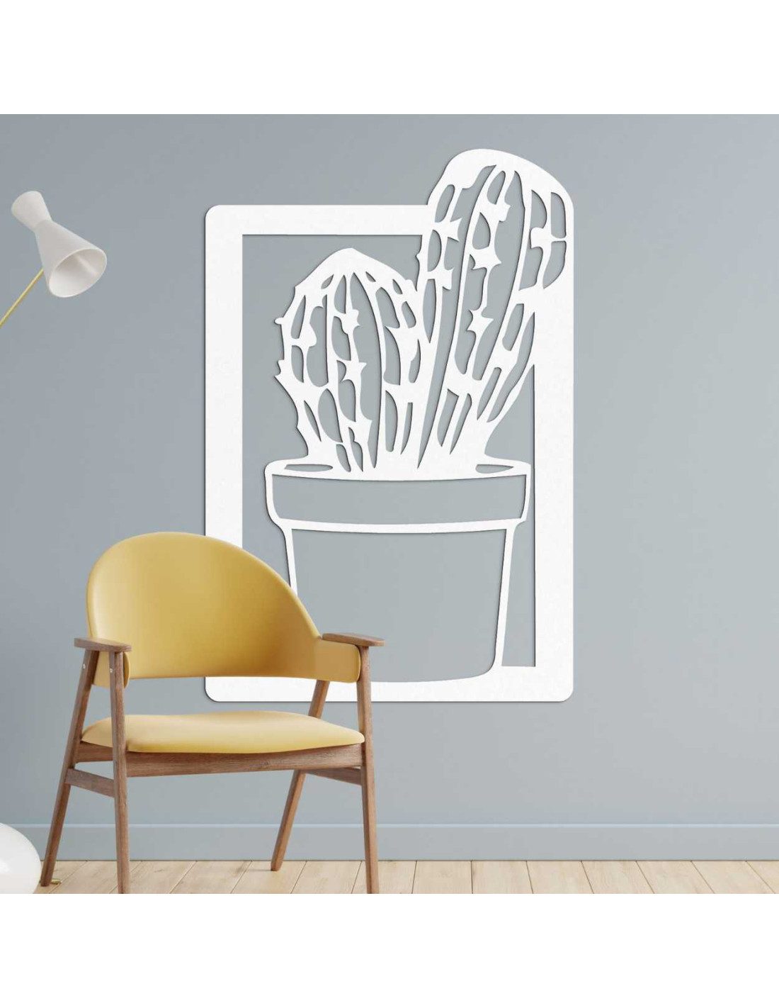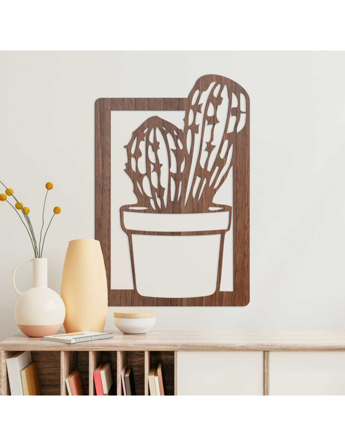 Elegantná drevená dekorácia interiéru v tvare kaktusu v ráme.