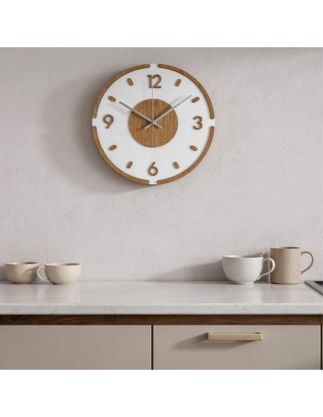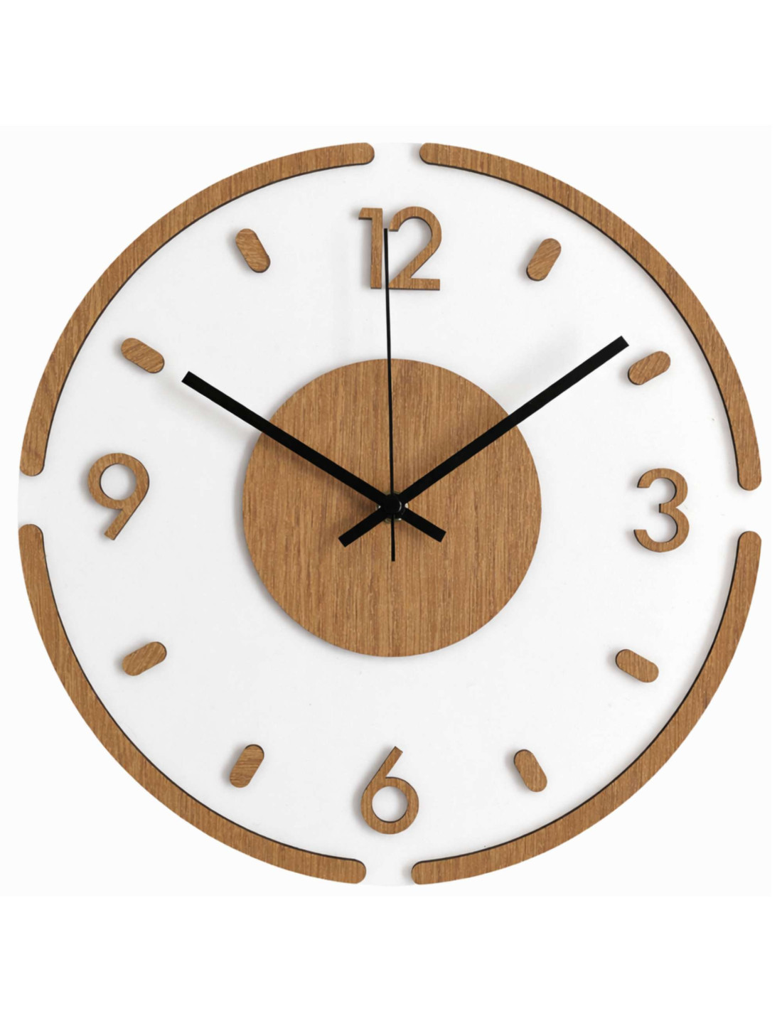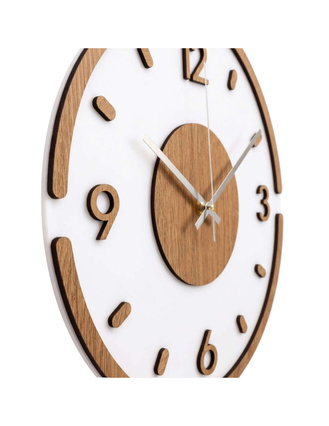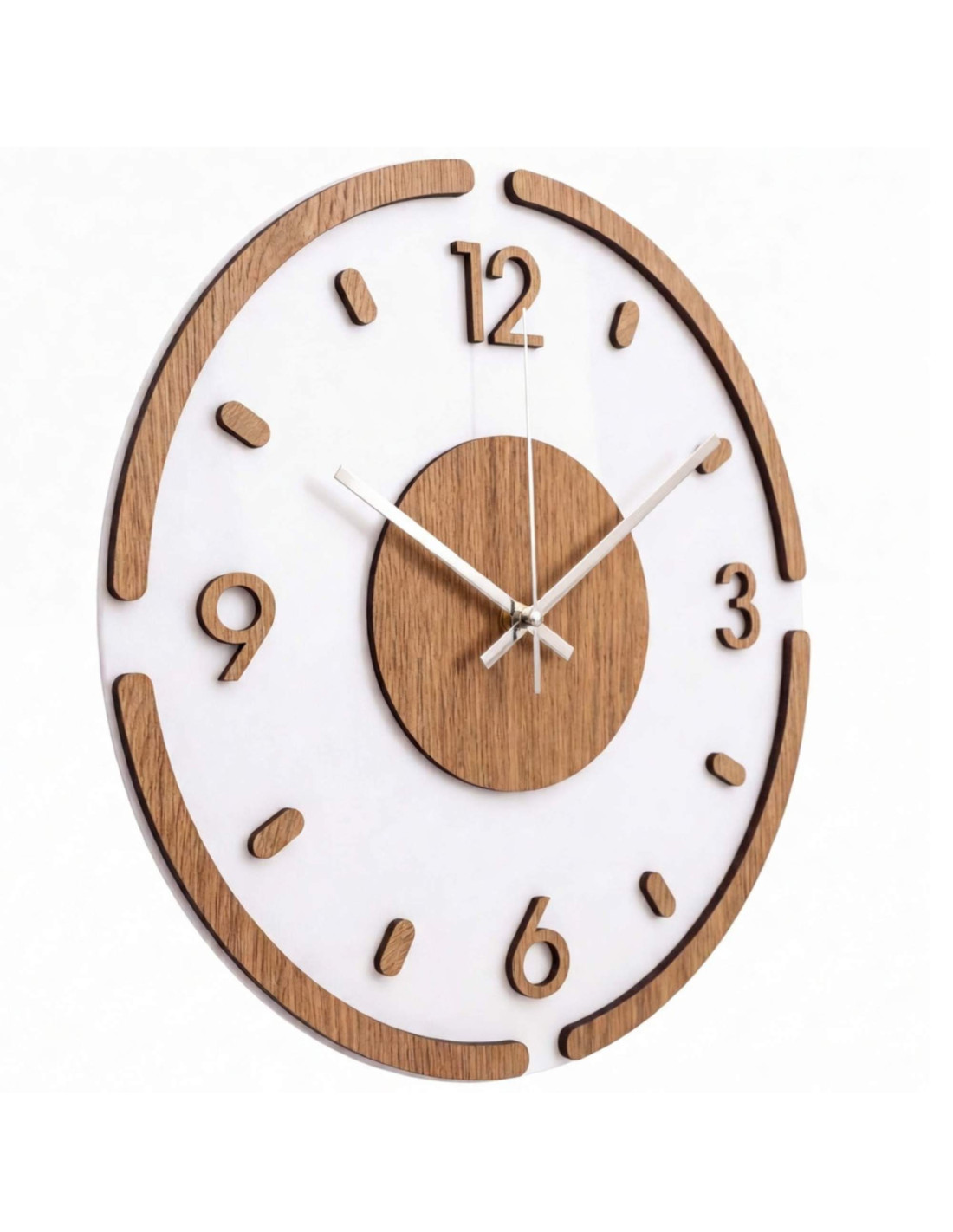Hodiny sú vyrobené z kvalitnej HDF dosky s dubovým vzorom v kombinácii s lesklým a elegantným bielym plexisklom.