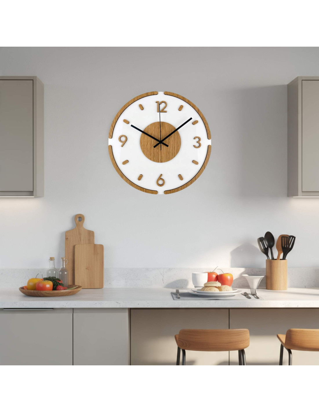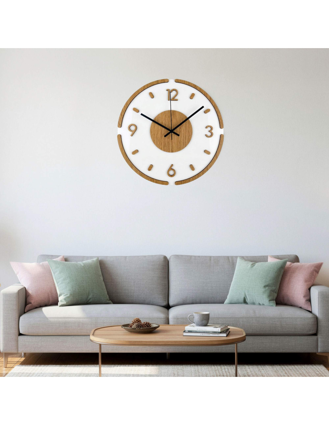 Hodiny sú vyrobené z kvalitnej HDF dosky s dubovým vzorom v kombinácii s lesklým a elegantným bielym plexisklom.