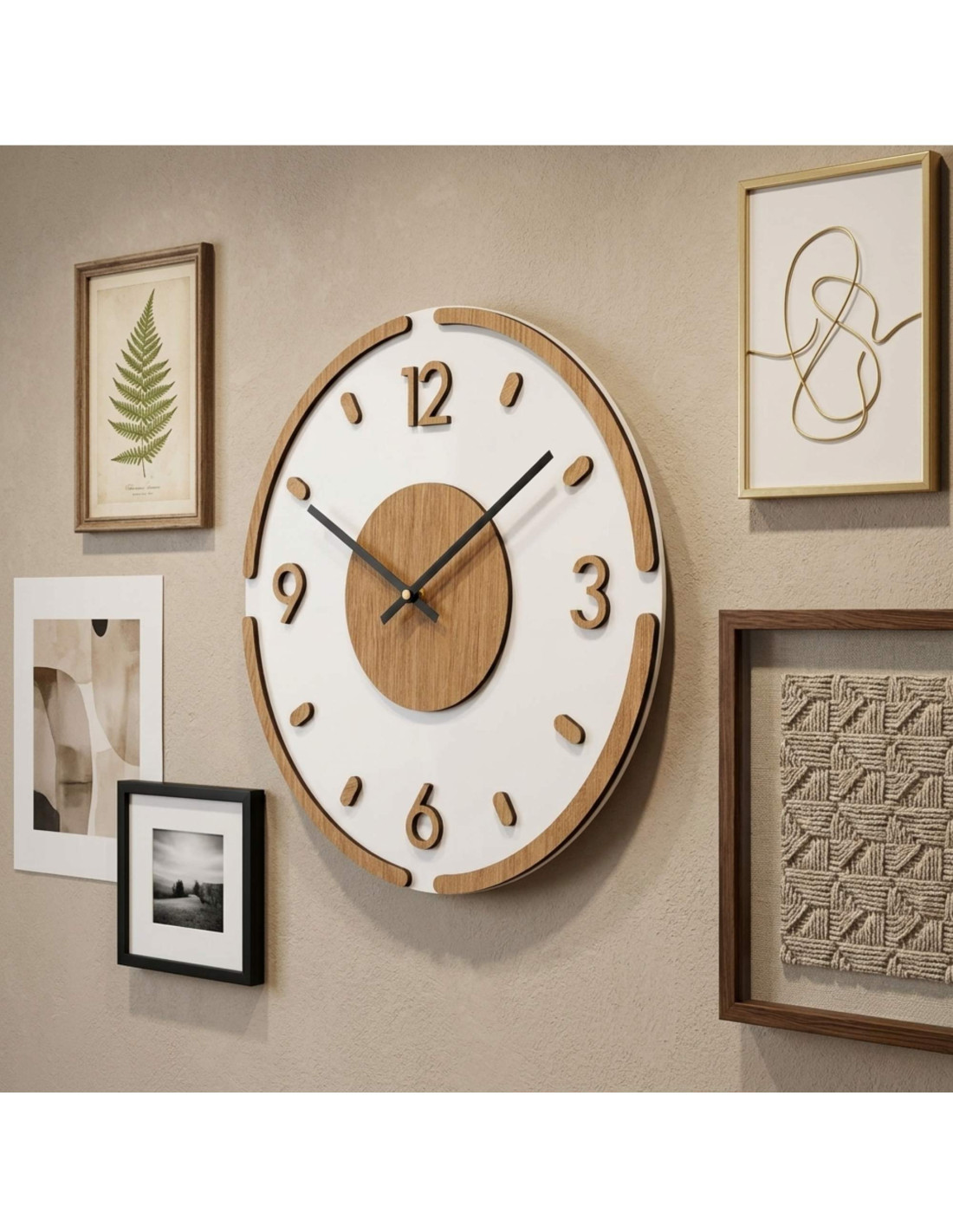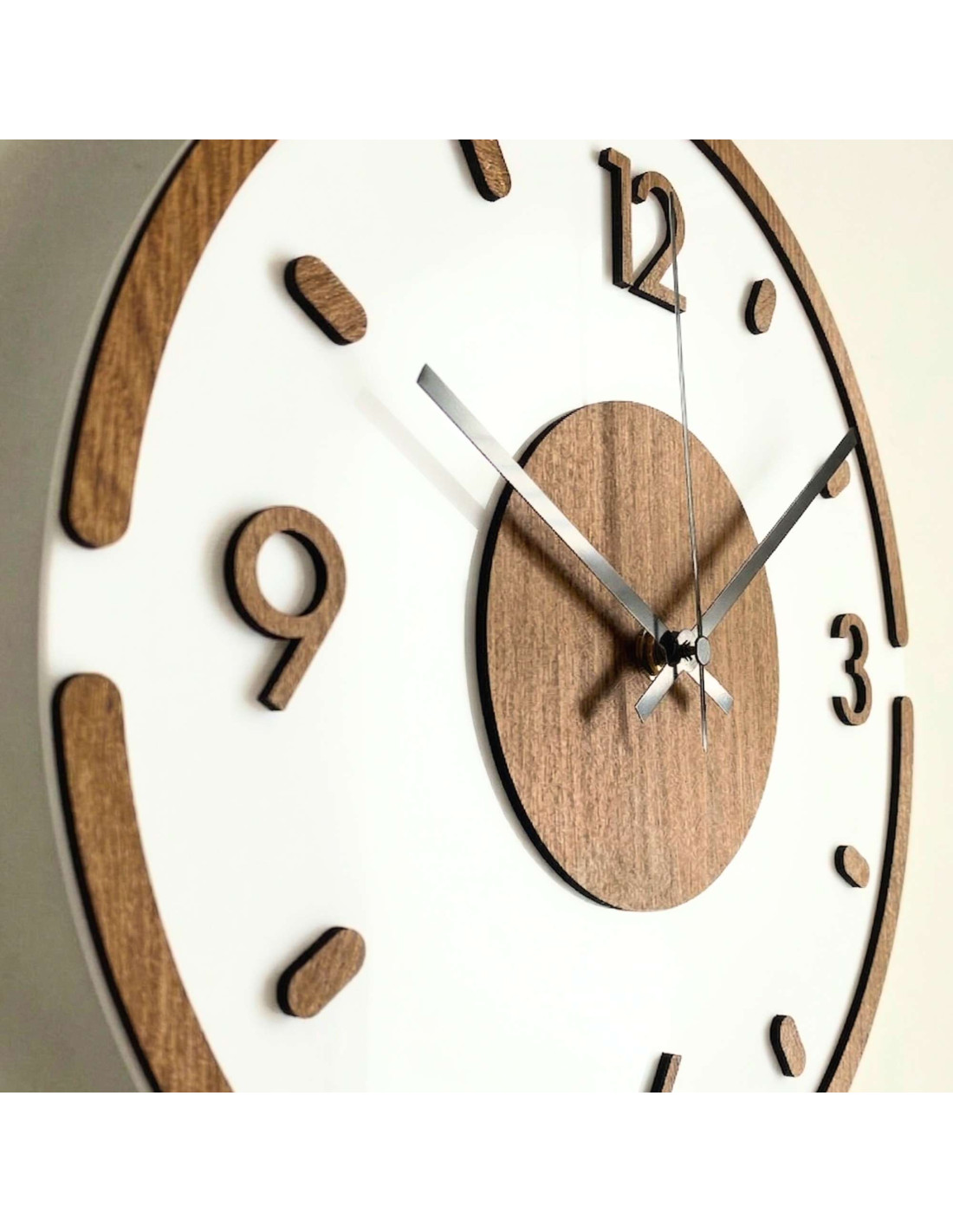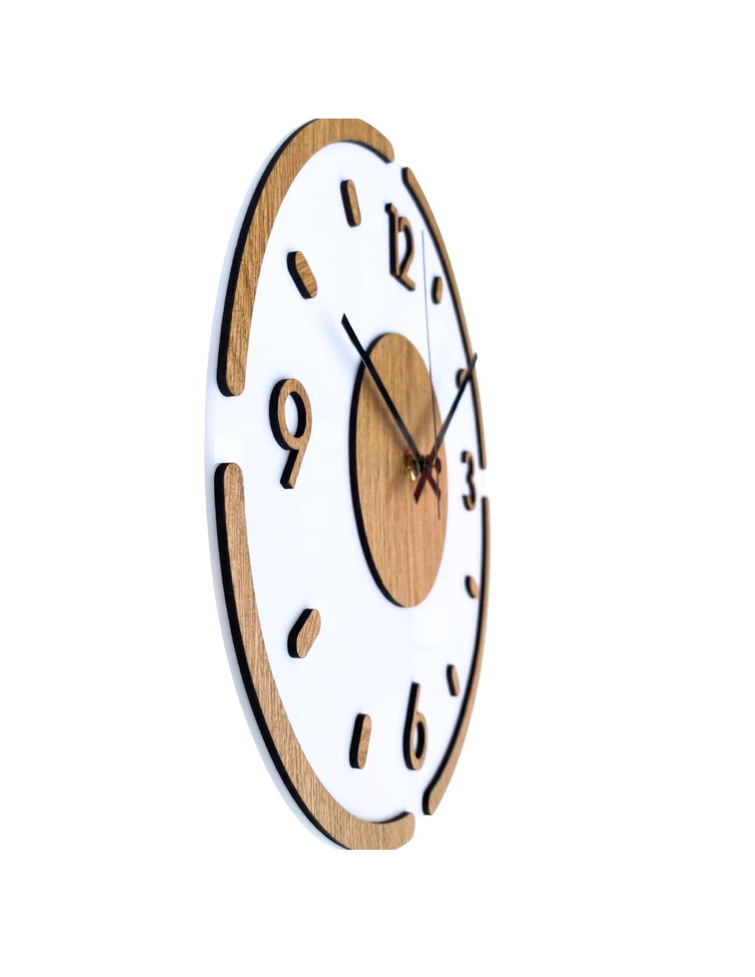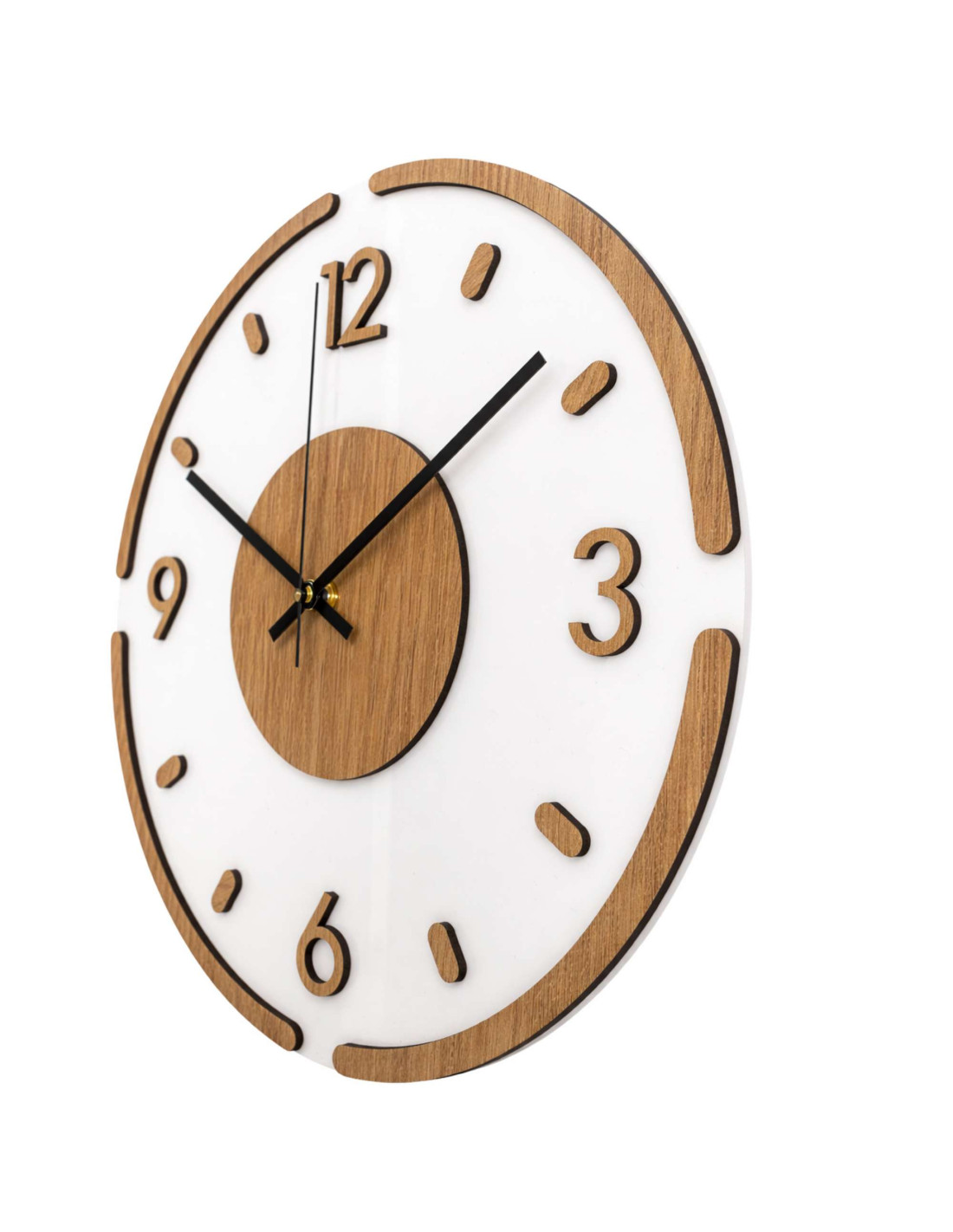 Hodiny sú vyrobené z kvalitnej HDF dosky s dubovým vzorom v kombinácii s lesklým a elegantným bielym plexisklom.