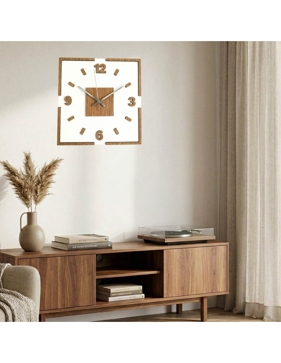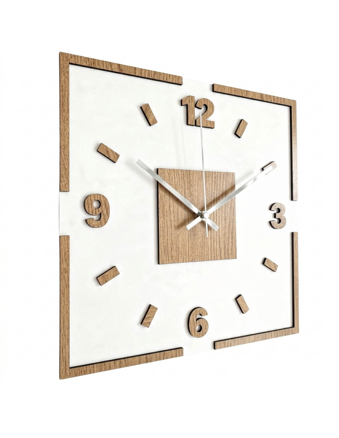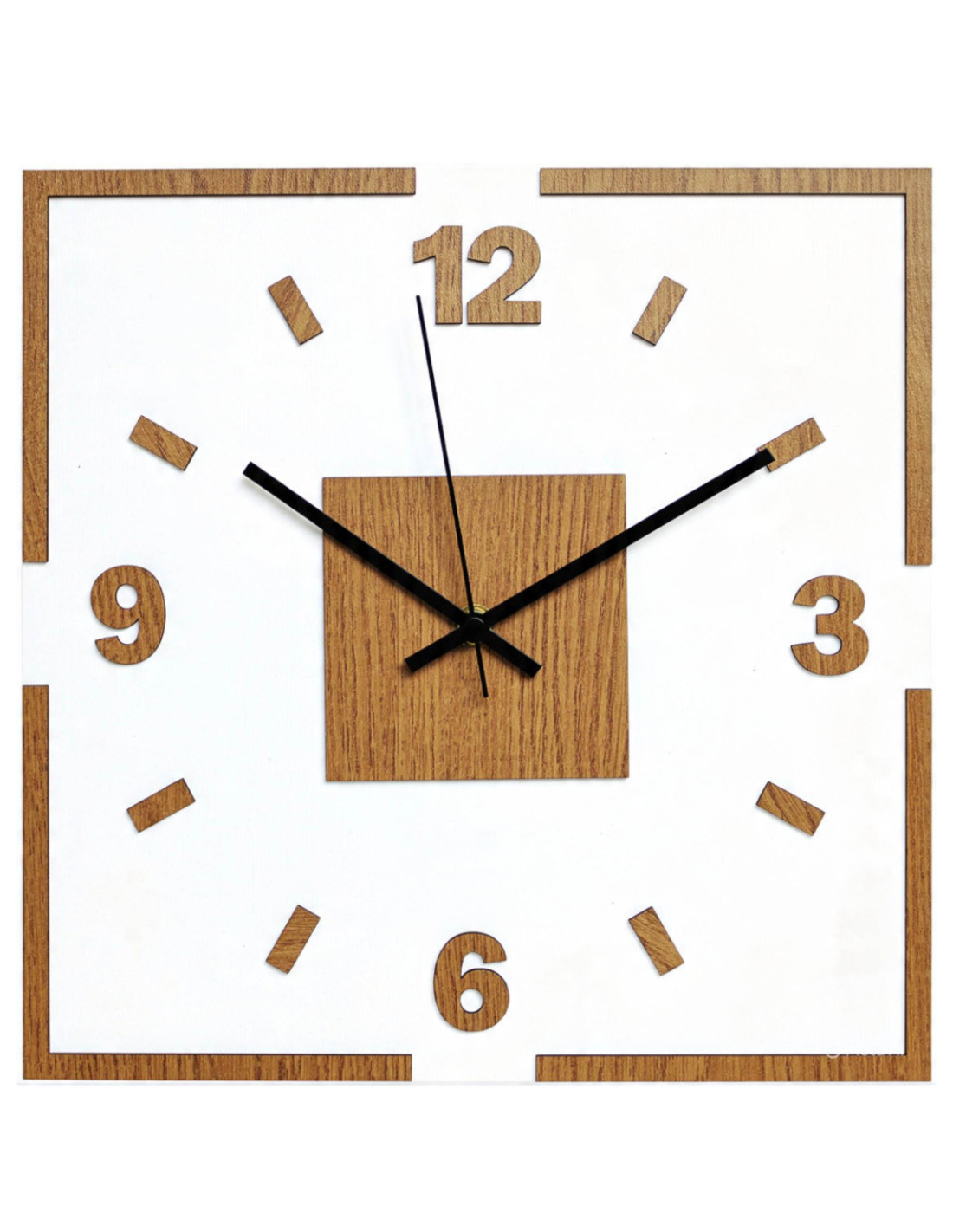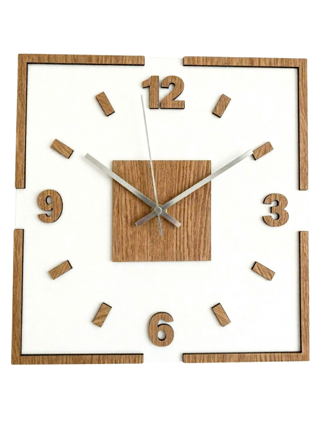 Moderné štvorcové nástenné hodiny s dubovým dekorom a bielym podkladom