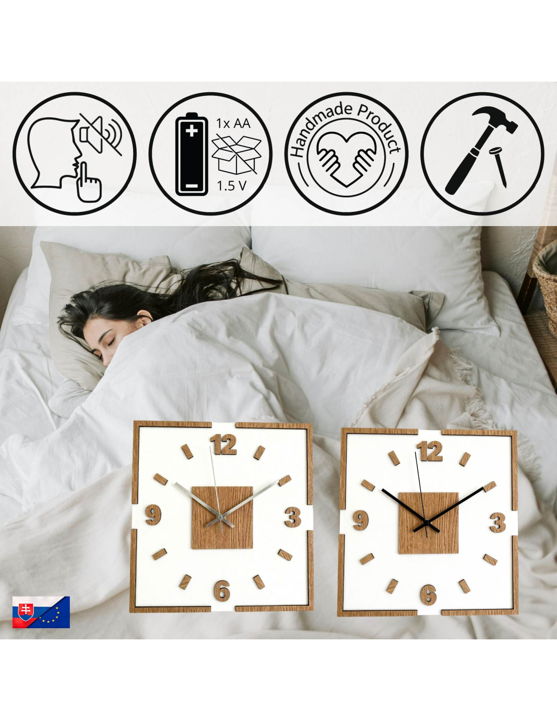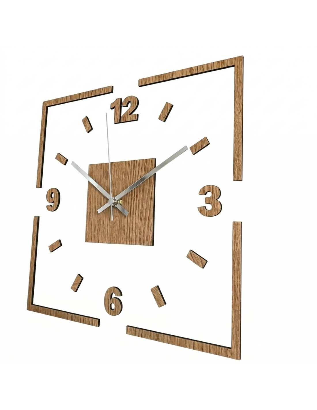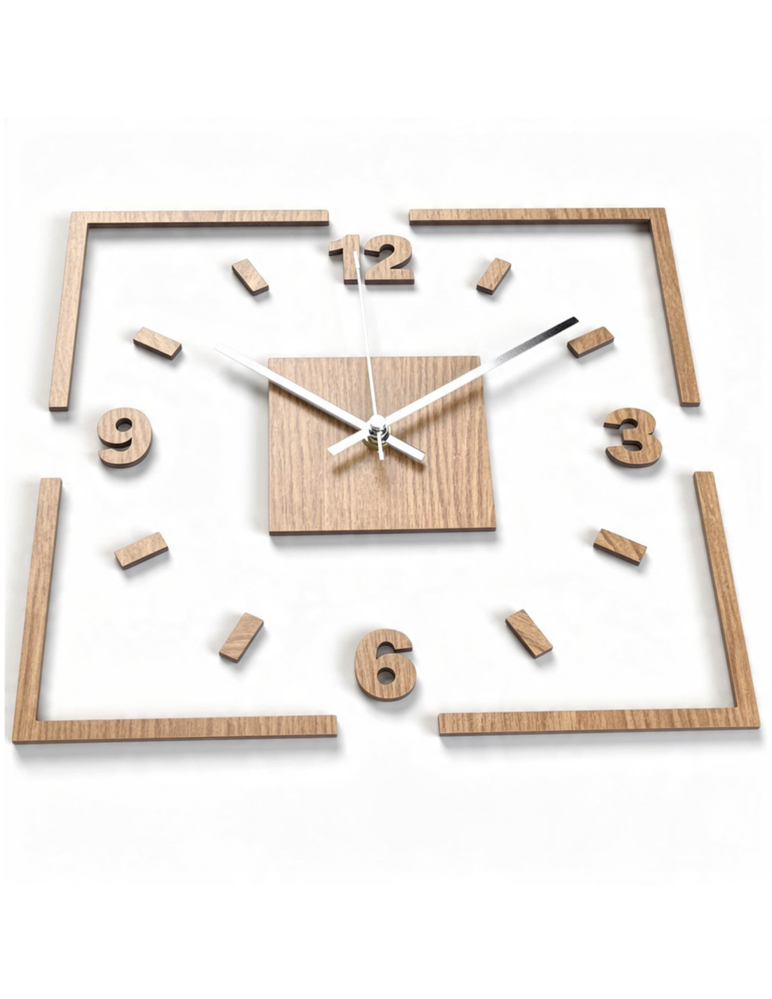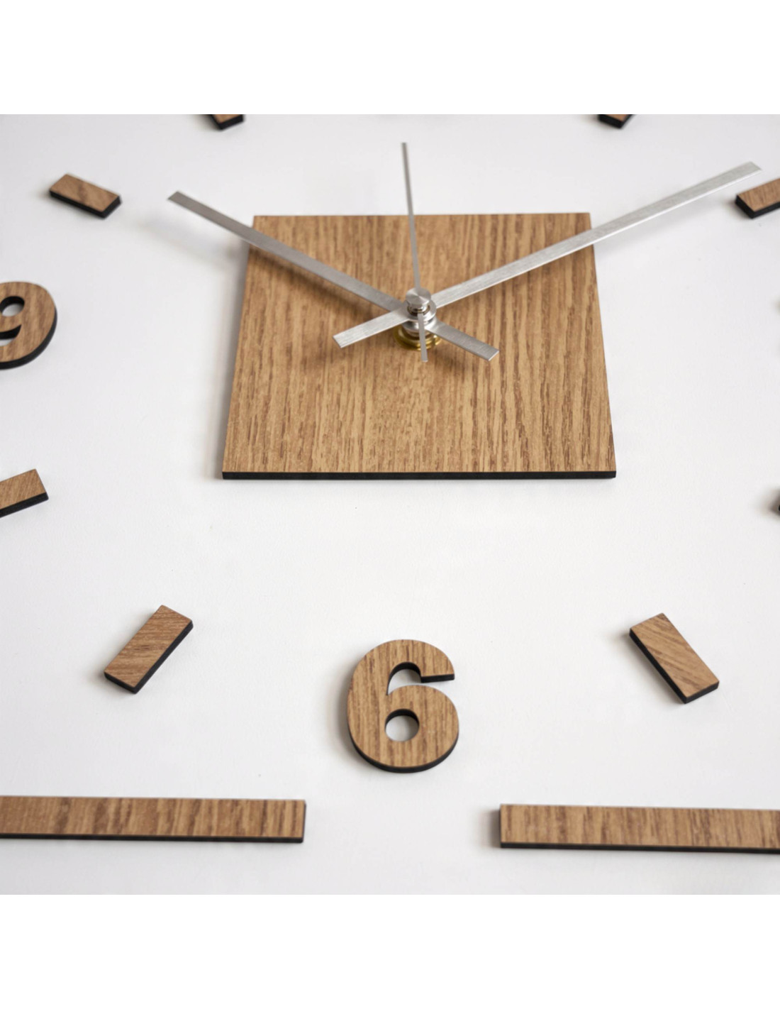 Stred hodín zvýrazňuje dubový štvorec, z ktorého vychádzajú čierne, alebo strieborné ručičky pre dokonalý kontrast a čitateľnosť.