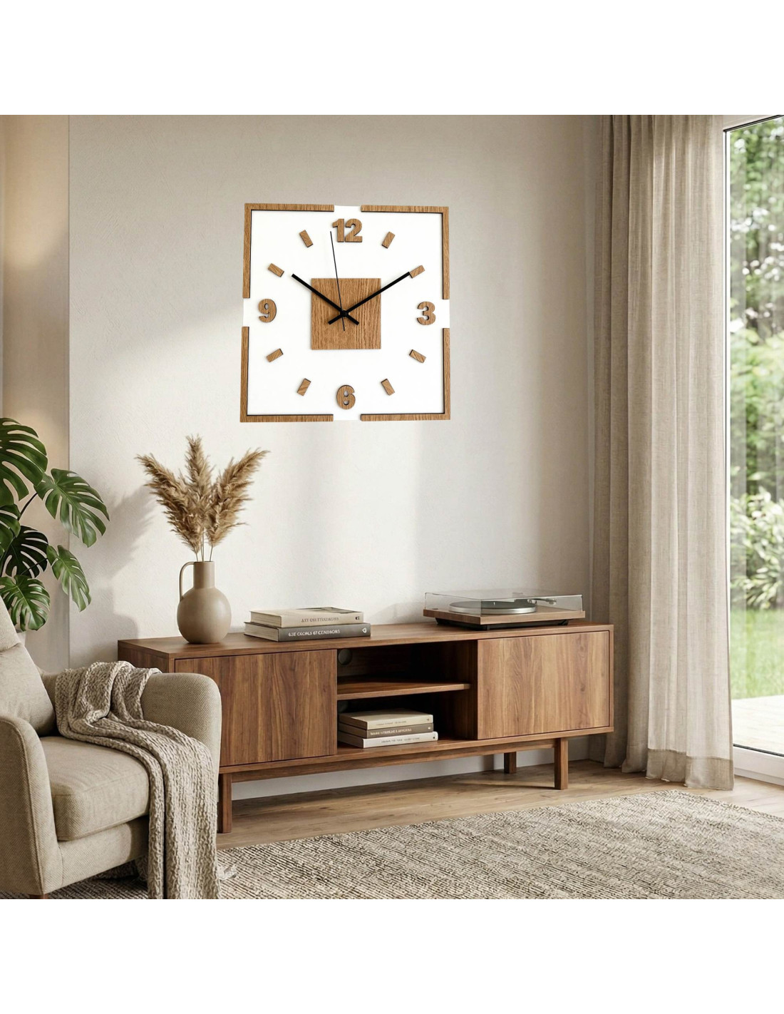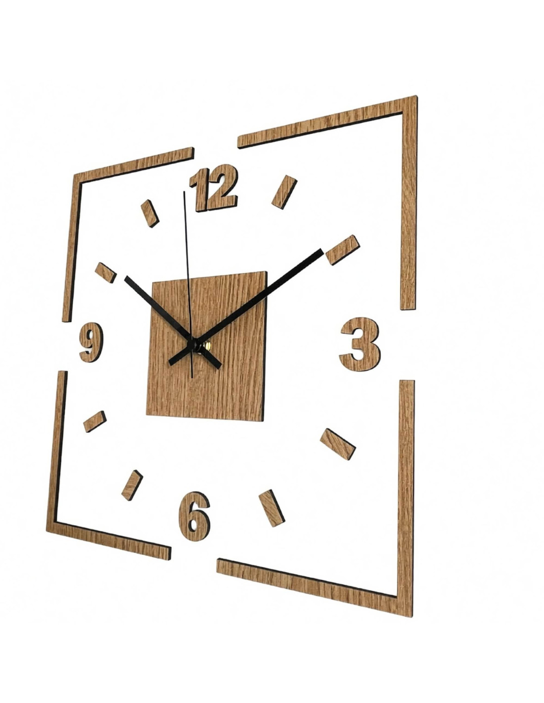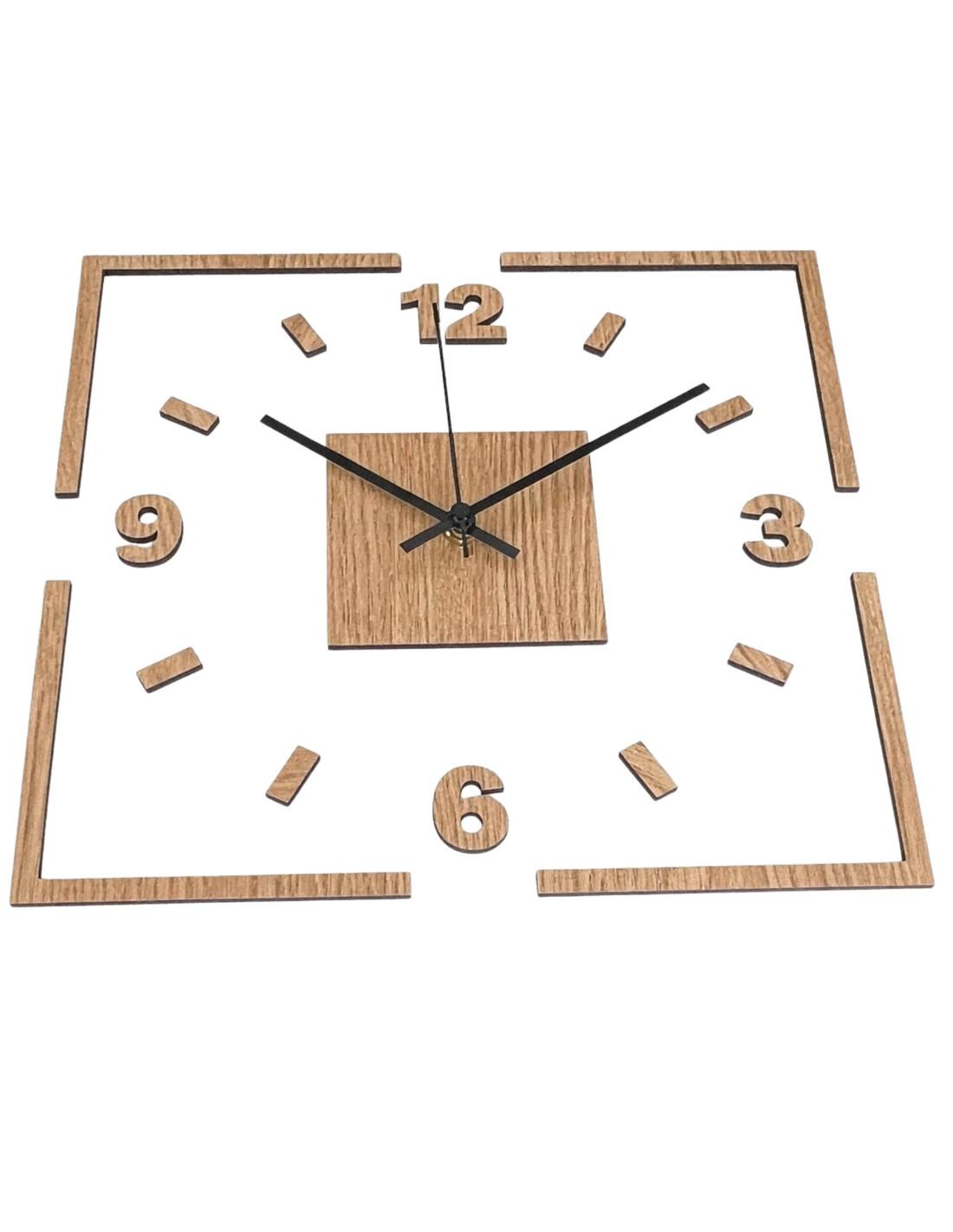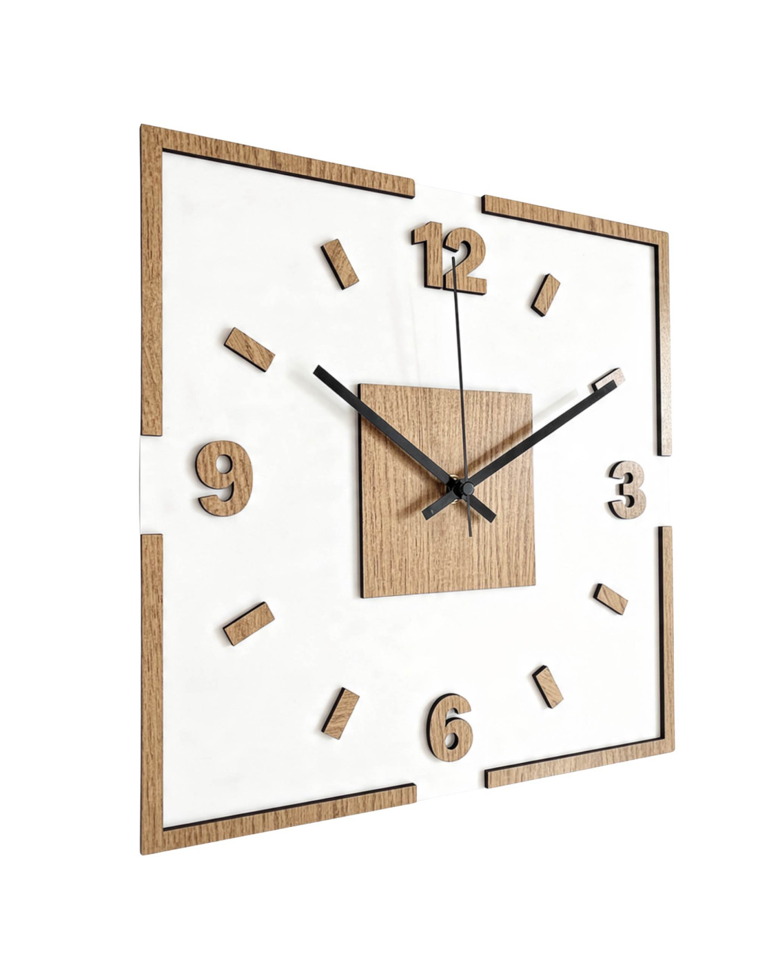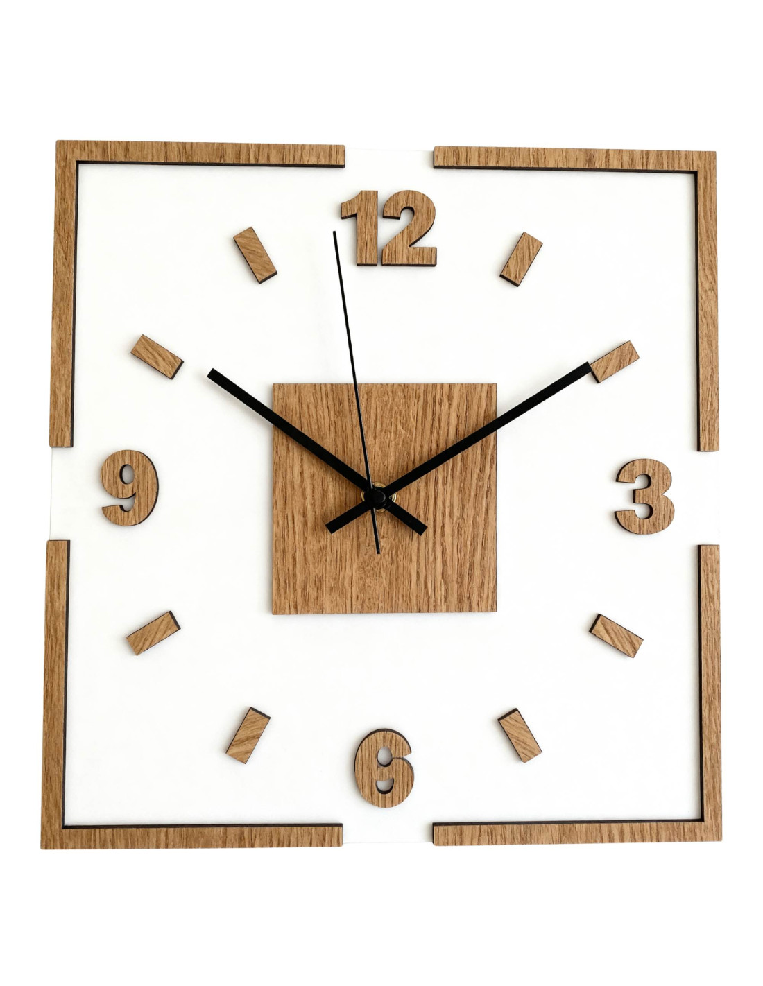 Moderné štvorcové nástenné hodiny s dubovým dekorom a bielym podkladom