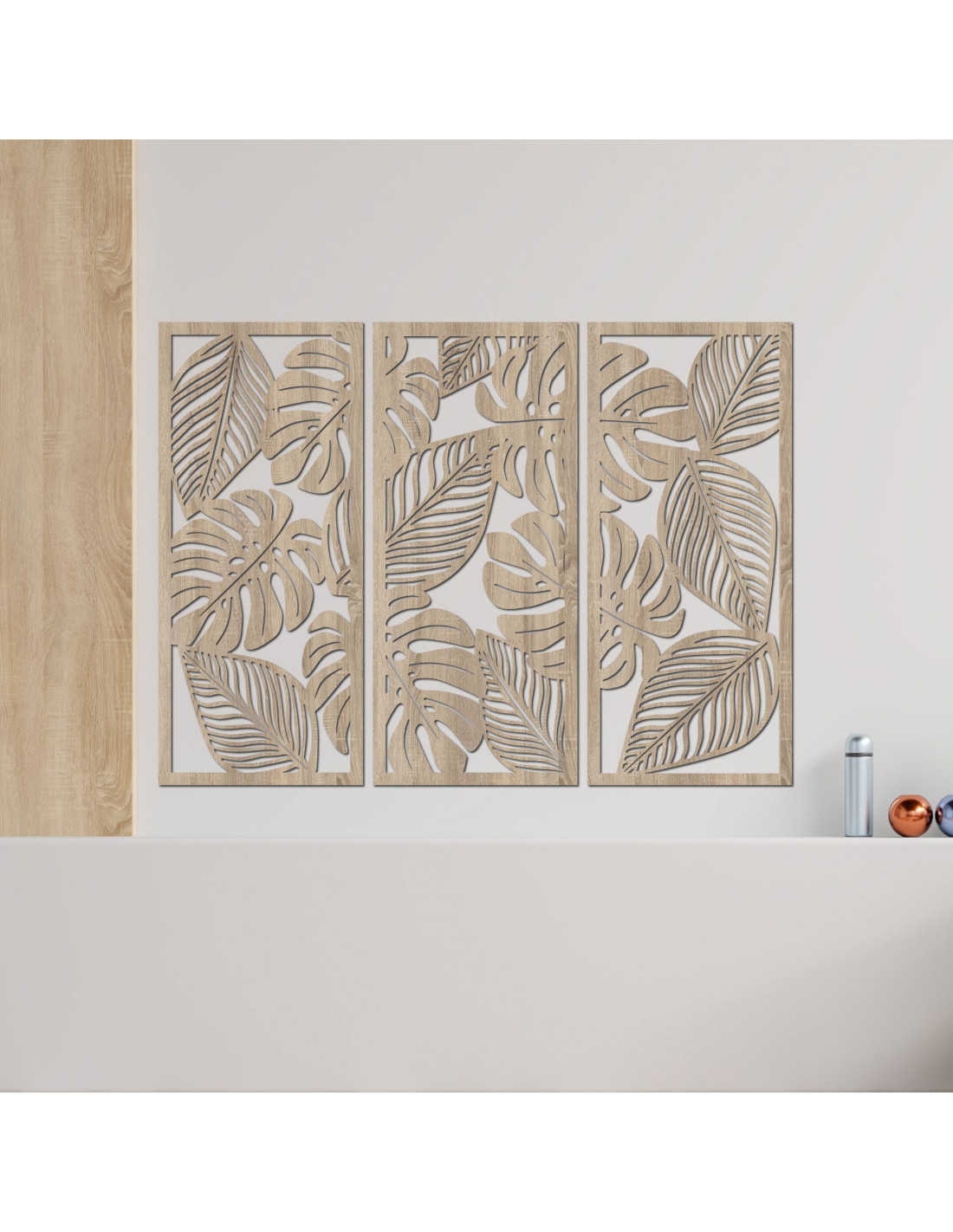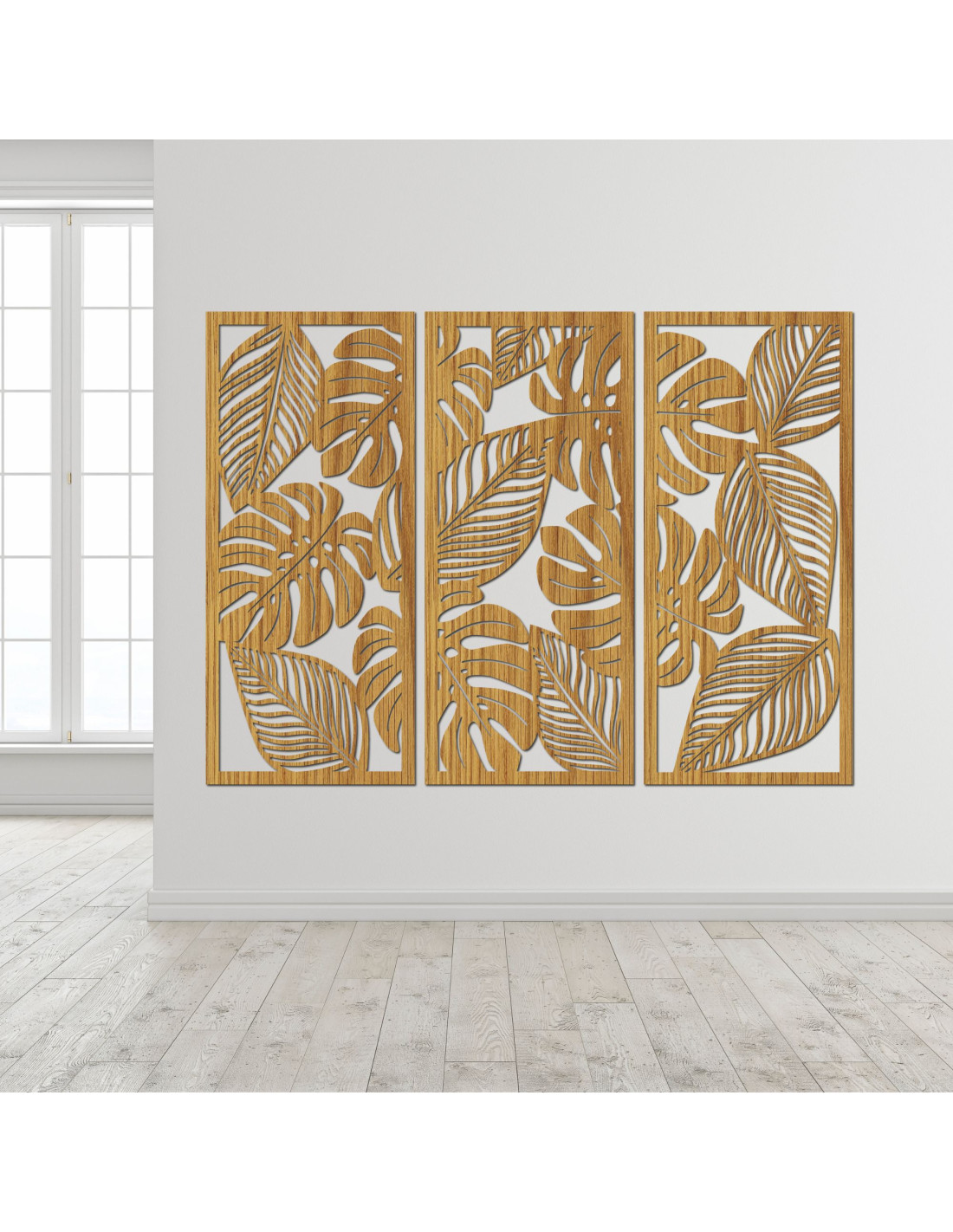 Zažite prírodnú harmóniu s naším trojdielnym dreveným obrazom na stenu Monstera.