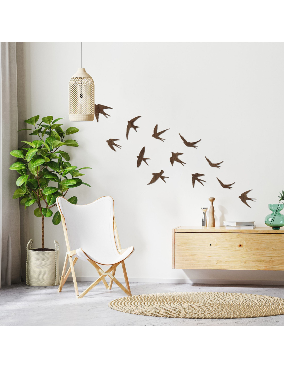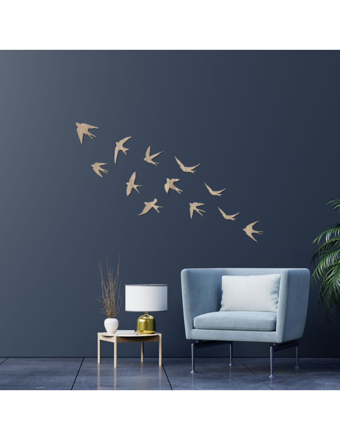 Tento dizajn predstavuje minimalistické drevené dekorácie v tvare lastovičiek v lete.