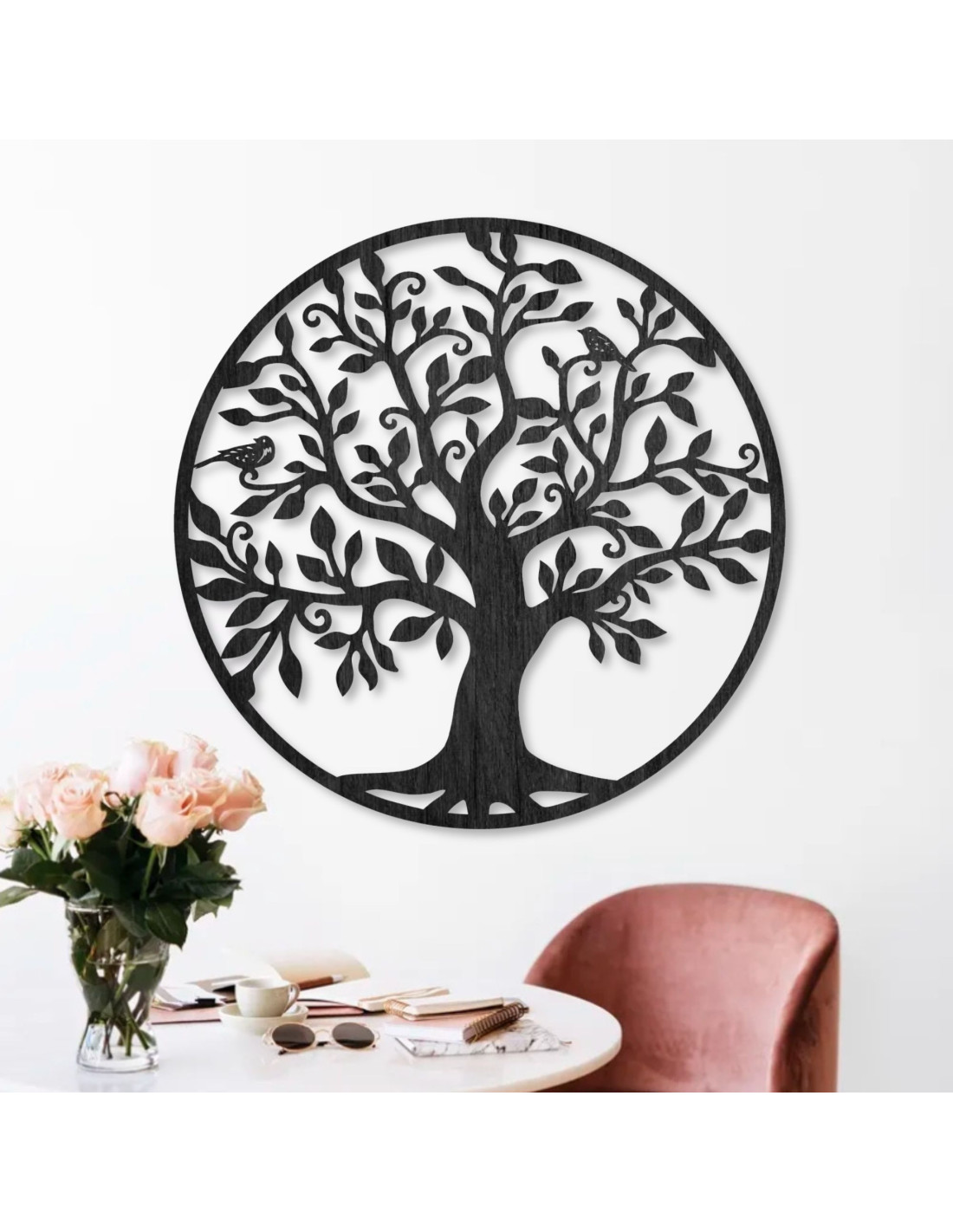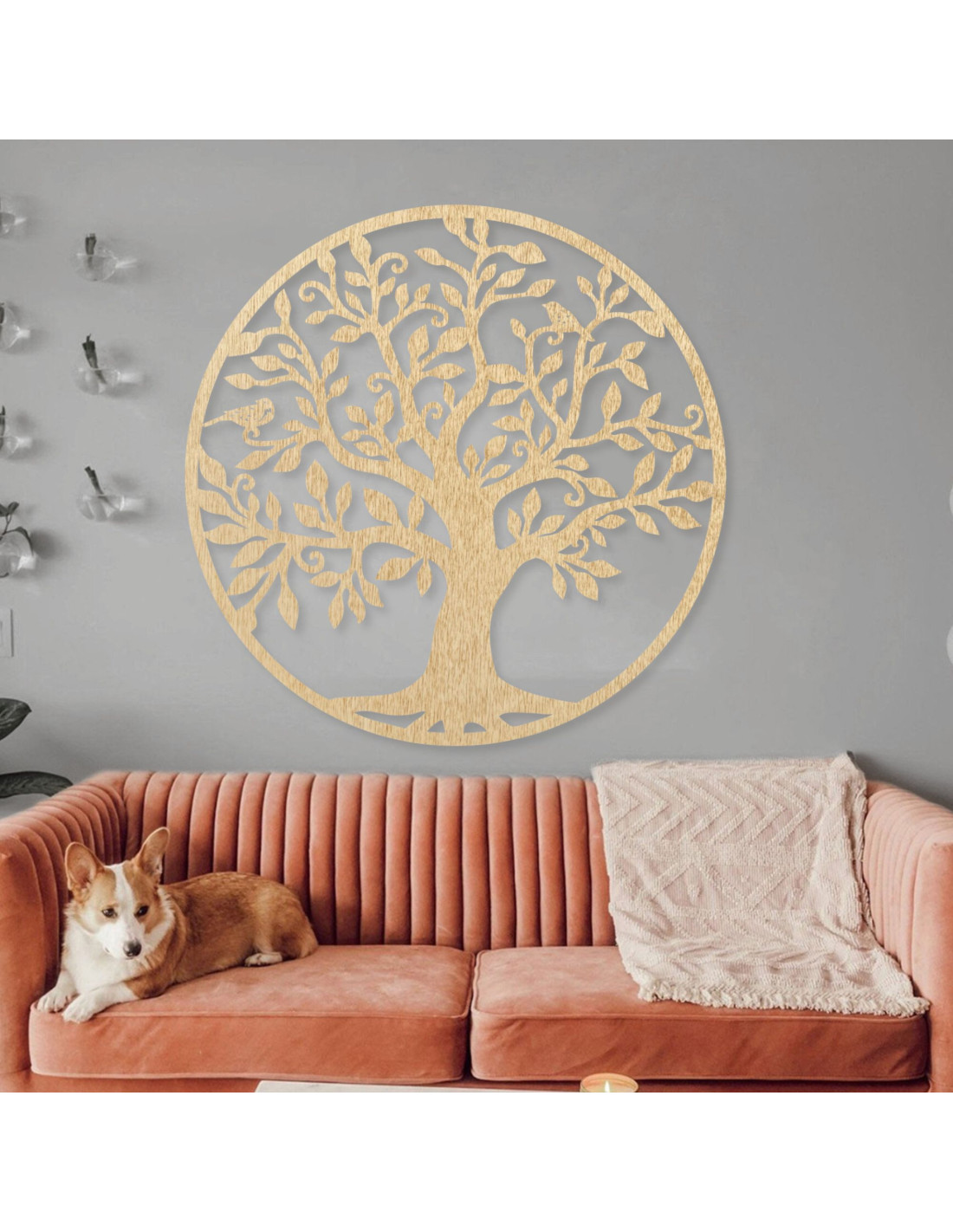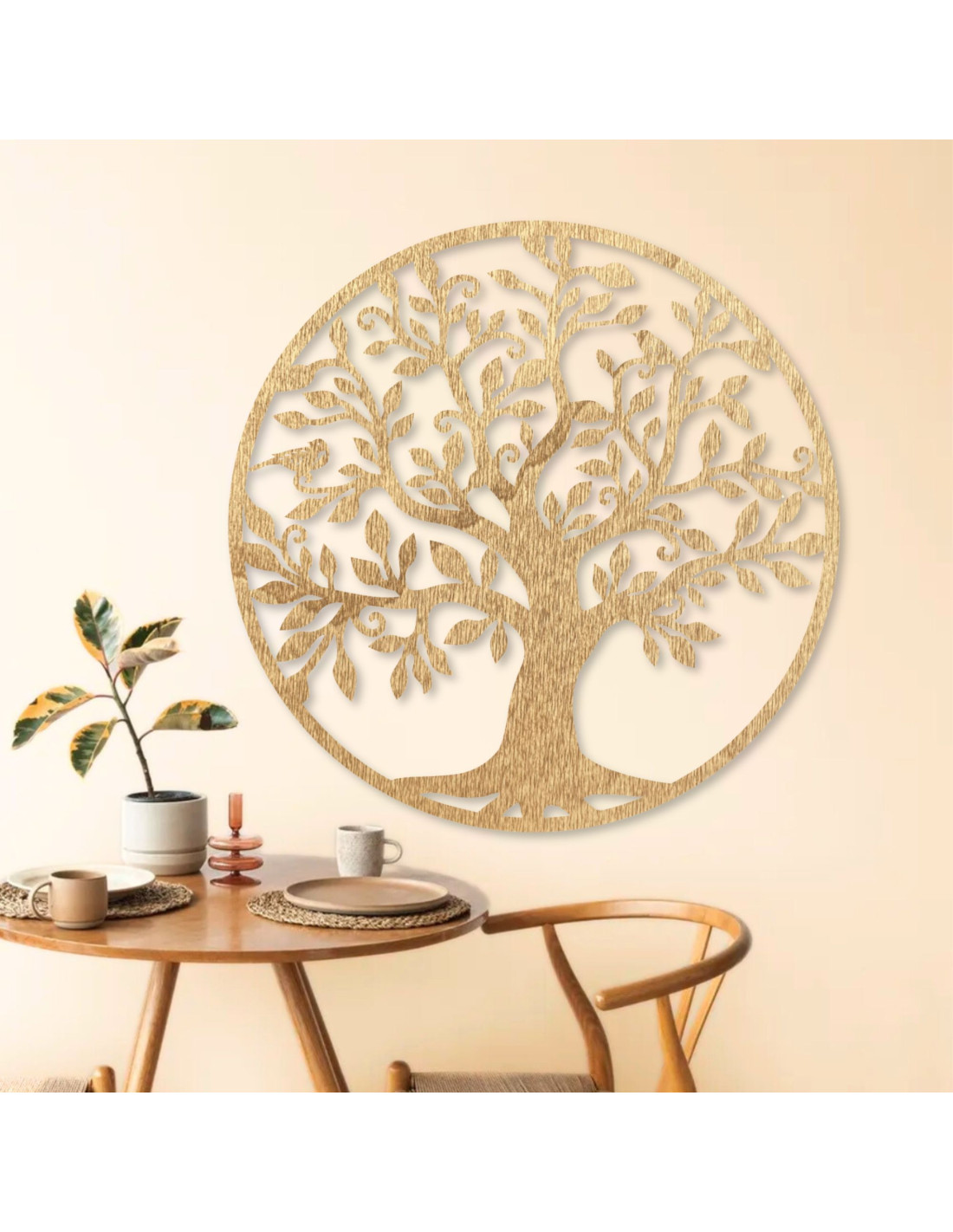 Drevená dekorácia v podobe stromu života je dokonalým spojením prírodného dizajnu a elegantného umenia.