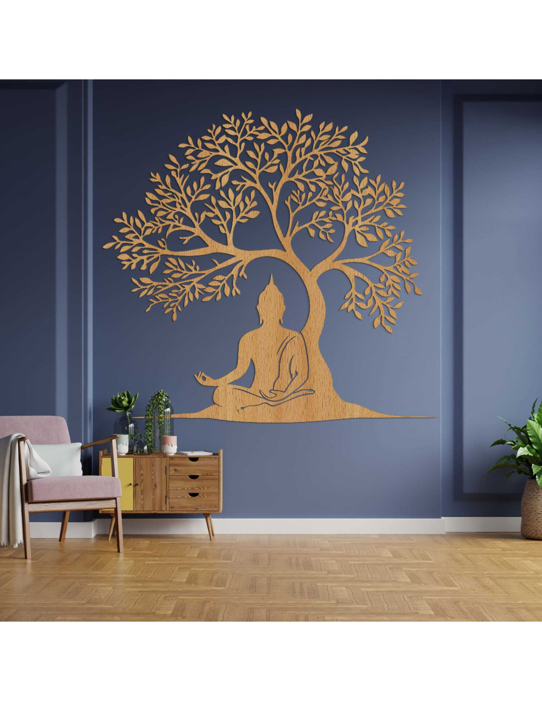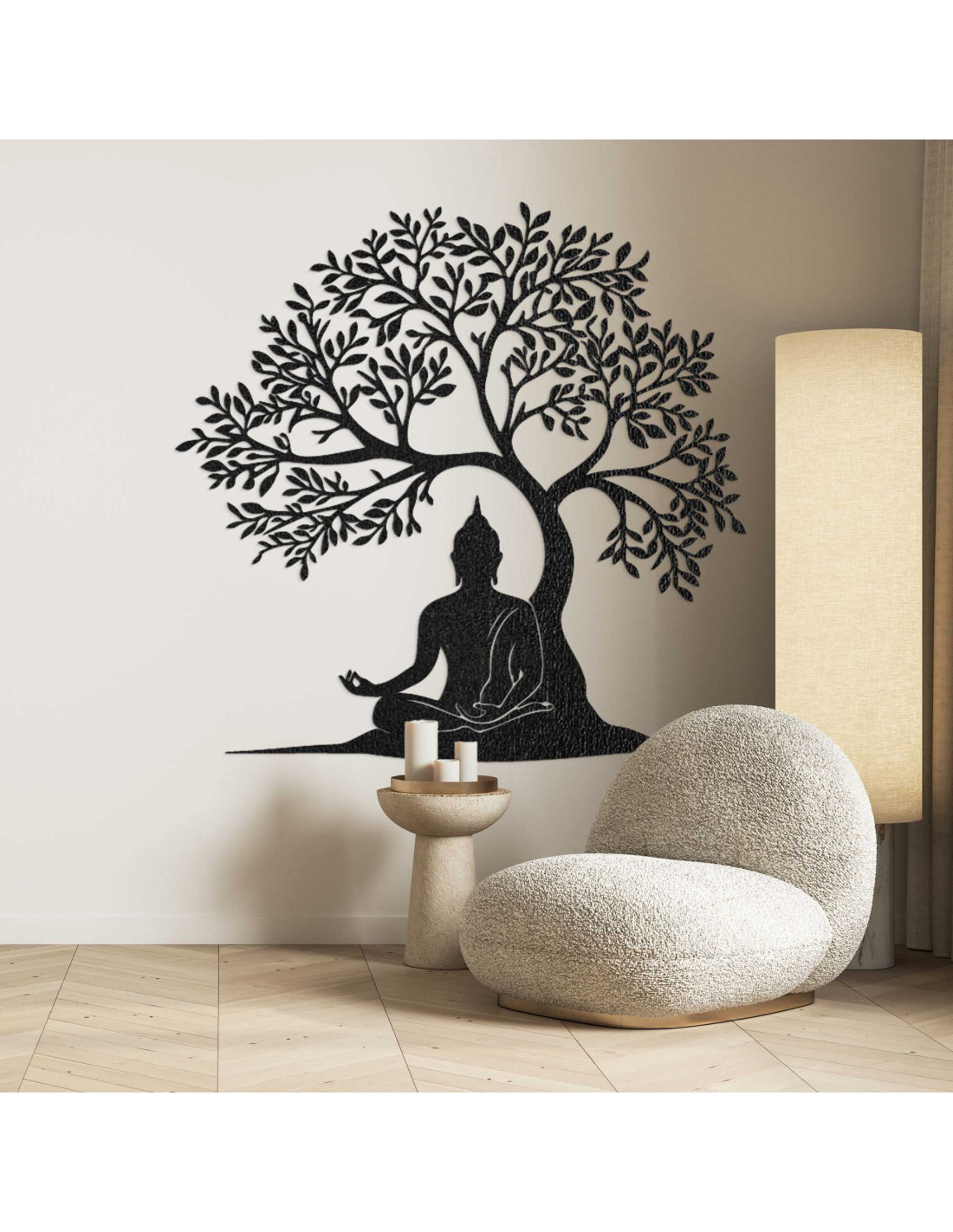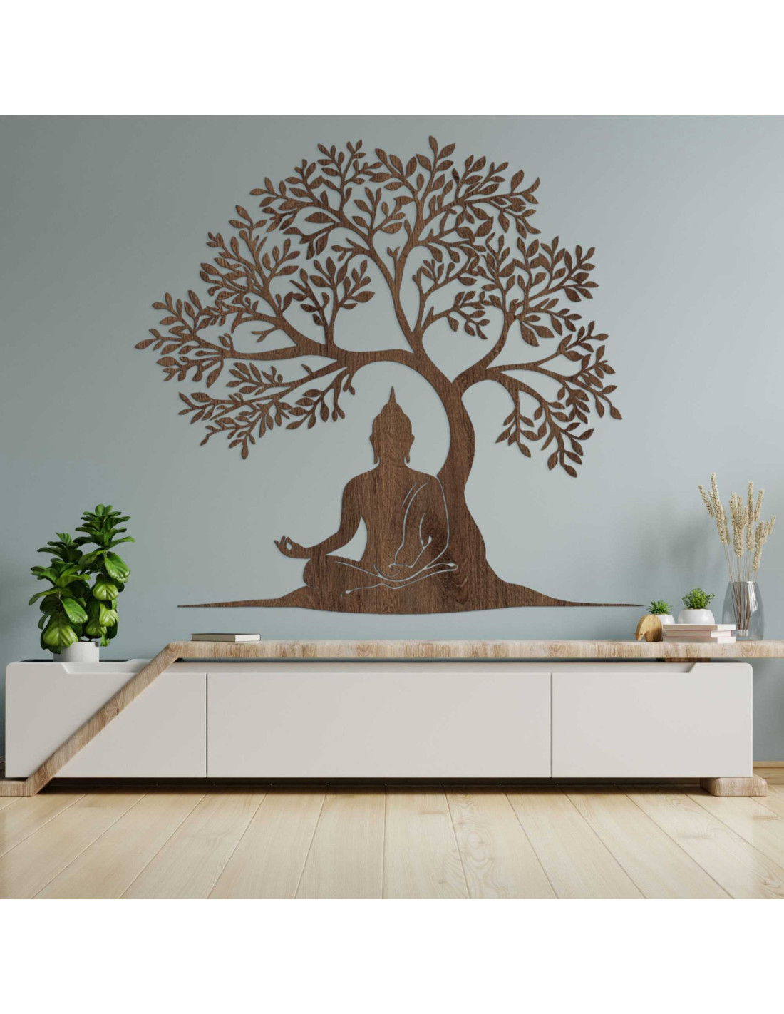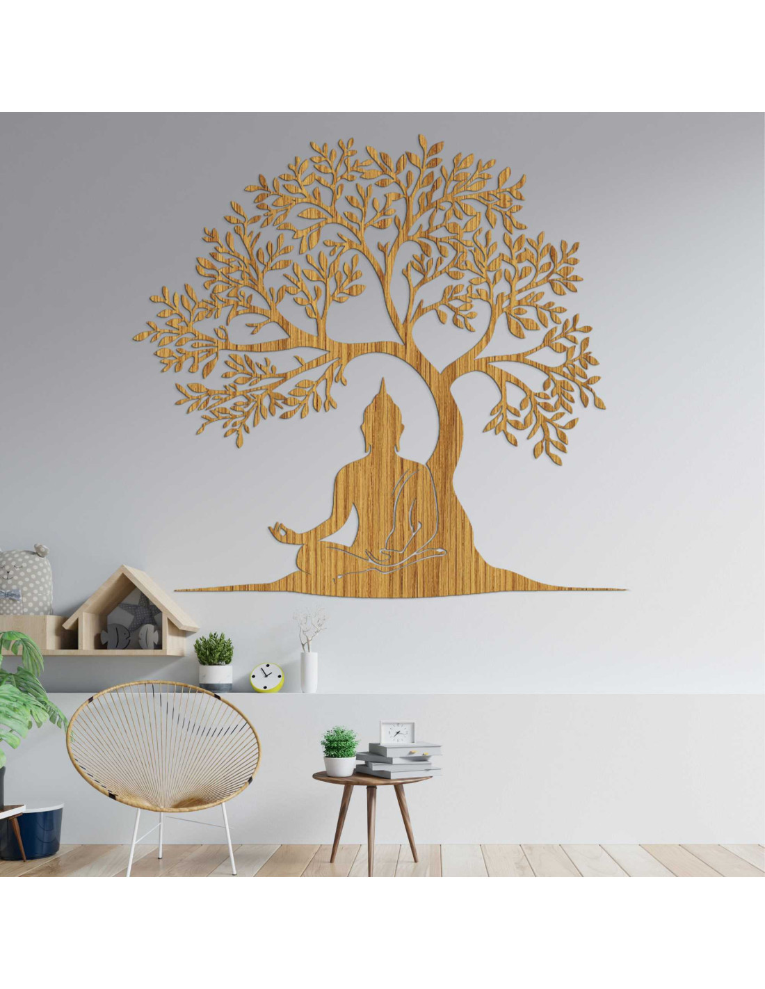Dizajn spája posolstvo múdrosti a prírodnej harmónie do jednej výtvarnej kompozície. Buddha v lotosovej polohe pod stromom symbolizuje dosiahnutie osvietenia. Dekorácia je navrhnutá tak, aby vytvárala emocionálnu atmosféru bez použitia slov. Každý prvok má svoj účel a odkaz, ktorý pôsobí dlhšie ako bežný pohľad.