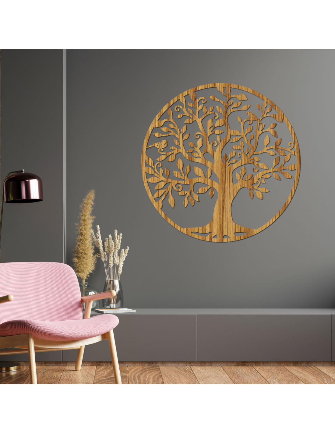 Symbolický strom života v drevenom prevedení dodáva domovu nádych prírody a duchovnej rovnováhy.