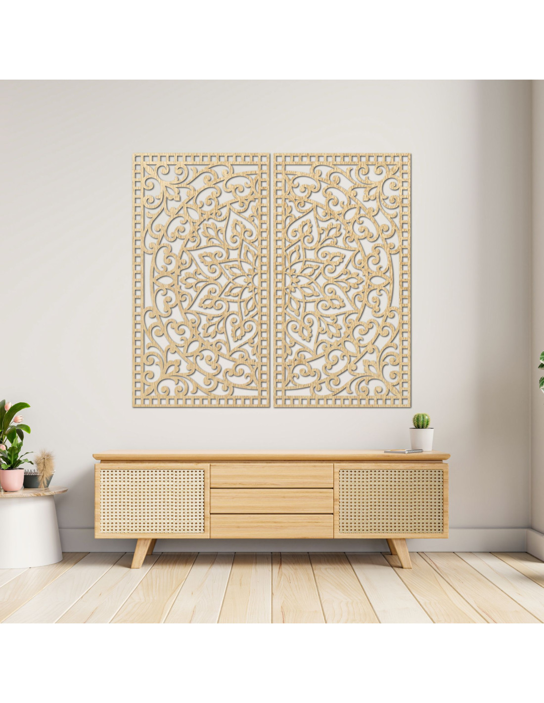 Drevená 3D Mandala na stenu – Vyrezávaný diptych v boho štýle