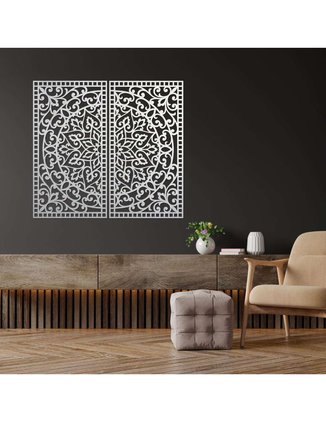 Elegantná drevená dekorácia s jemnými ornamentálnymi prvkami spája klasické vzory s moderným prevedením. Symetrický dizajn s dôrazom na detail vytvára pocit harmónie a rovnováhy. Táto dekorácia je dokonalým spôsobom, ako dodať priestoru jedinečný umelecký prvok. Vďaka precíznemu vyrezávaniu vyniknú aj najmenšie detaily.