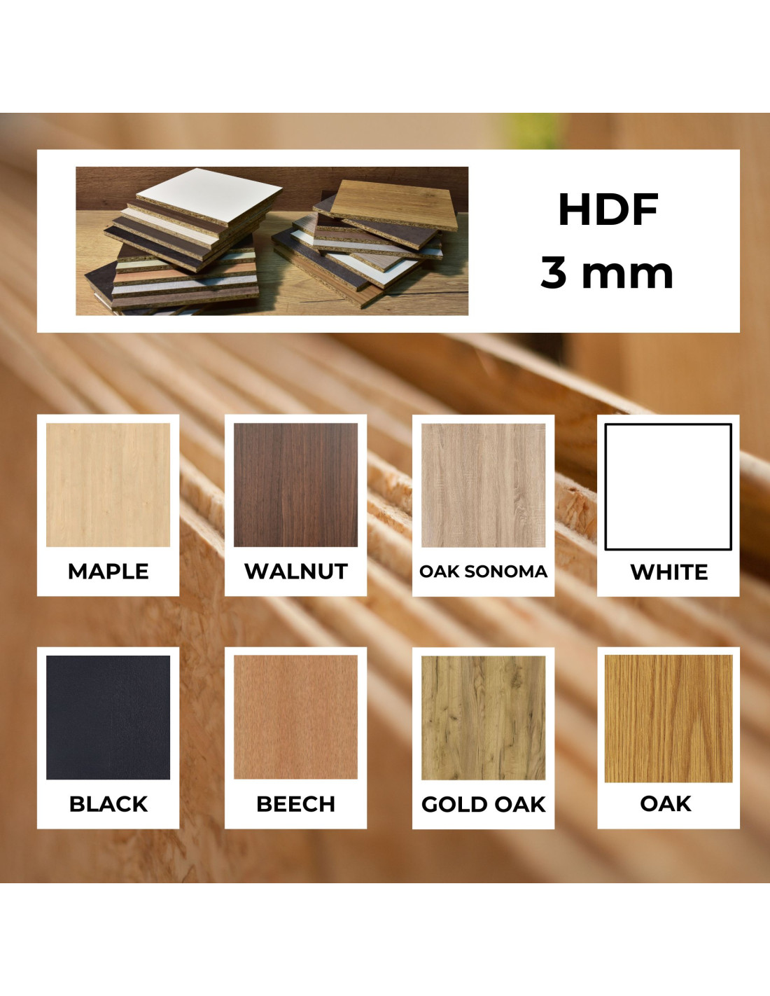 - HDF (Drevovláknitá doska s vysokou hustotou)